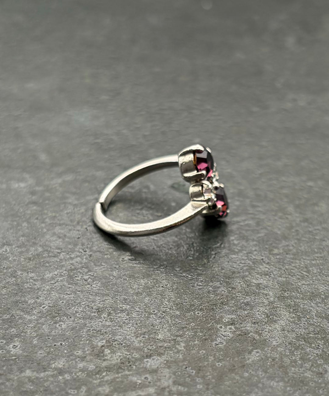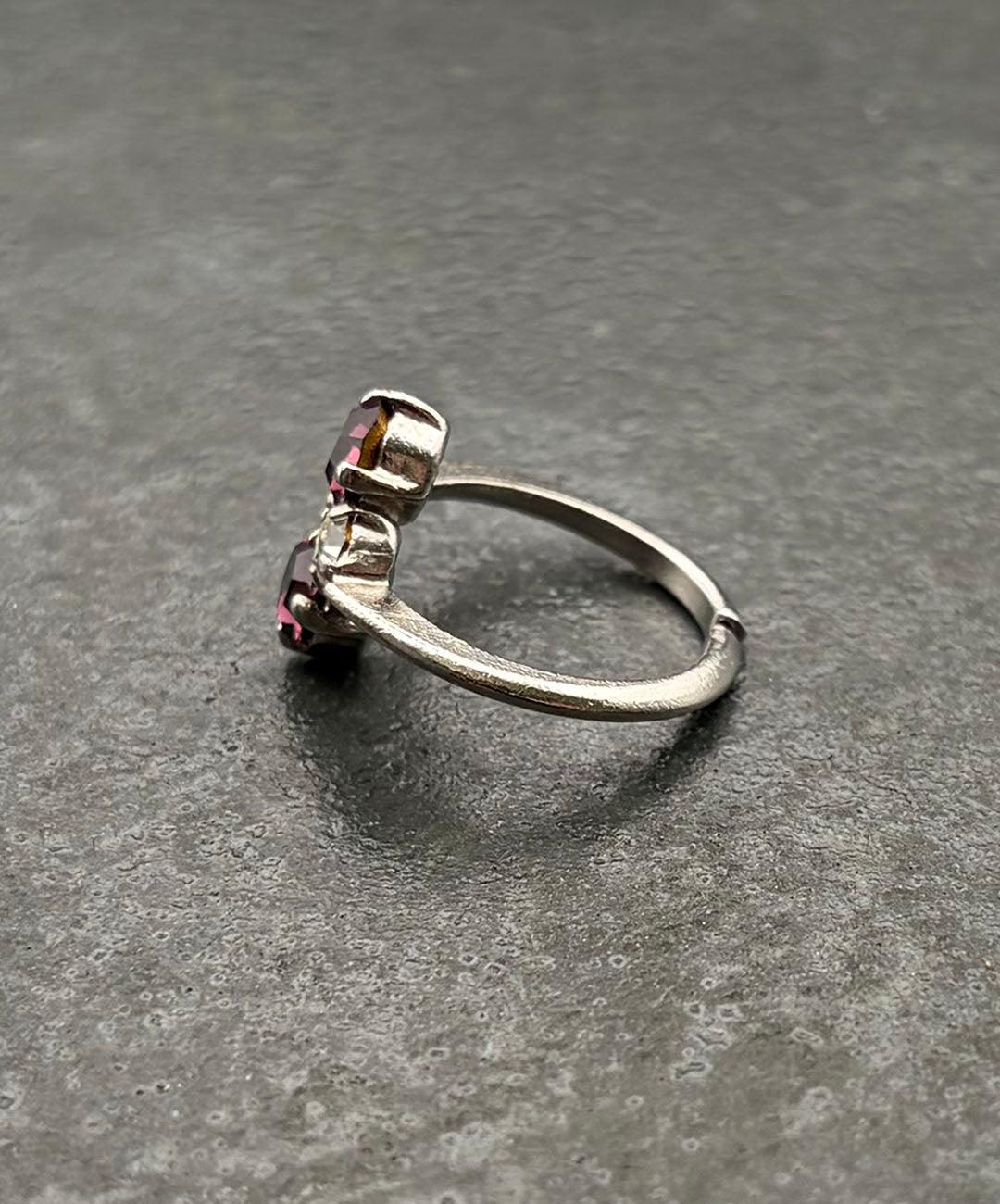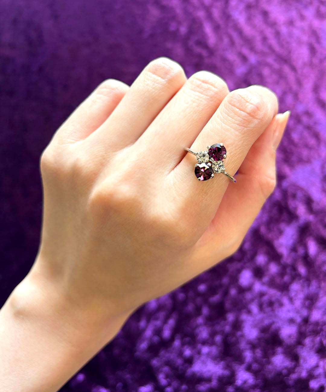 スリムなシルバートーンのリングアームに、ラウンドカットのパープルガラス、クリアガラスが美しい配置で爪留めされています。
