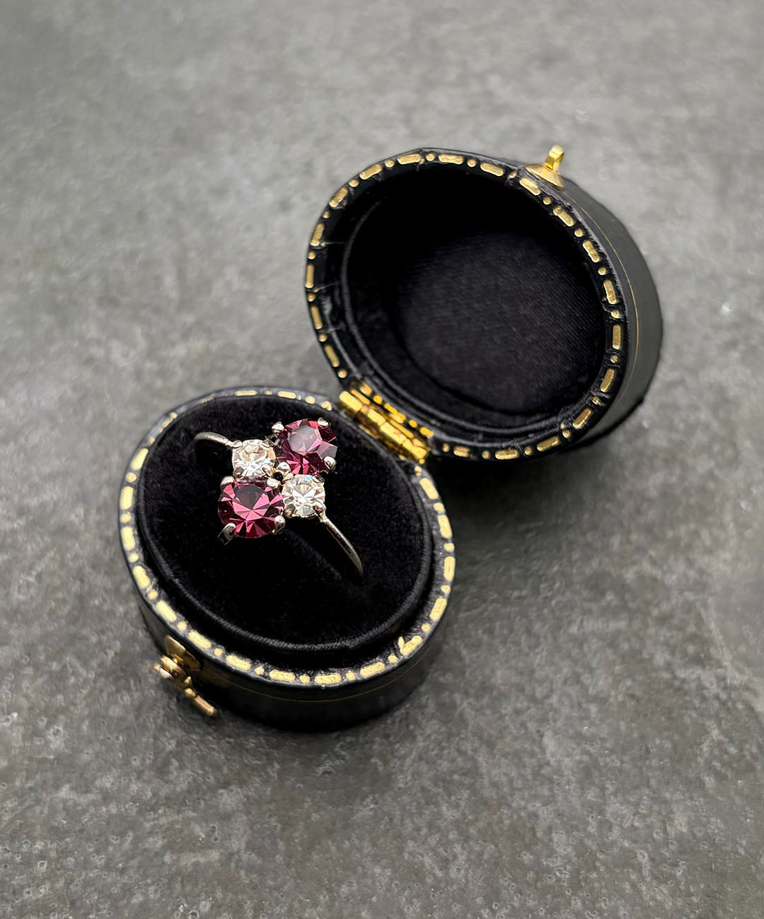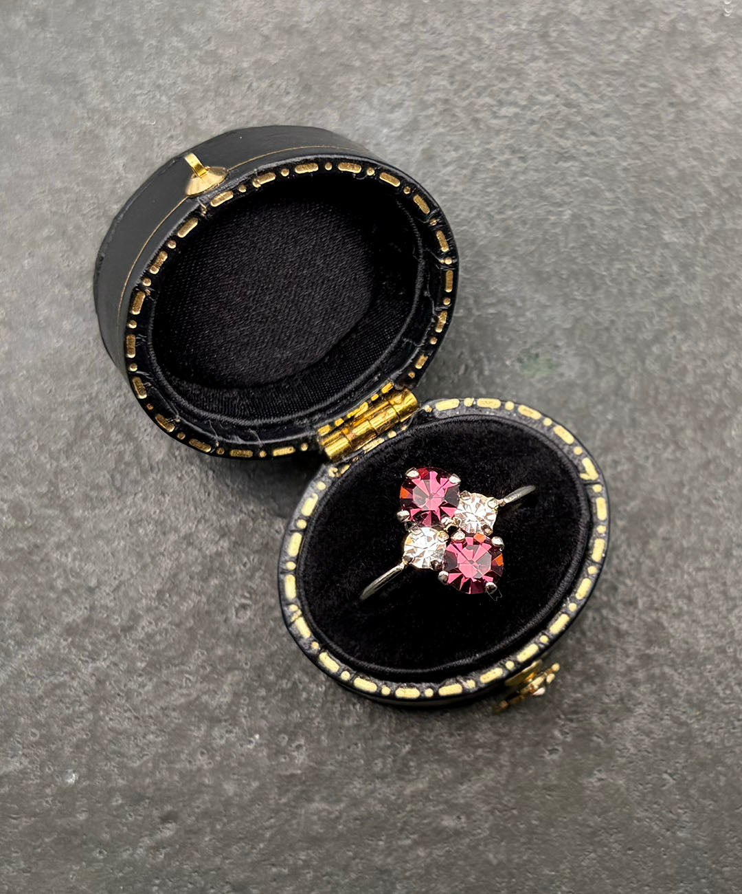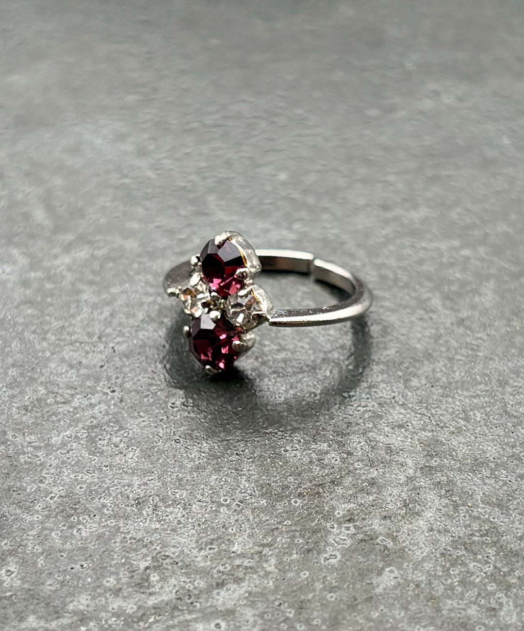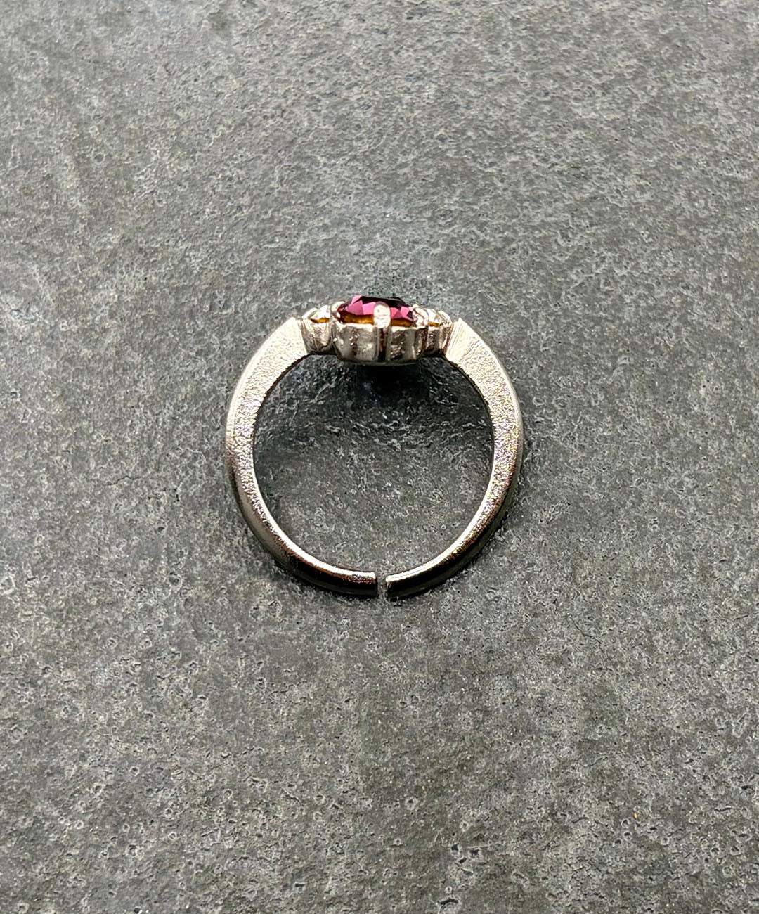 スリムなシルバートーンのリングアームに、ラウンドカットのパープルガラス、クリアガラスが美しい配置で爪留めされています。