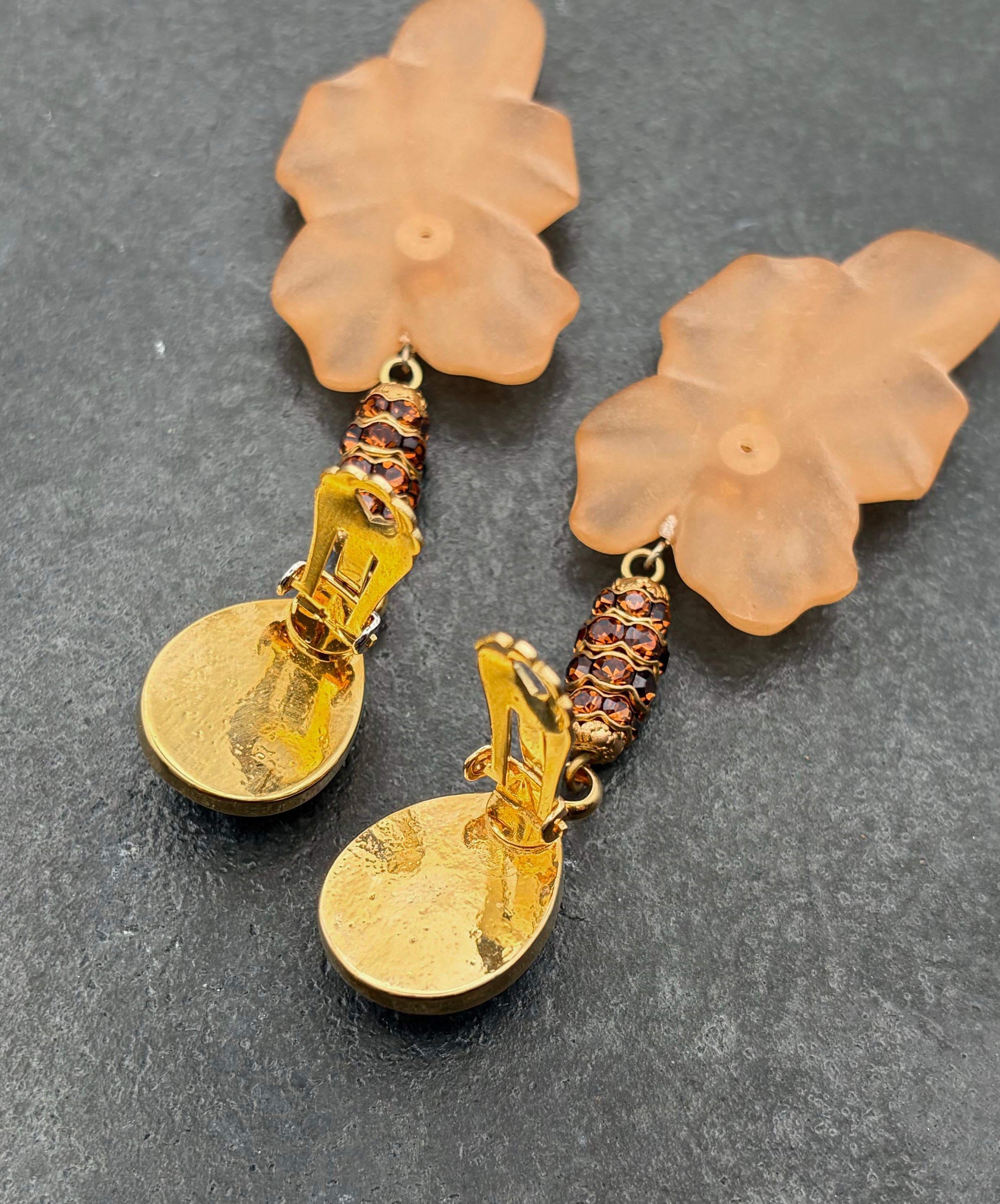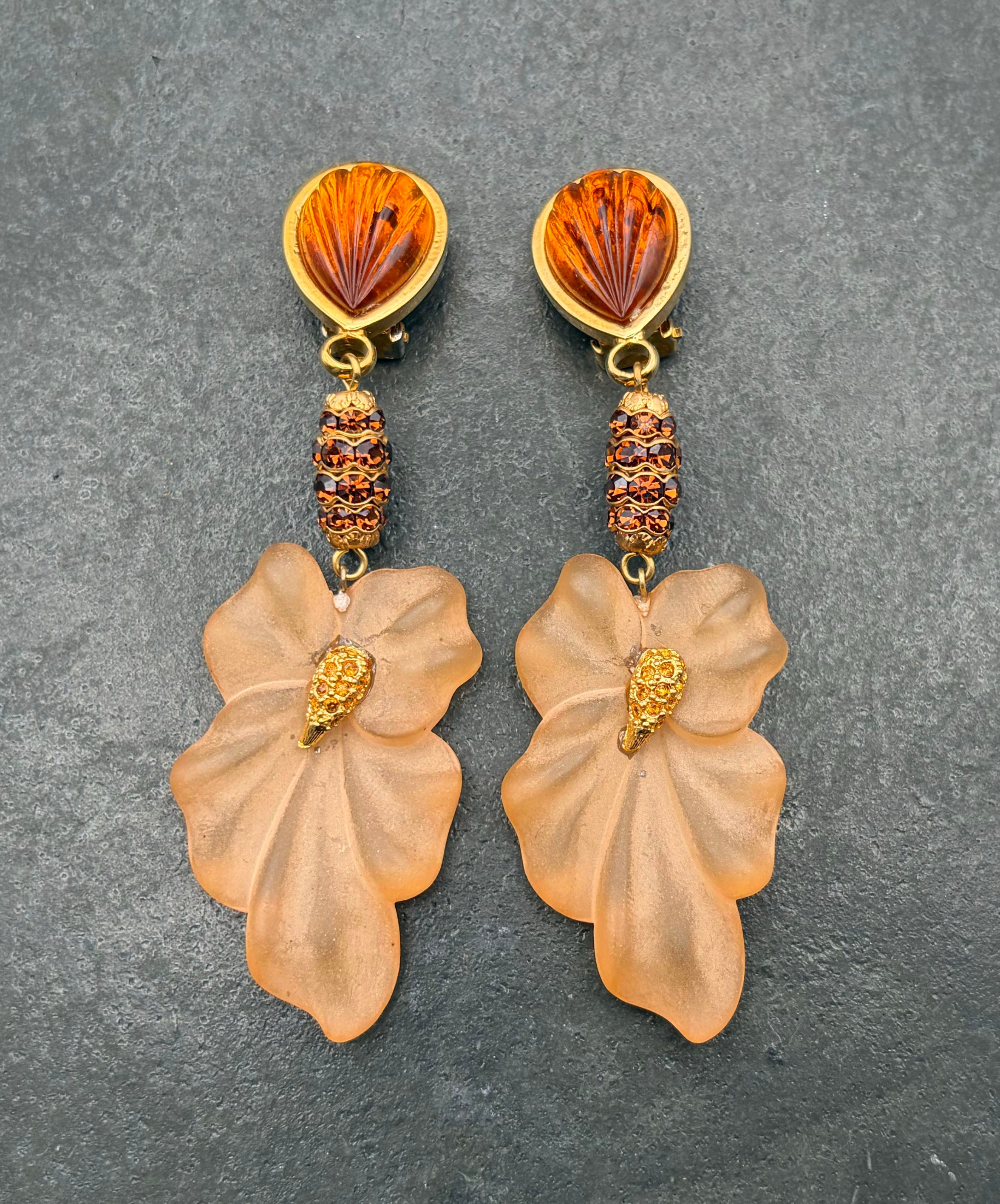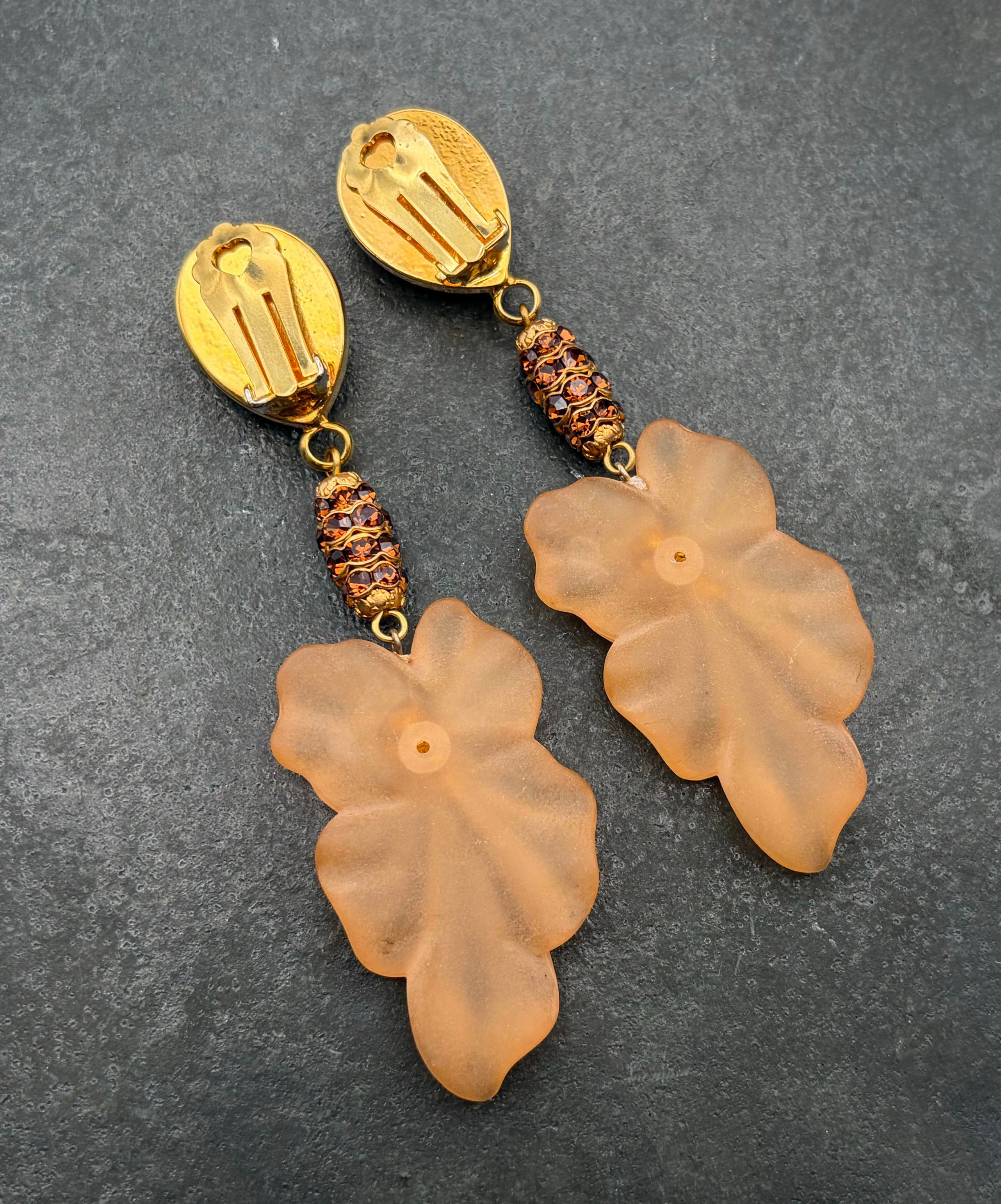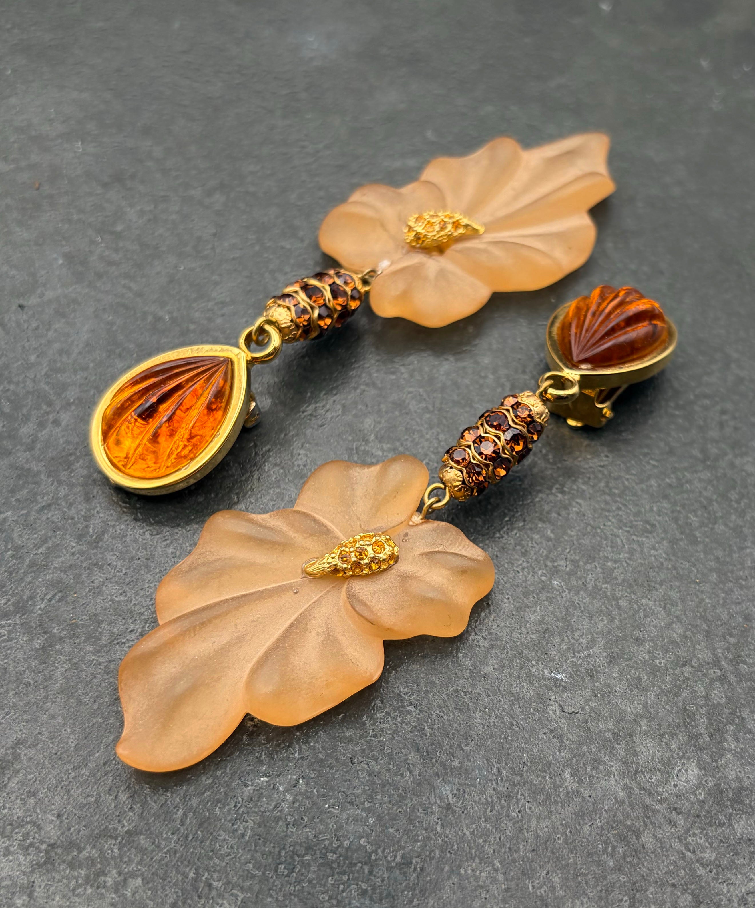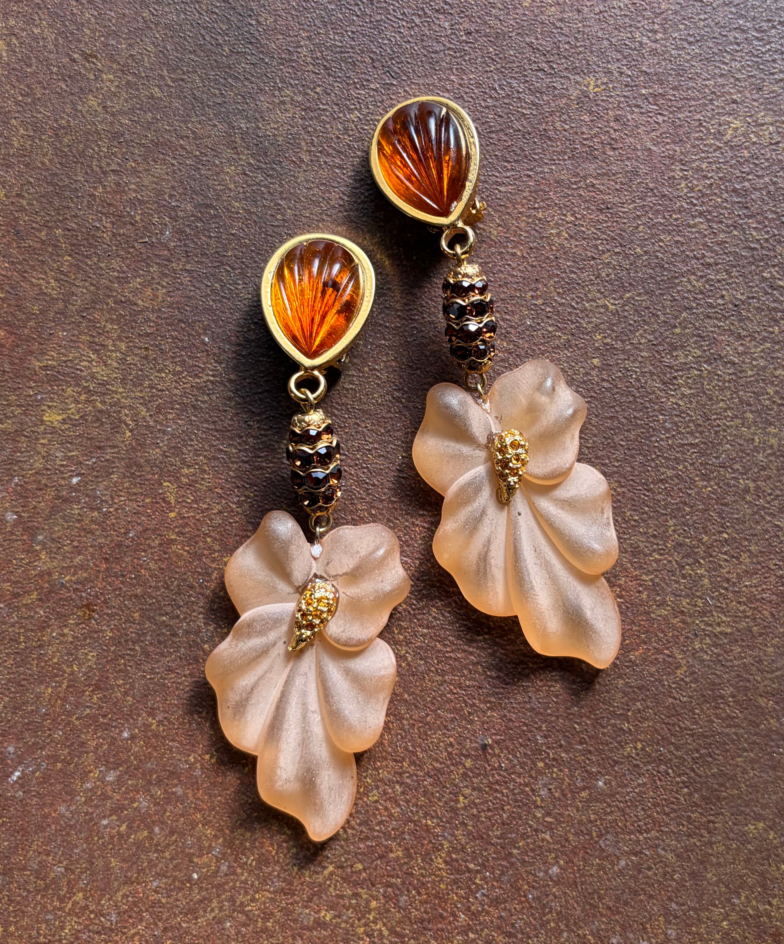 ゴールドトーンメタルにアンバーブラウンのペアシェイプガラスがセットされており、ブラウンのラインストーンがぐるりと敷き詰められた装飾メタル、フロストガラスのフラワーモチーフが垂れ下がり揺らめくデザイン。