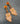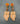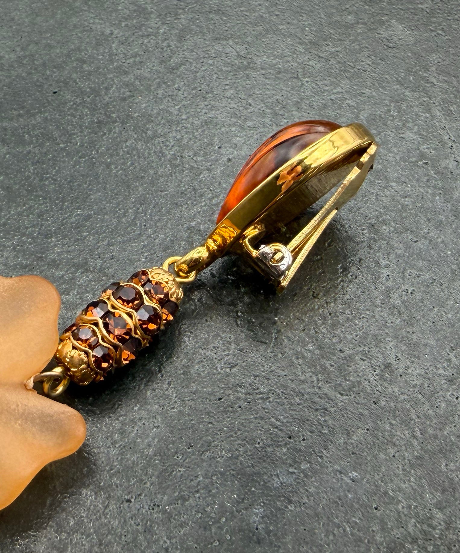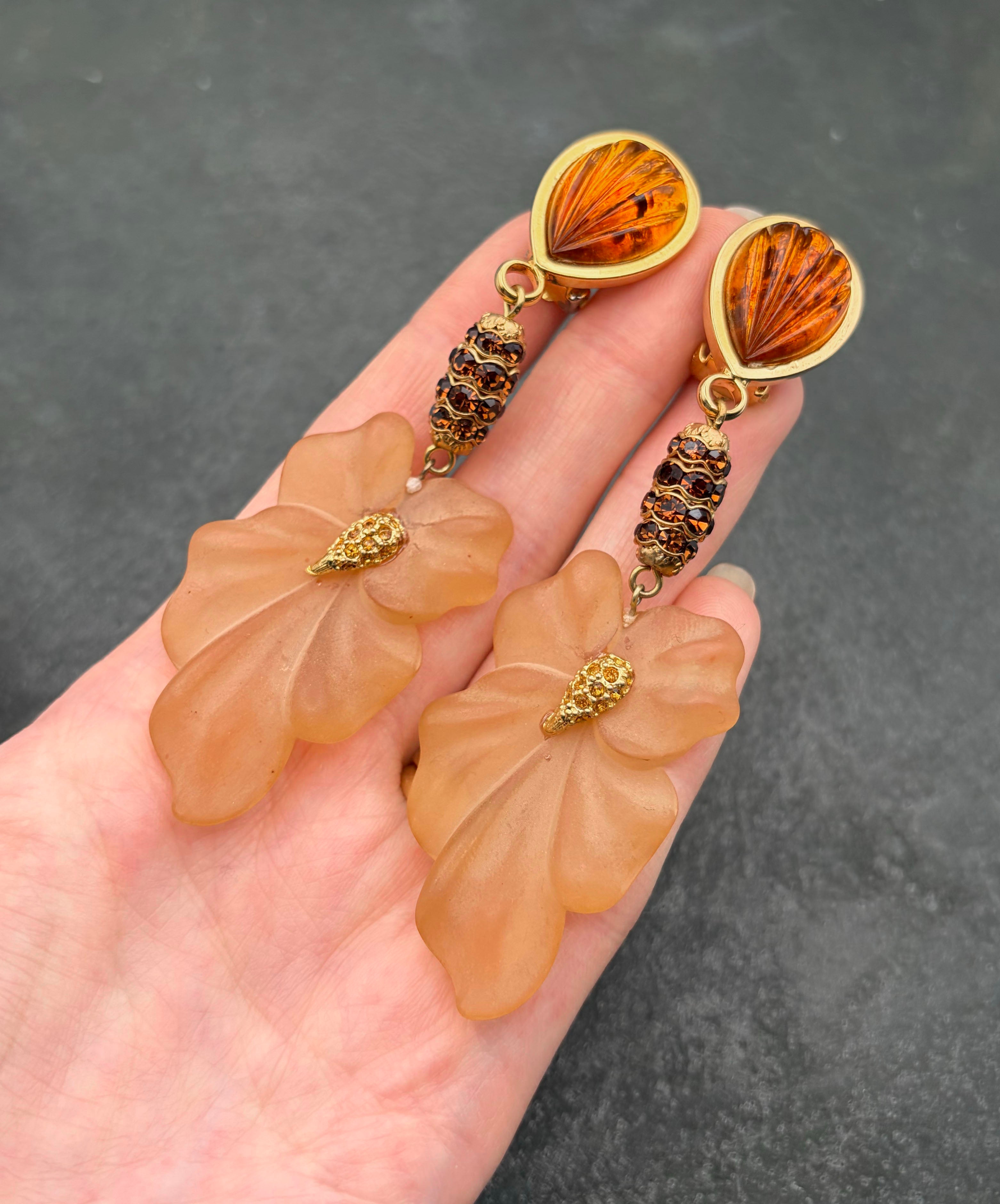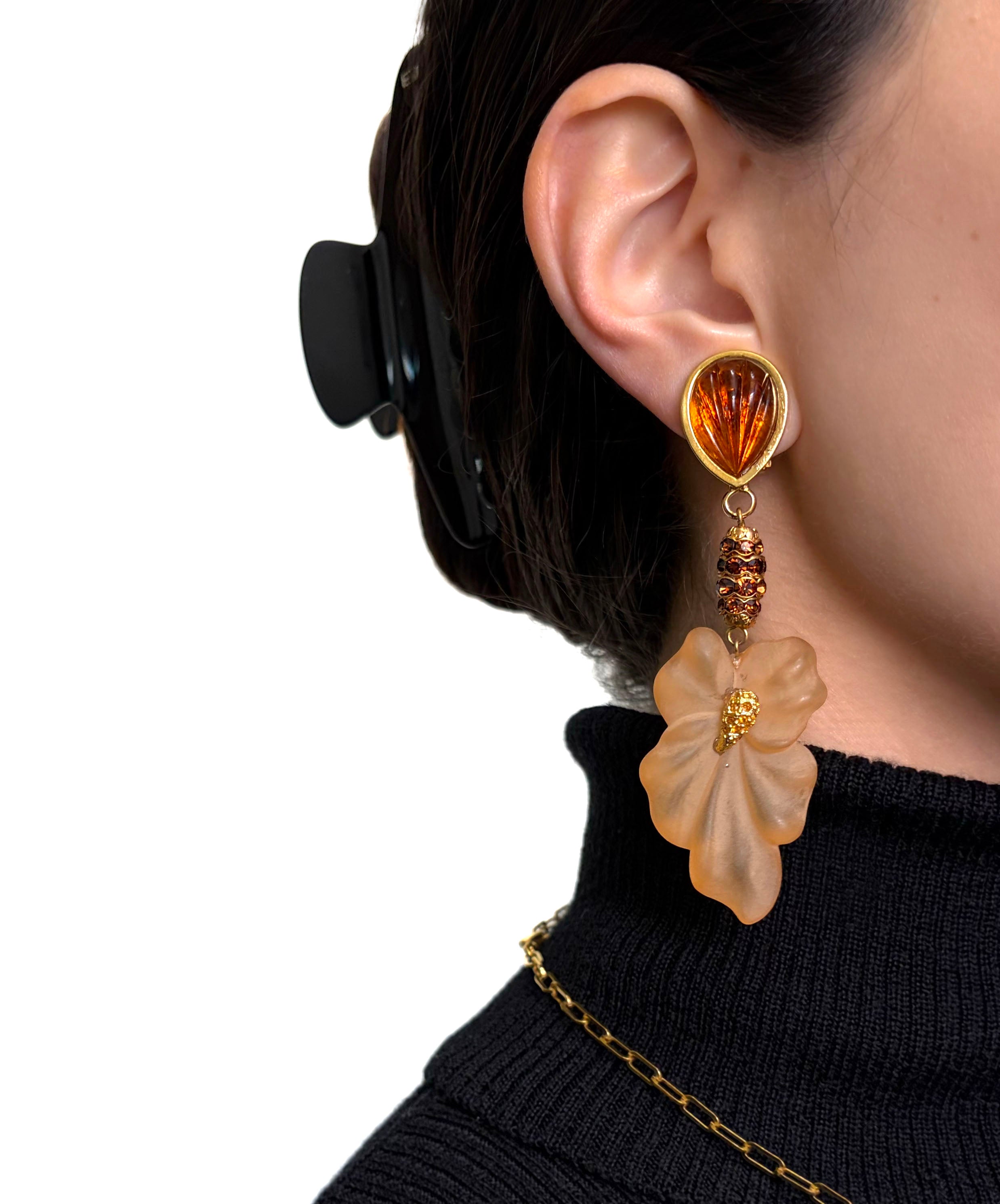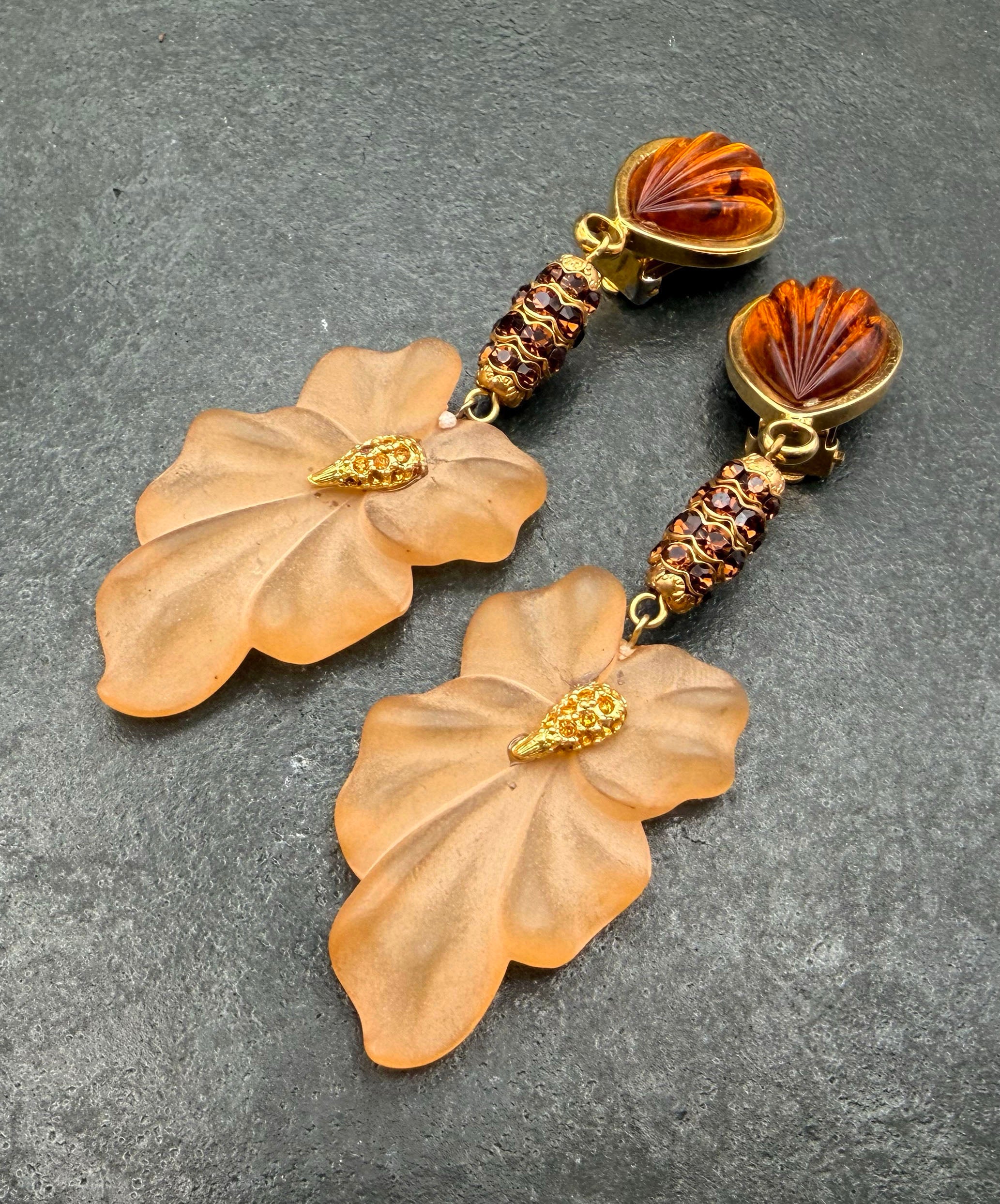 ゴールドトーンメタルにアンバーブラウンのペアシェイプガラスがセットされており、ブラウンのラインストーンがぐるりと敷き詰められた装飾メタル、フロストガラスのフラワーモチーフが垂れ下がり揺らめくデザイン。