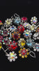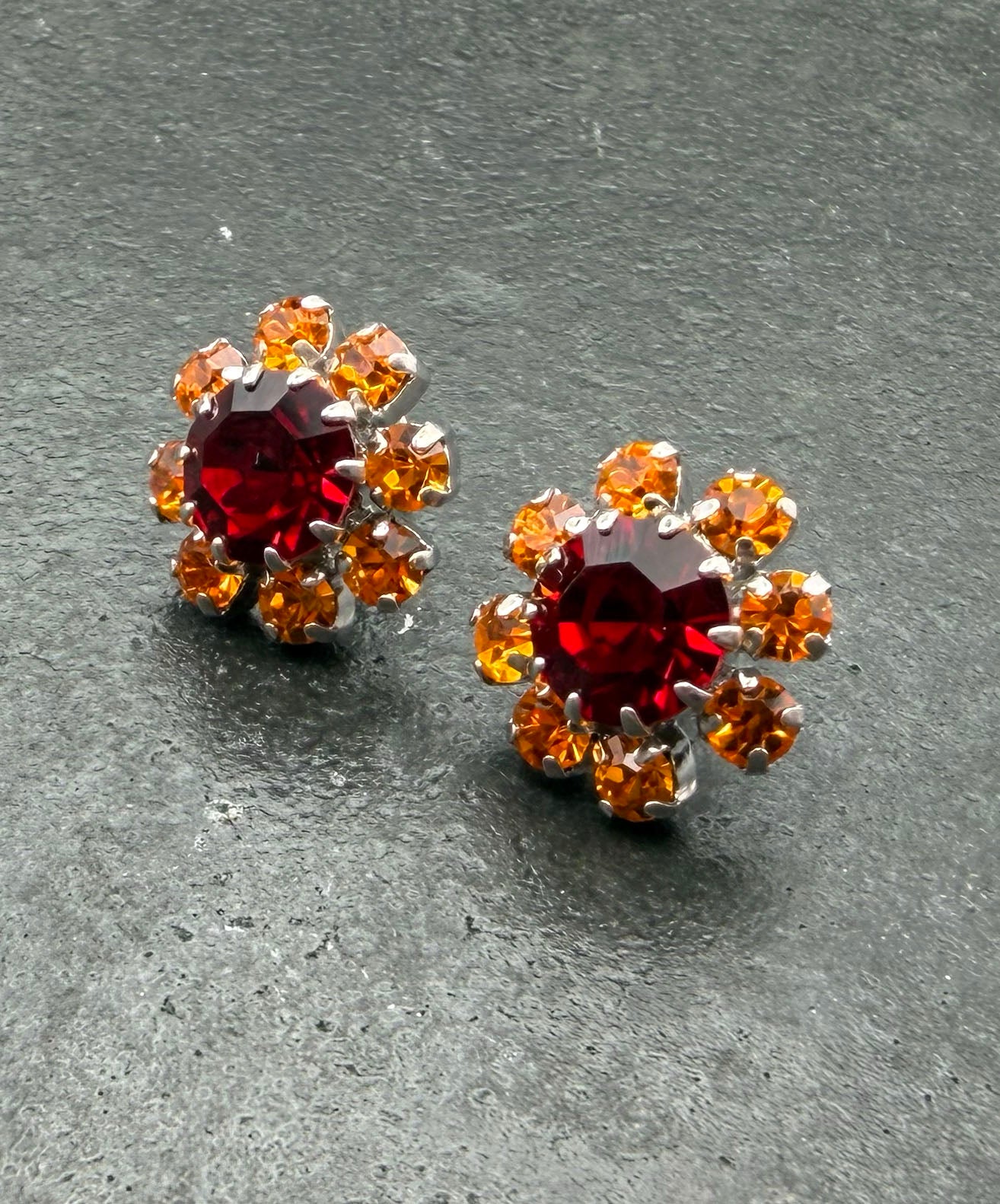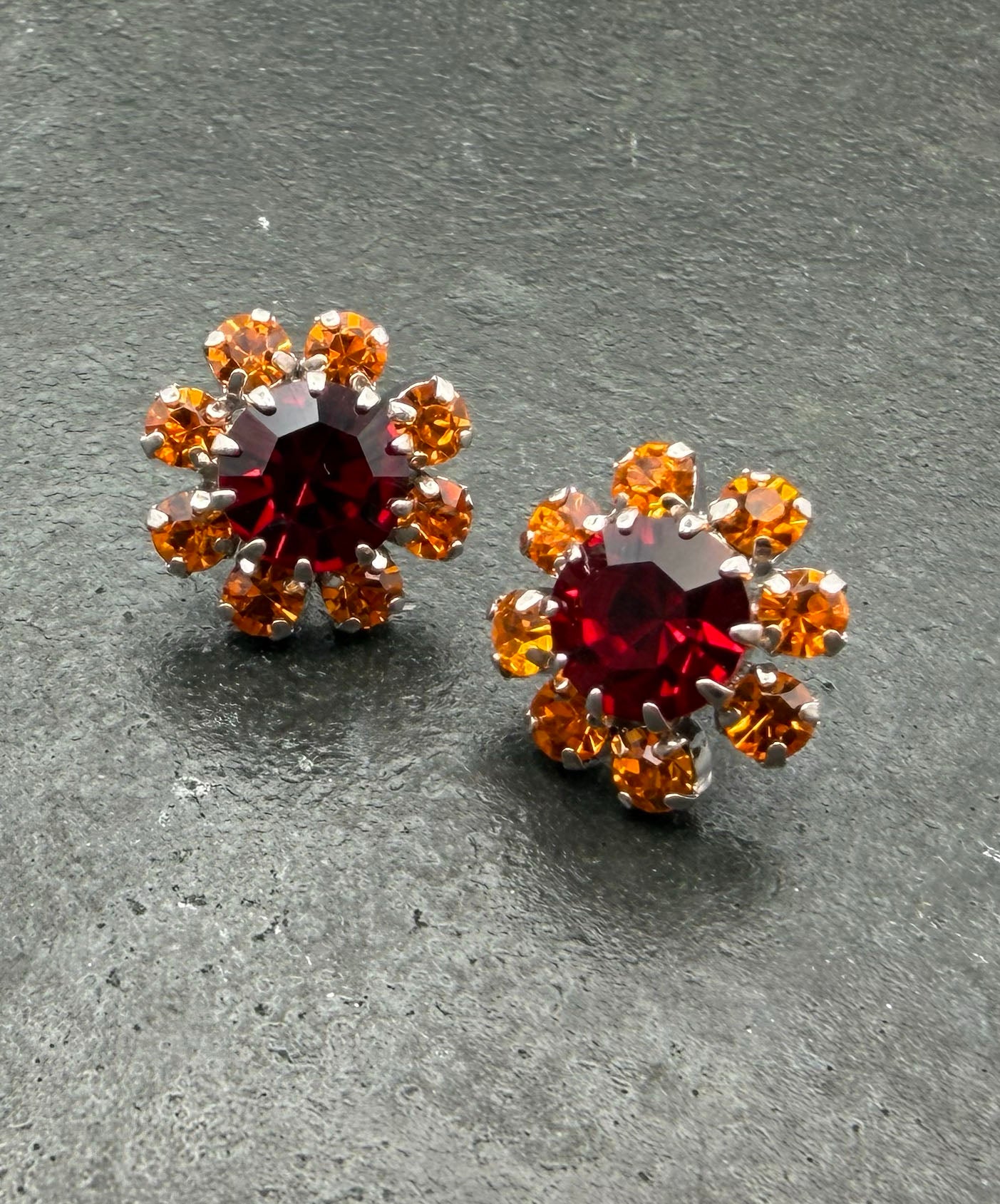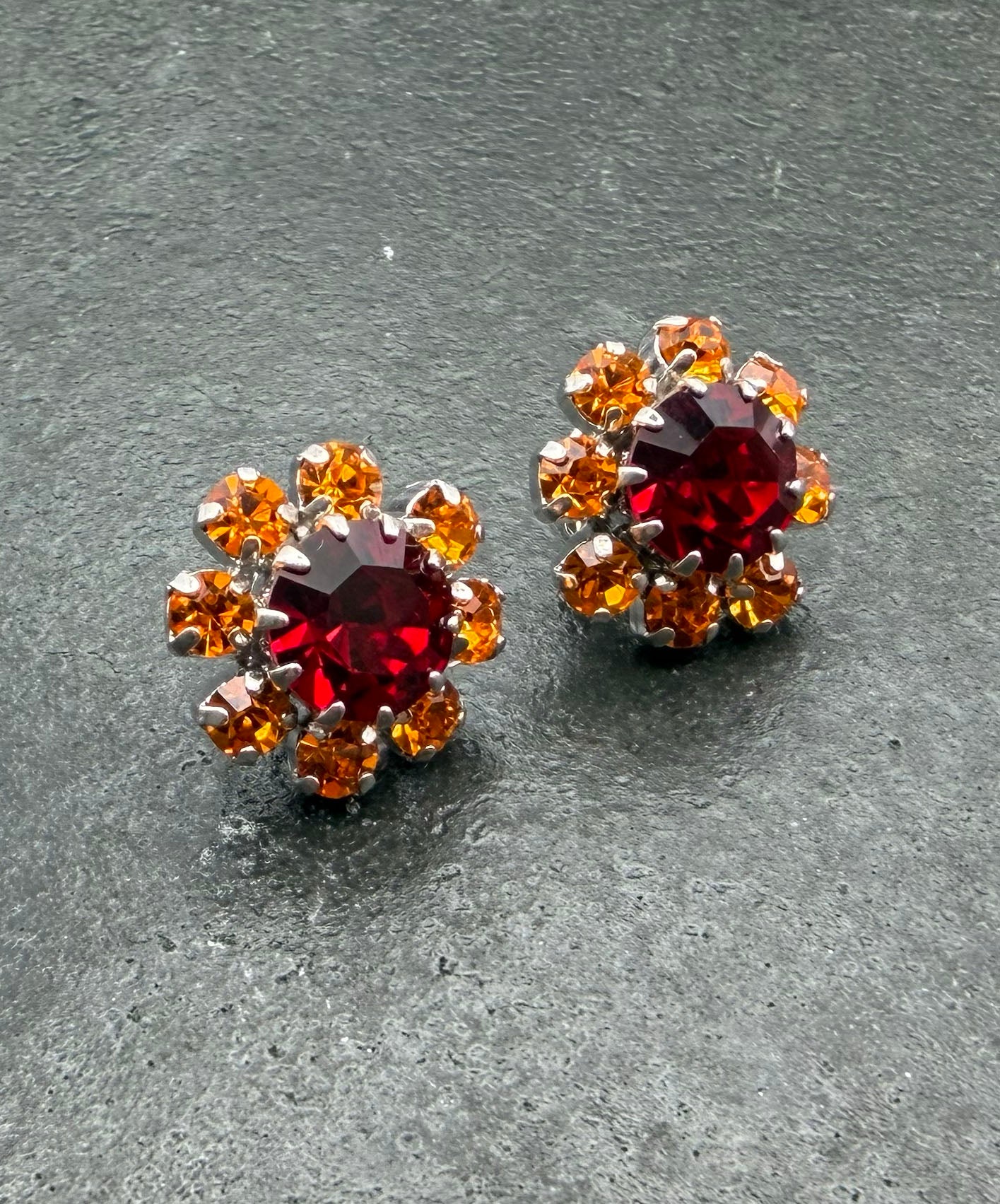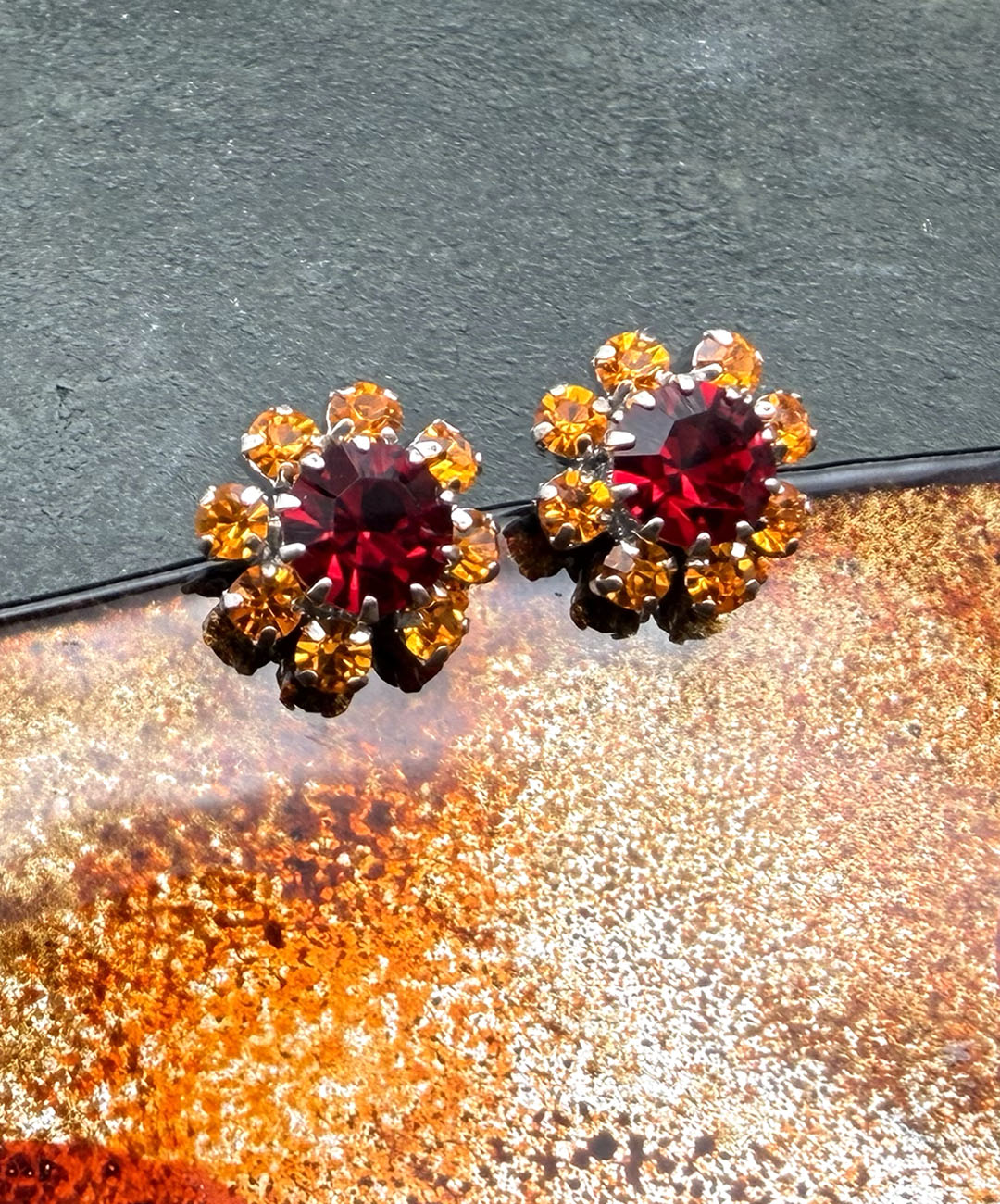 シルバートーンメタルに大粒ガーネットレッドガラスがセットされ、周囲を深みのあるタンジェリンオレンジのストーンが取り巻いてフラワーモチーフを描いています。
