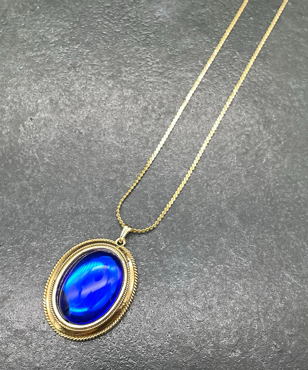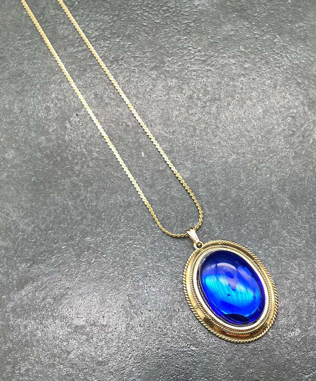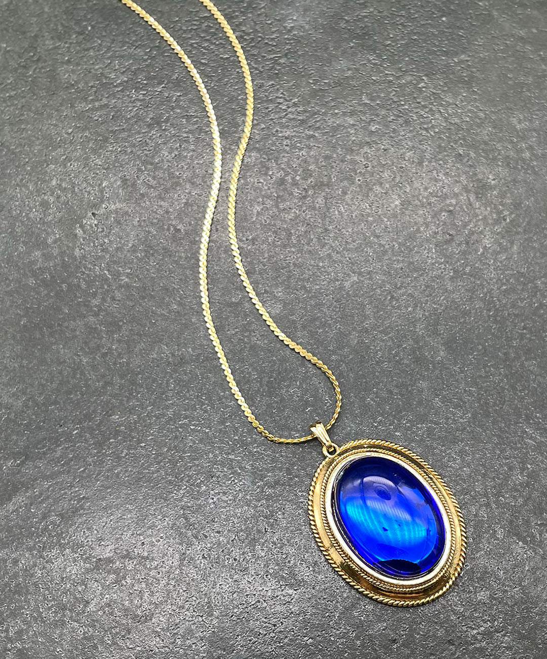 しなやかに艶めくゴールドトーンチェーンに、ロープテクスチャーの石枠にロイヤルブルーのオーバルカボションガラスがセットされたペンダントが通されています。