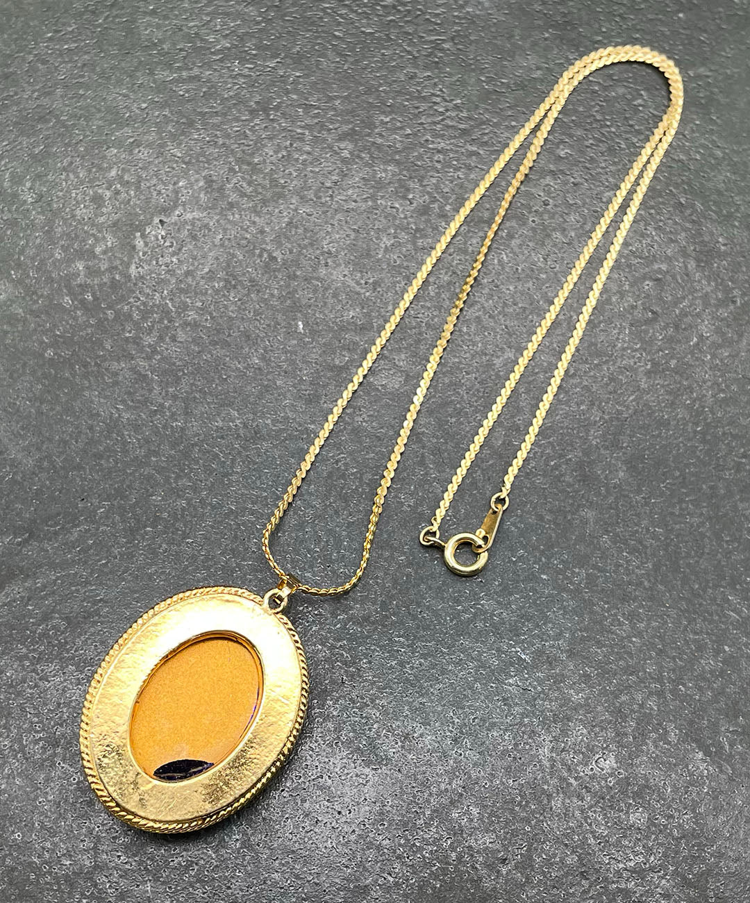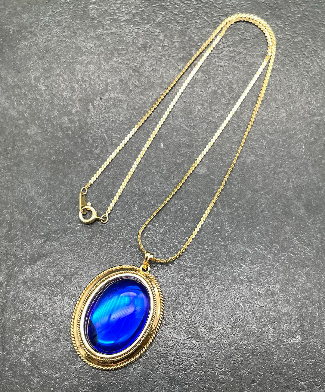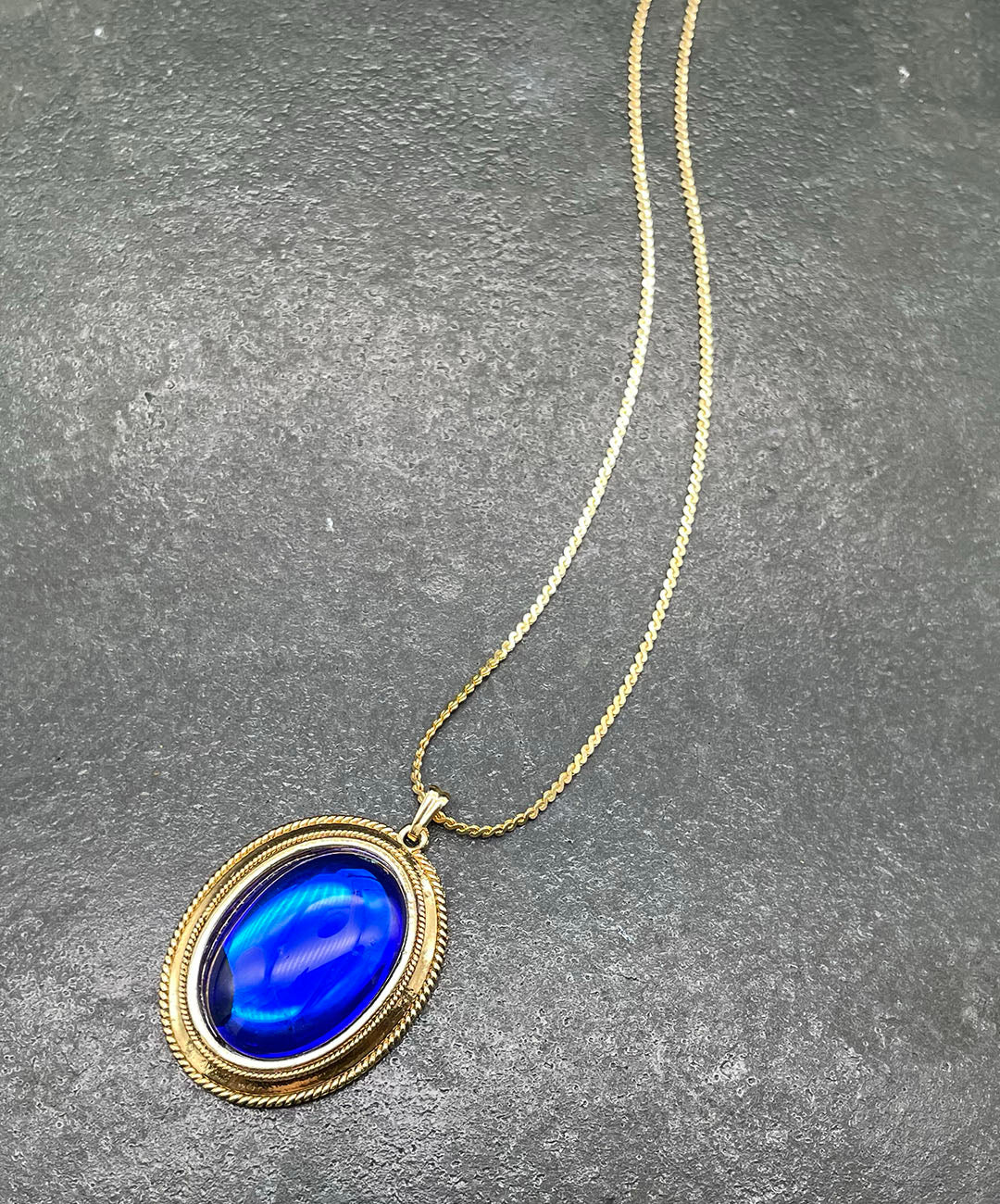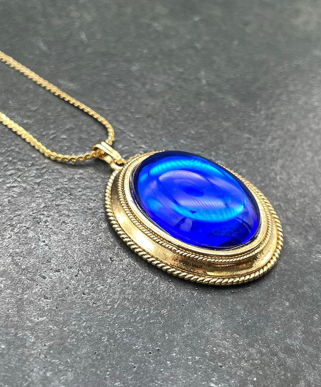 しなやかに艶めくゴールドトーンチェーンに、ロープテクスチャーの石枠にロイヤルブルーのオーバルカボションガラスがセットされたペンダントが通されています。