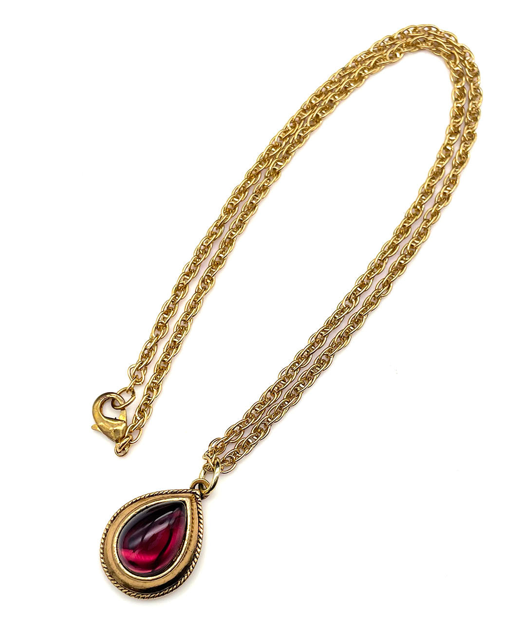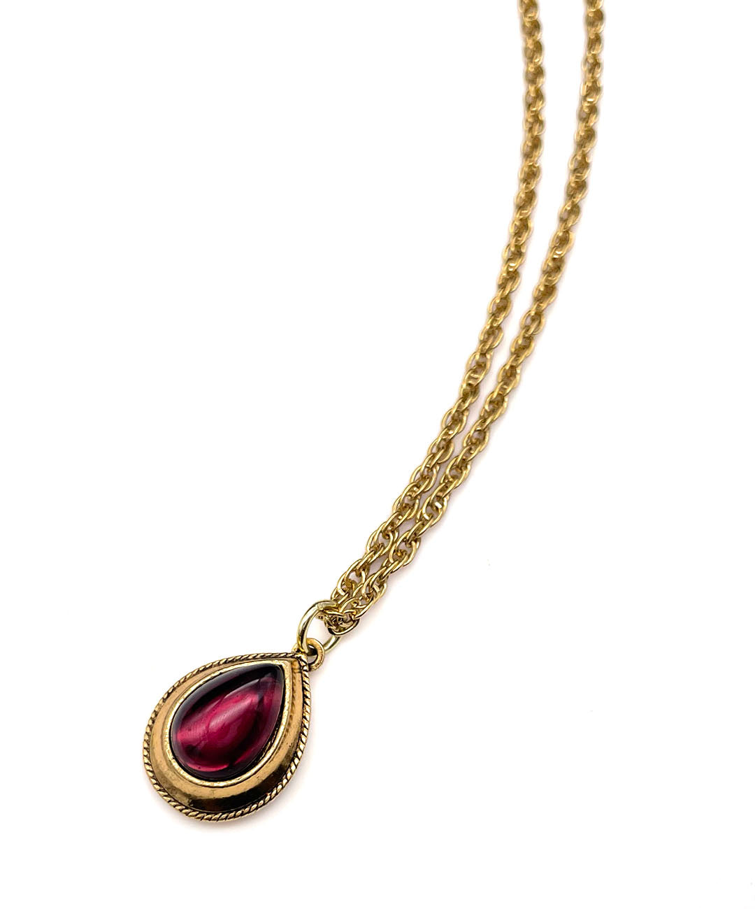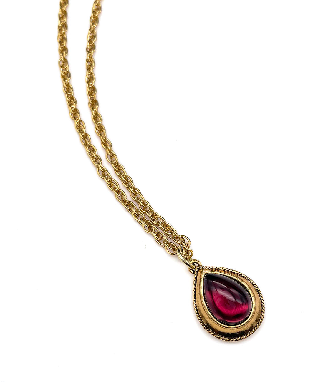 ールドトーンのチェーンに、バーガンディーのティアドロップカボションガラスがセットされたペンダントが通されています。