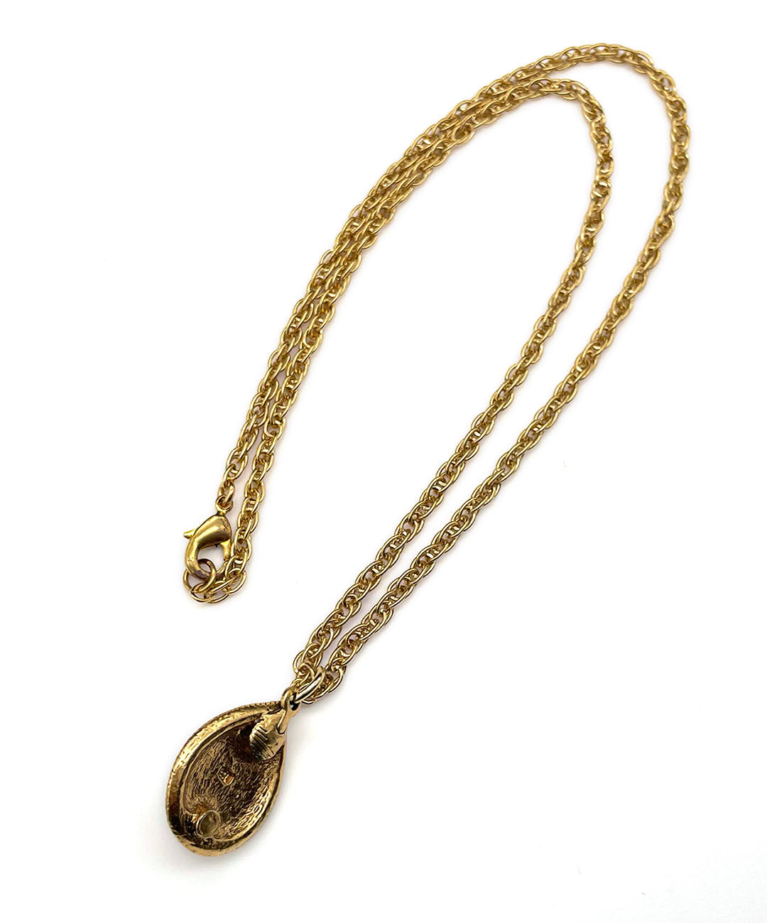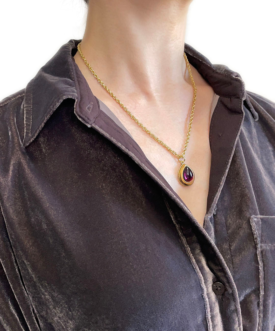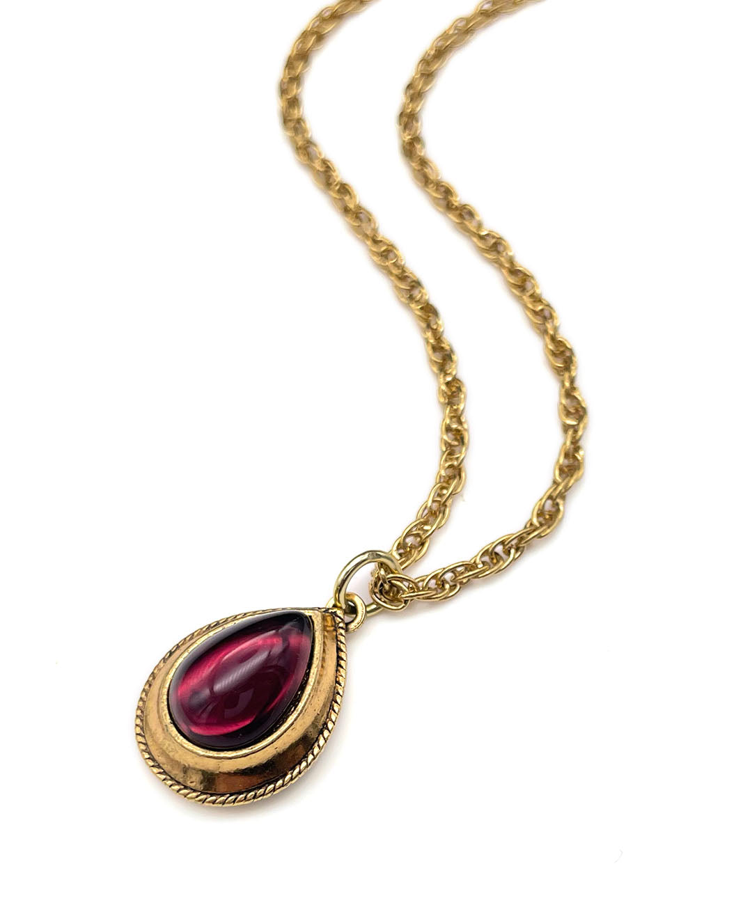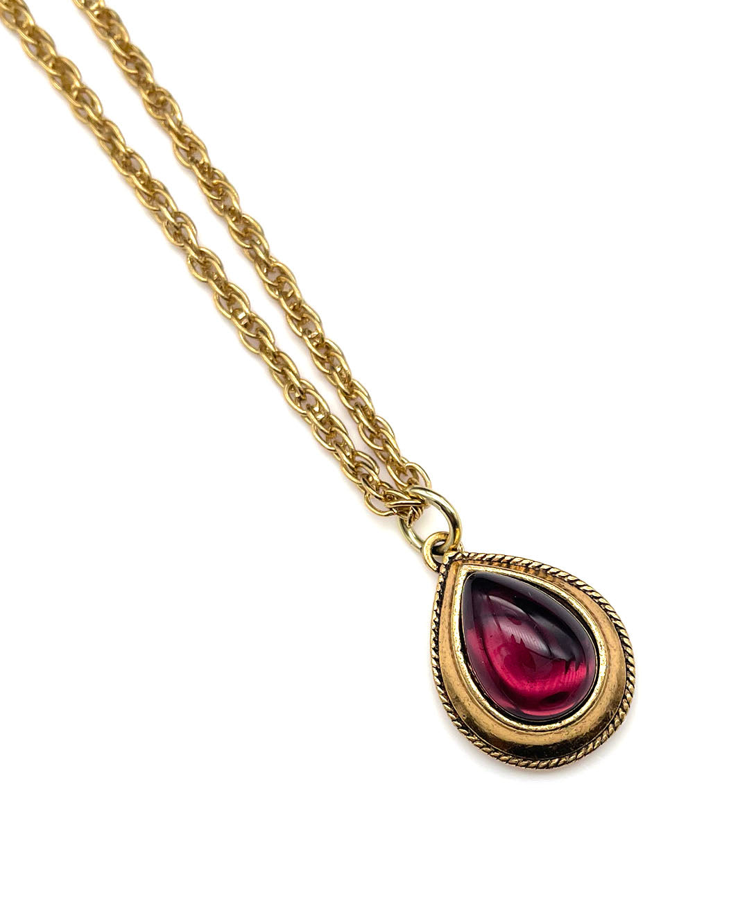 ールドトーンのチェーンに、バーガンディーのティアドロップカボションガラスがセットされたペンダントが通されています。