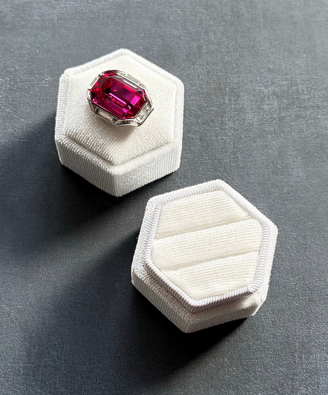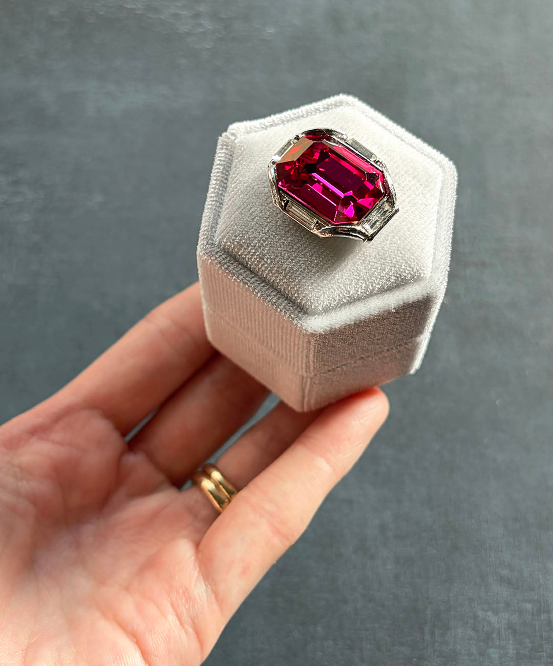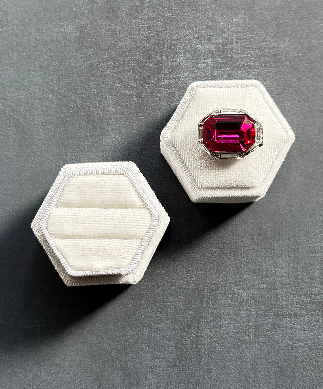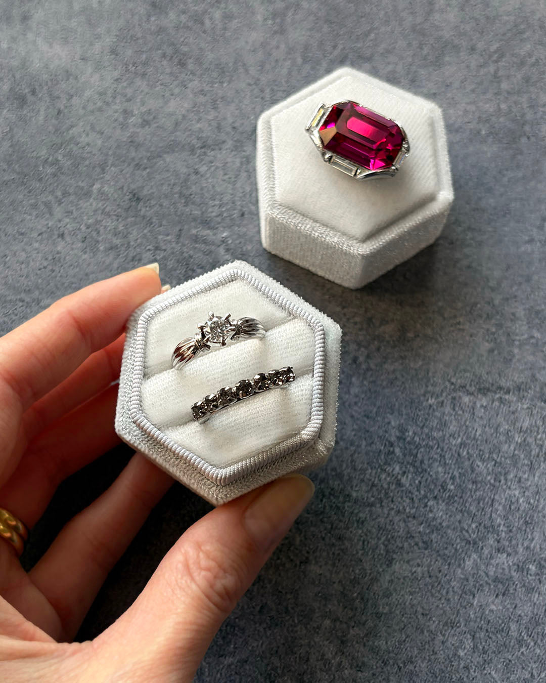 Elysa Jewelryのヴィンテージコスチュームジュエリーと、艶やかなベロアを組み合わせた特別なリングボックス。