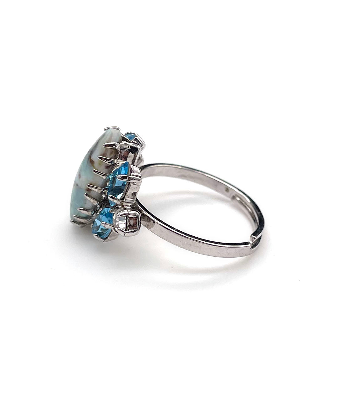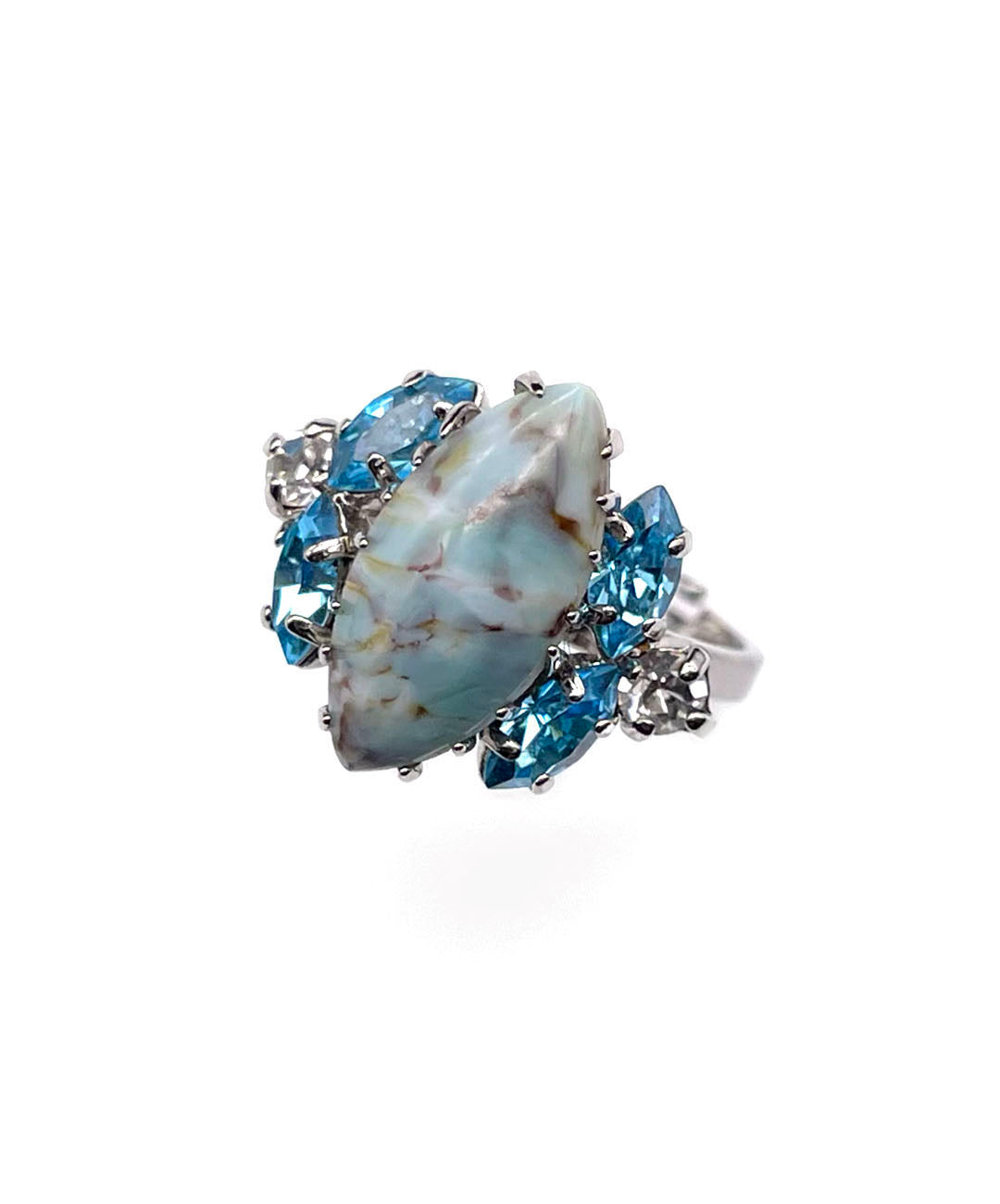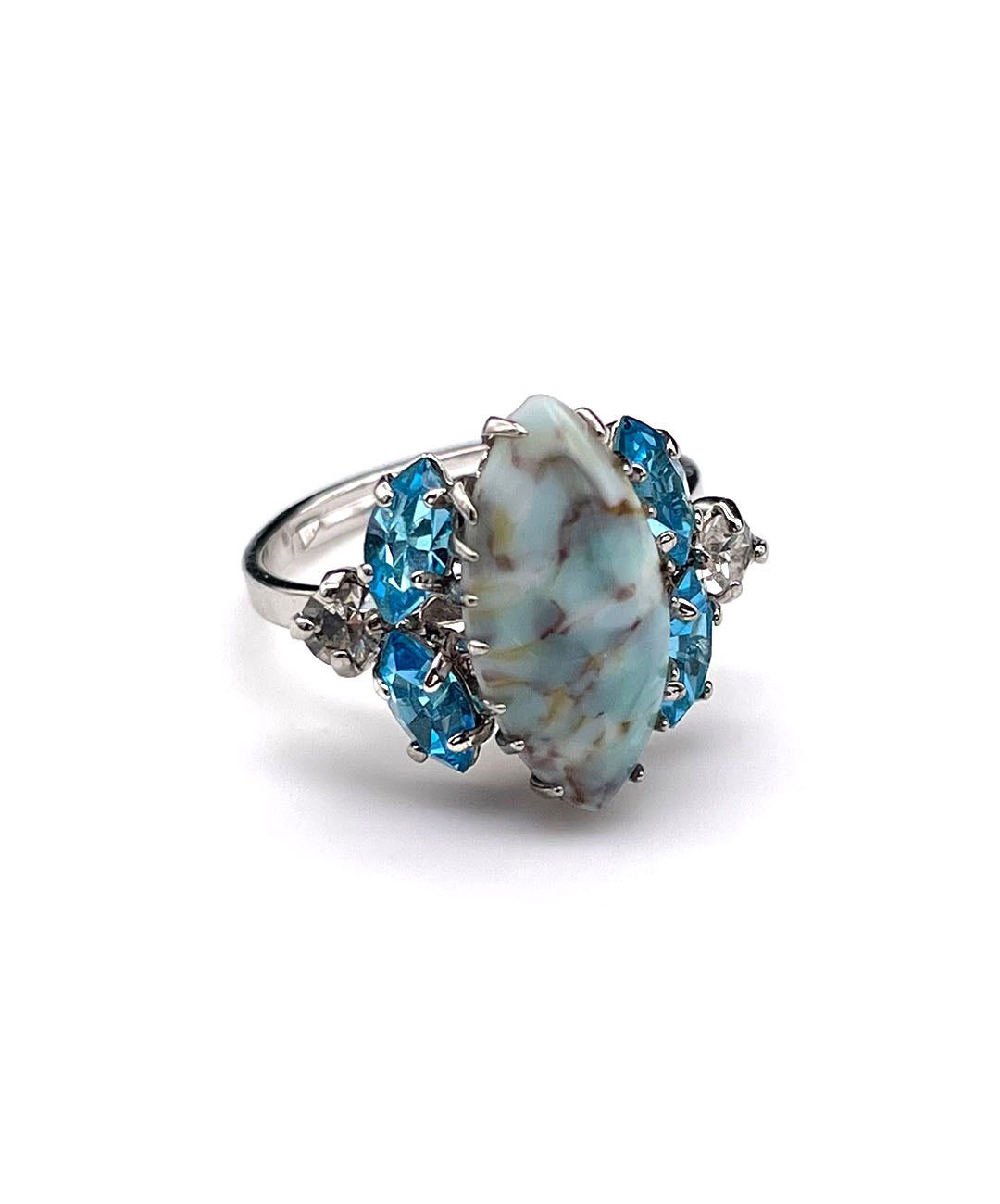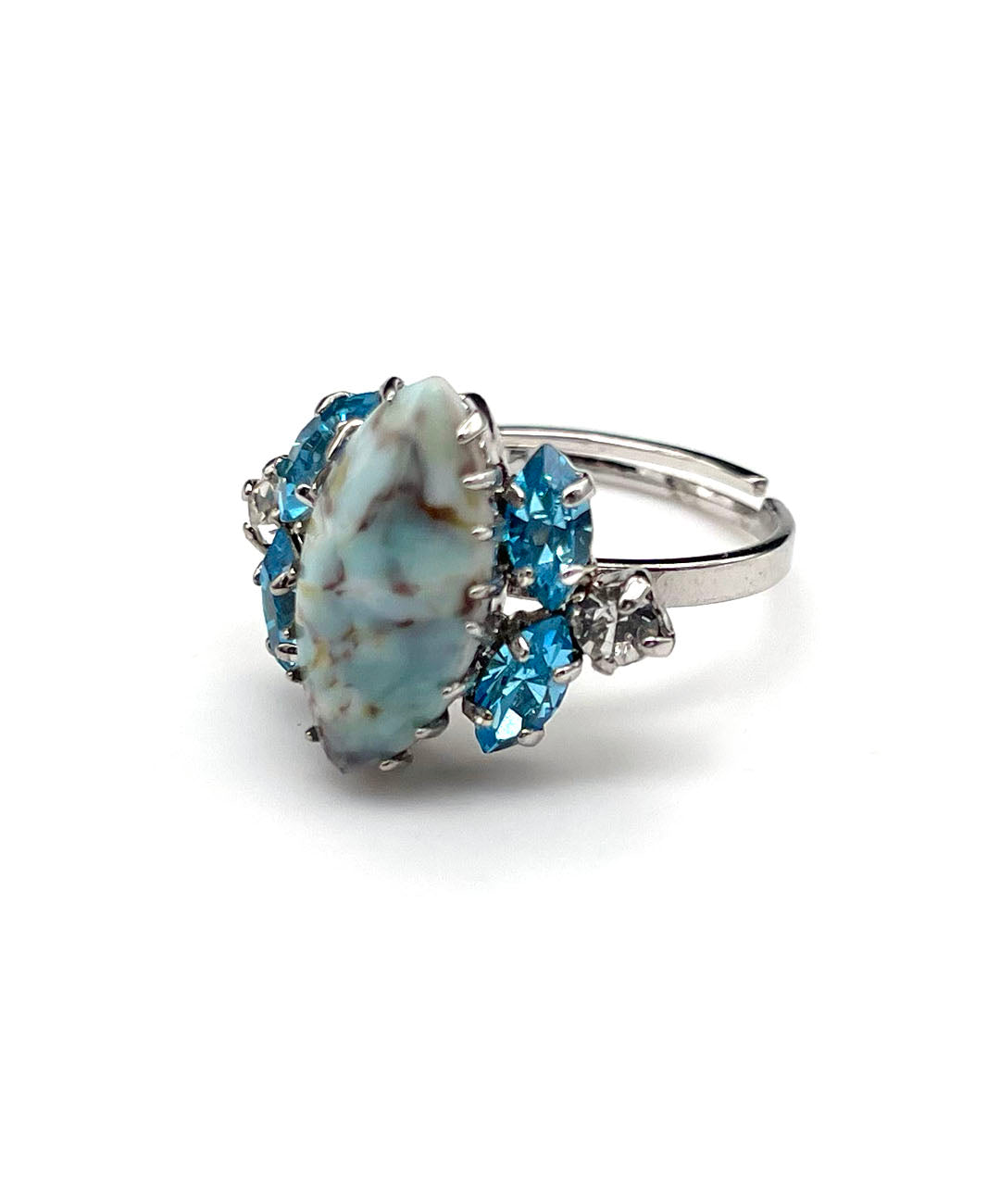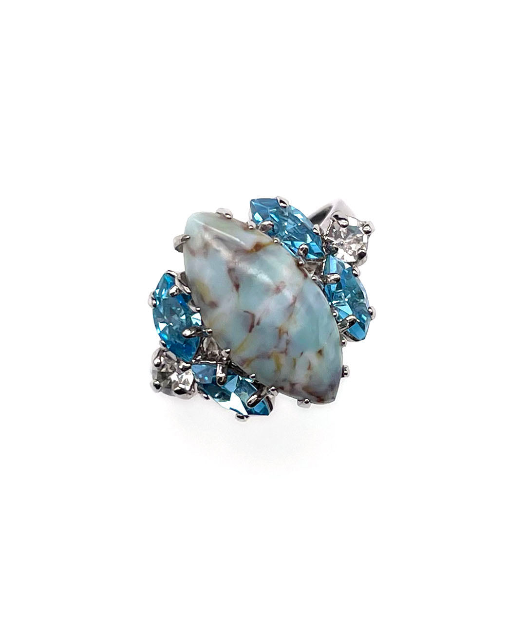 シルバートーンメタルに、ペールターコイズのマーブルカボションガラス、アクアブルーのマーキスカットストーン、クリアのラウンドカットストーンが美しいシェイプに爪留めされています。