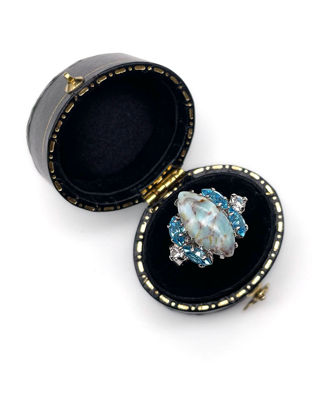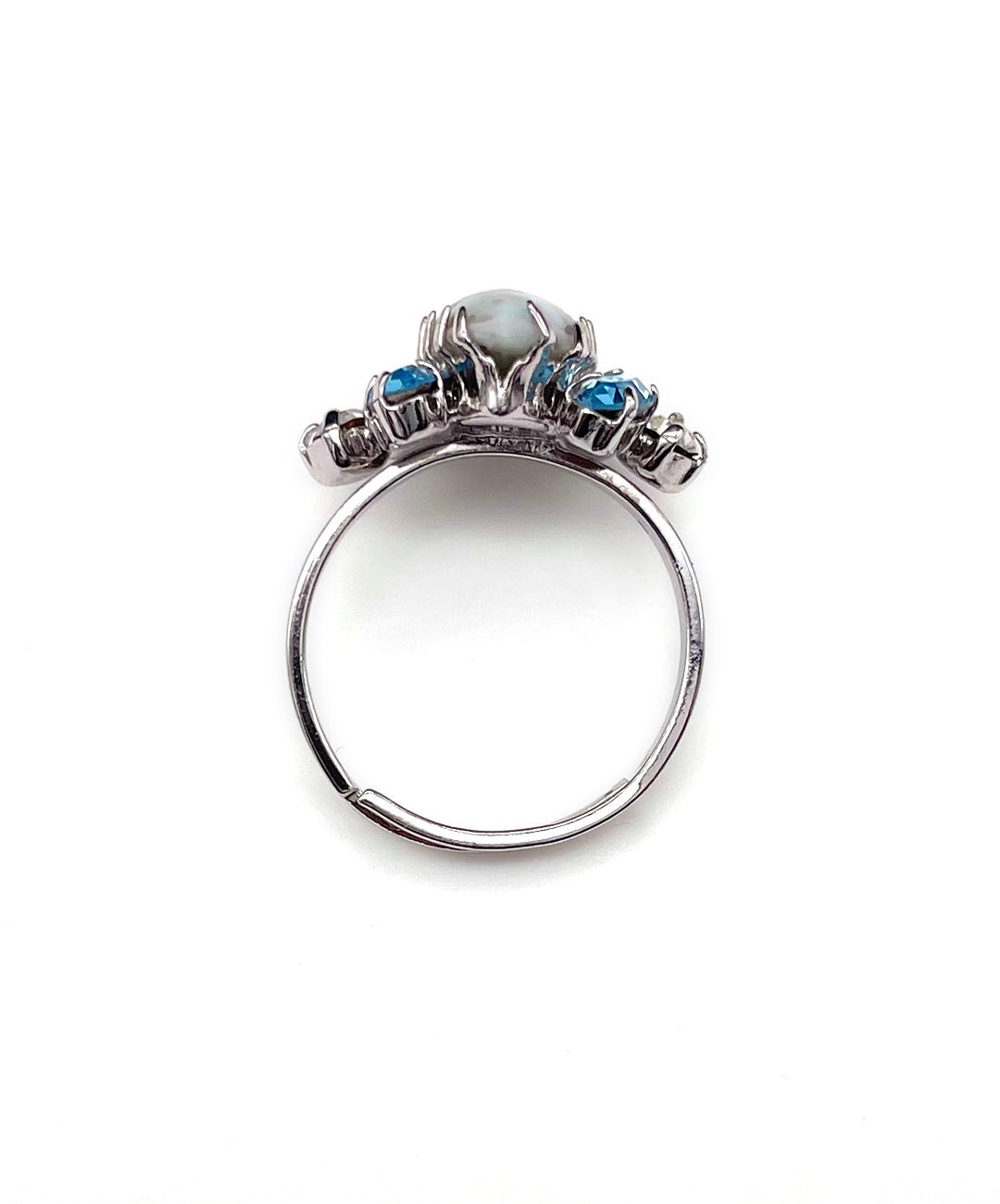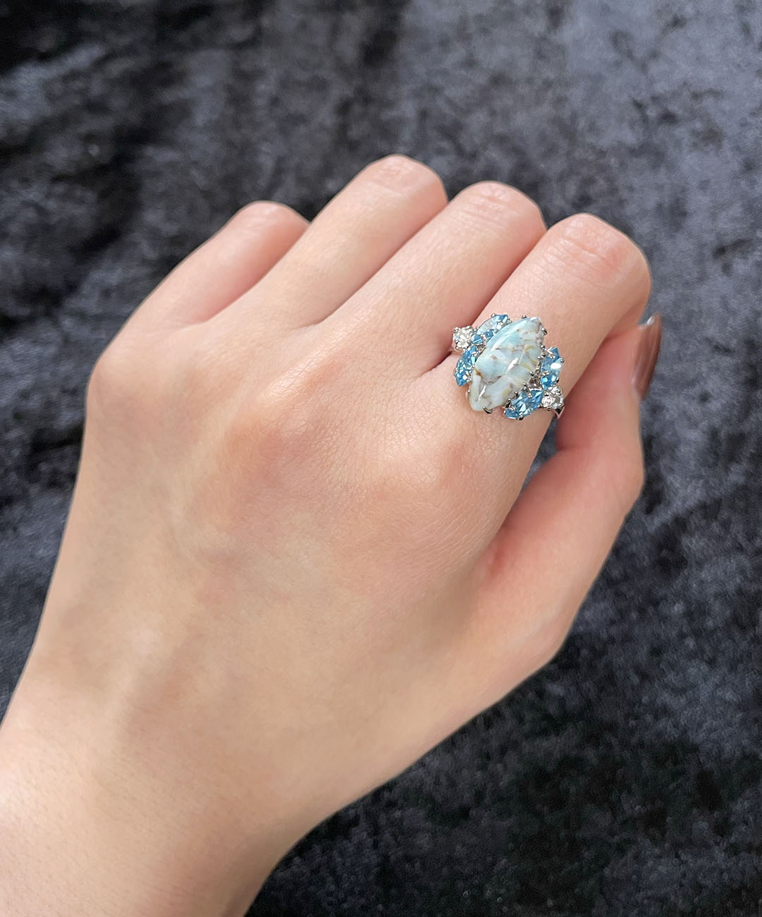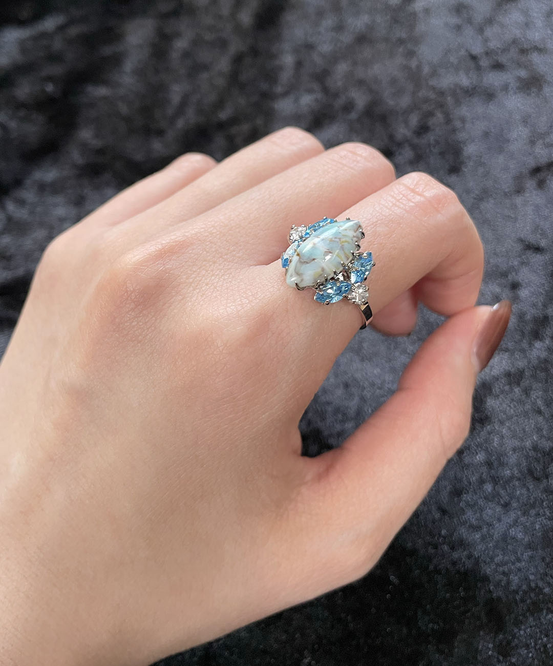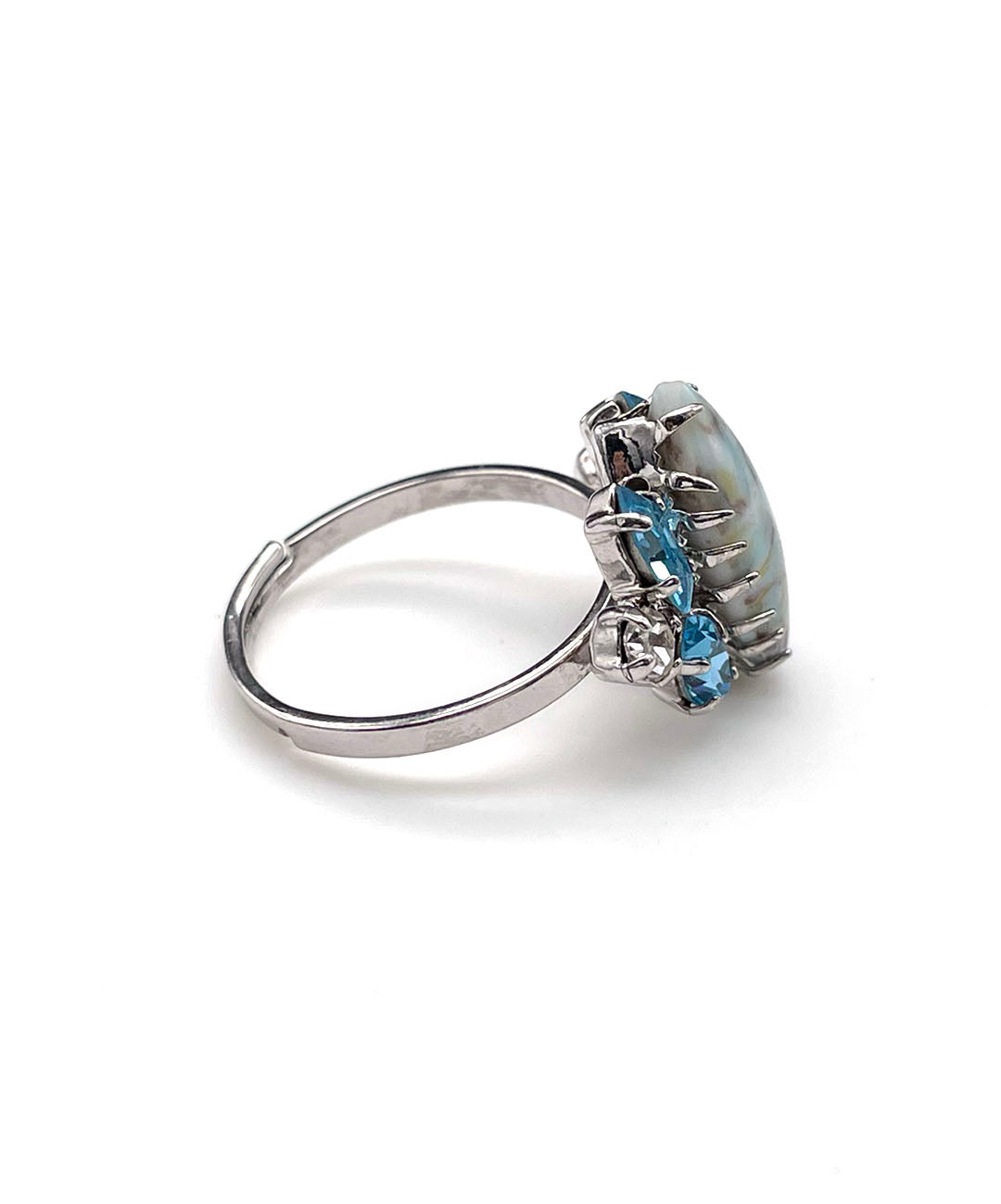 シルバートーンメタルに、ペールターコイズのマーブルカボションガラス、アクアブルーのマーキスカットストーン、クリアのラウンドカットストーンが美しいシェイプに爪留めされています。