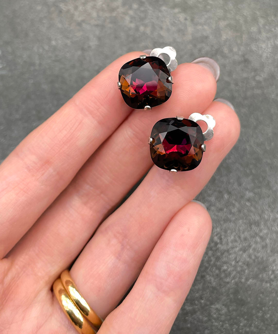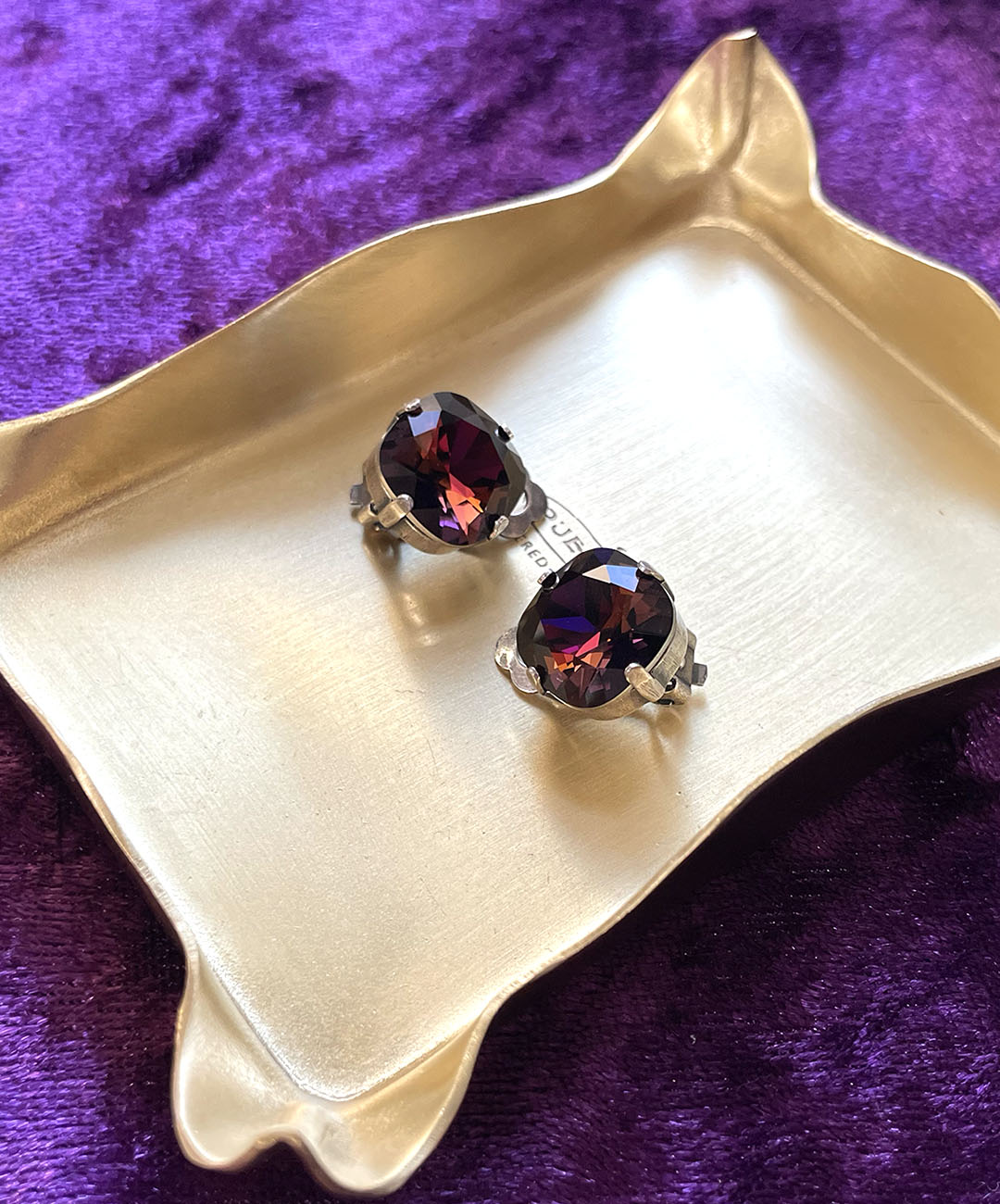 こちらのクリスタルは、どくどくと溢れ出す溶岩のような暗く熱い輝きに、時折紫の光が浮かぶ妖艶なカラー。黒みを帯びたディープボルドーの奥底に、パープルの閃光を発見するような独特の色味です。