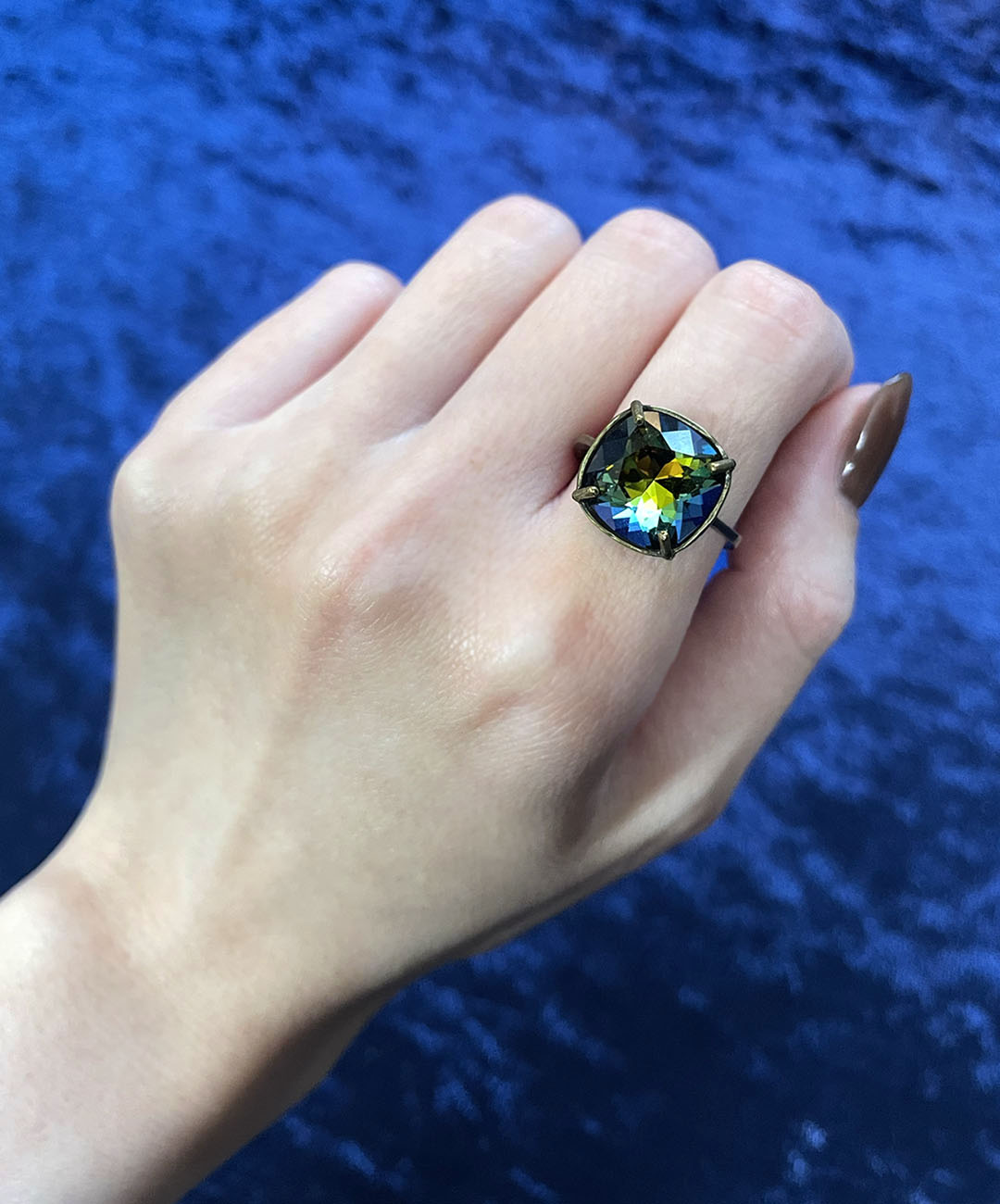 こちらのクリスタルは、紺碧の夕闇を映し出したような幻想的なカラー。ブルー、パープル、グリーン、夕焼けのようなオレンジやイエローが混ざり合って移ろう、ロマンティックな美しさに魅了されます。