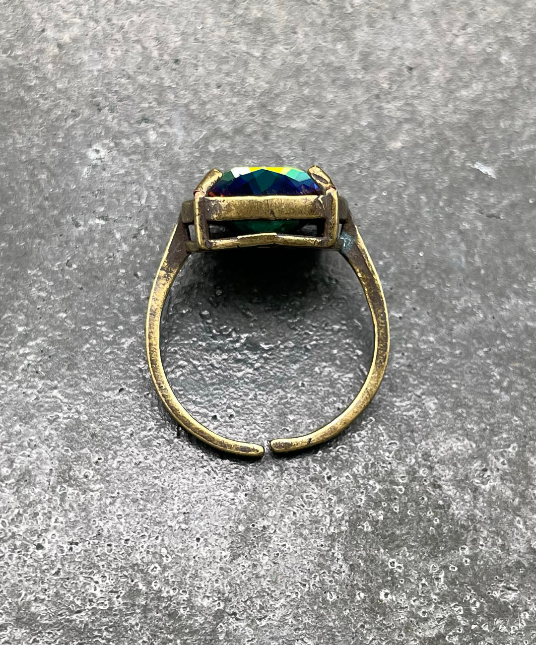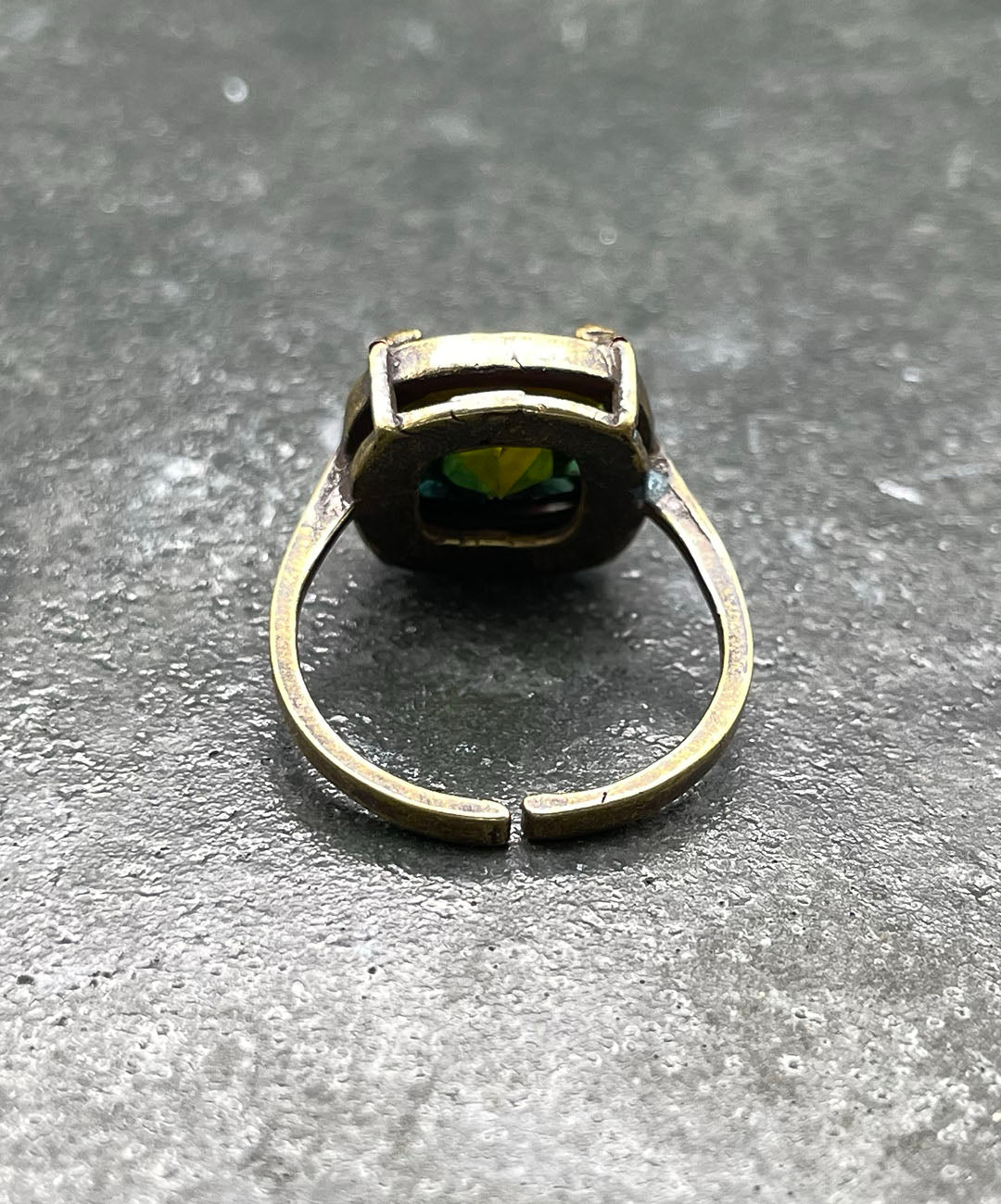 燻し加工が施されたシックなゴールドトーンの石枠に爪留めし、ヴィンテージムード漂う一品に仕上げました。クラフト感があり、繊細で軽量なお作りのリングアームは、指元にそっと寄り添ってくれます。