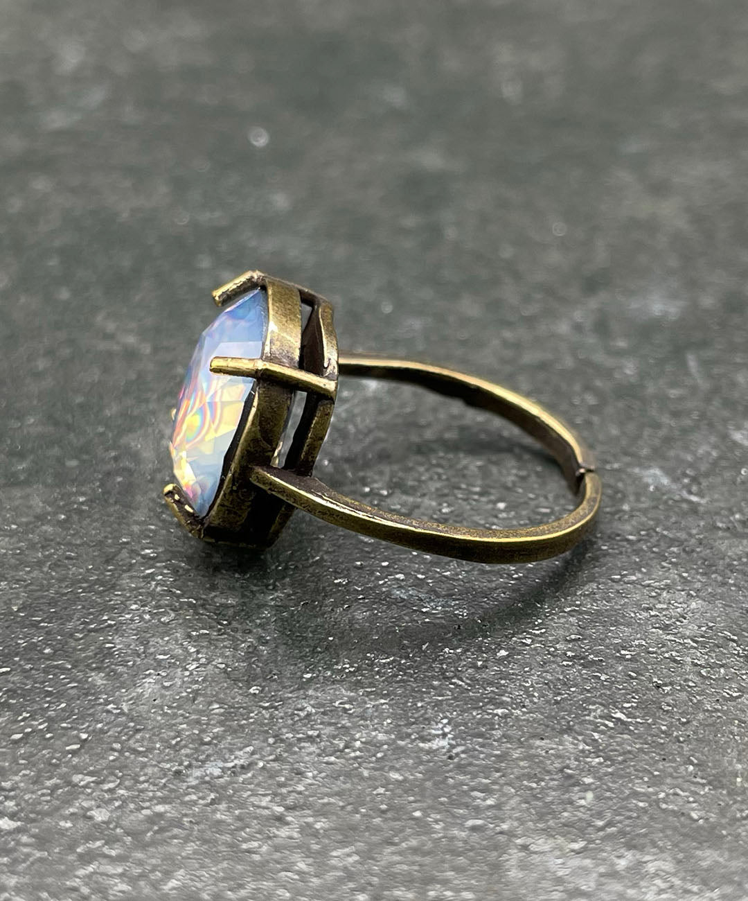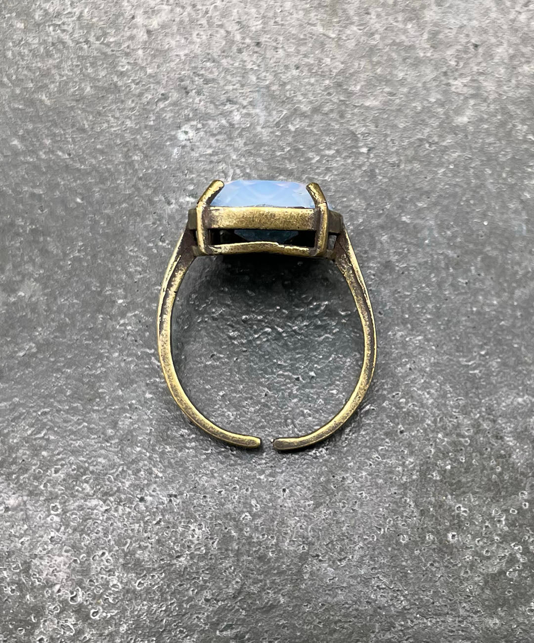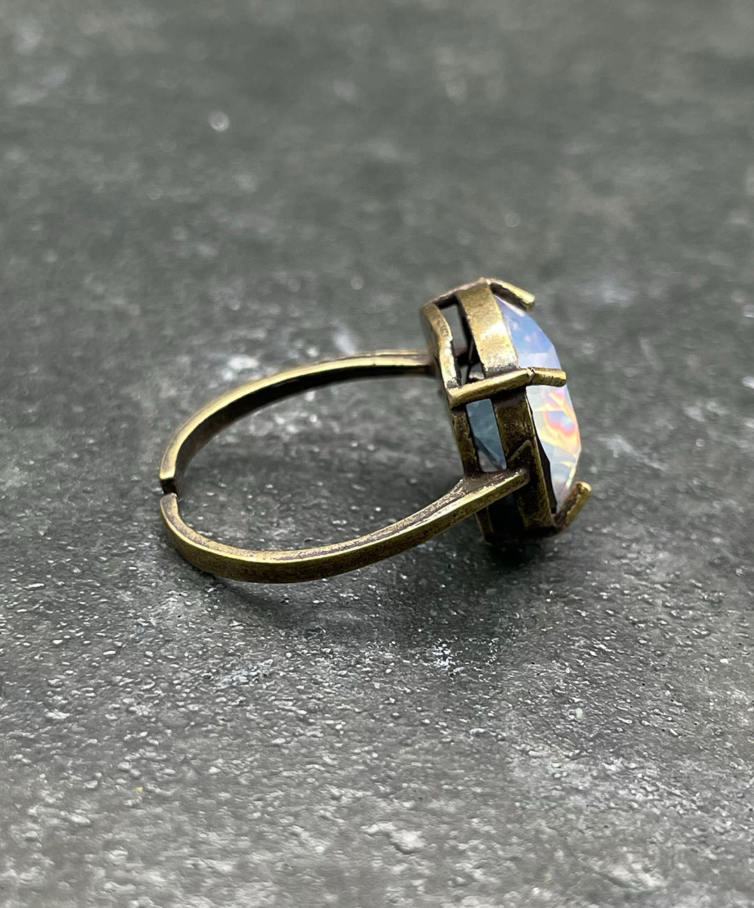 燻し加工が施されたシックなゴールドトーンの石枠に爪留めし、ヴィンテージムード漂う一品に仕上げました。クラフト感があり、繊細で軽量なお作りのリングアームは、指元にそっと寄り添ってくれます。