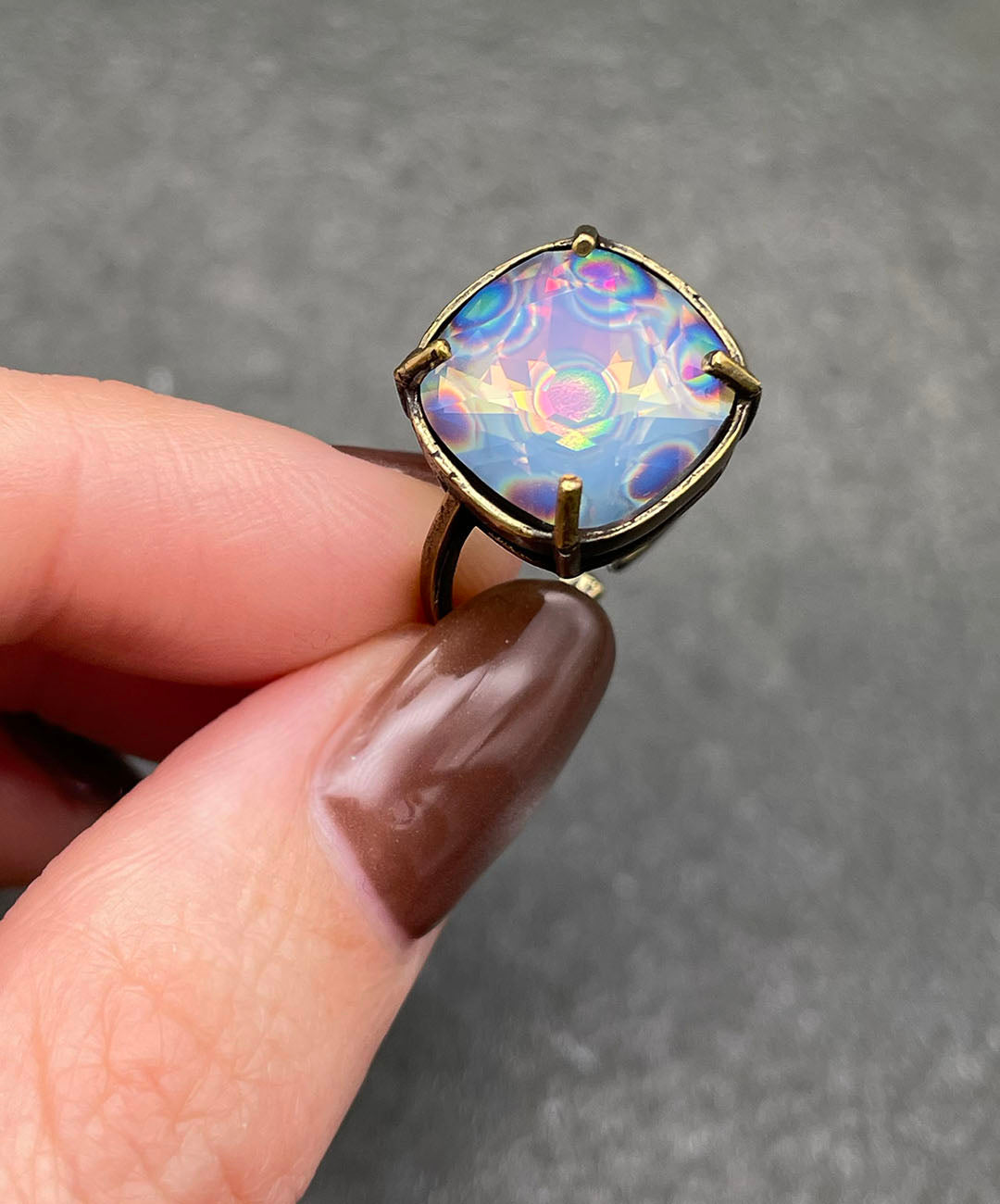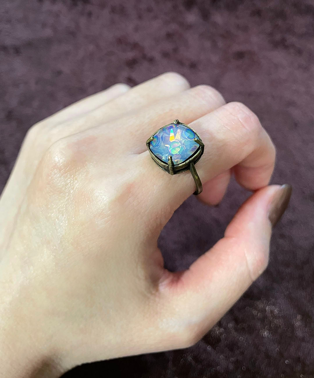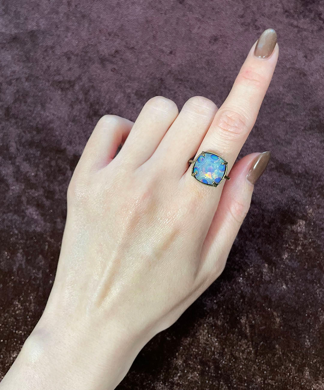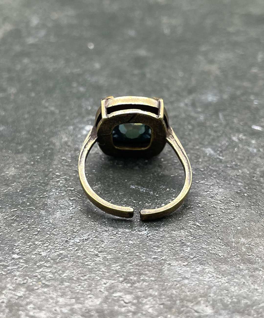 燻し加工が施されたシックなゴールドトーンの石枠に爪留めし、ヴィンテージムード漂う一品に仕上げました。クラフト感があり、繊細で軽量なお作りのリングアームは、指元にそっと寄り添ってくれます。