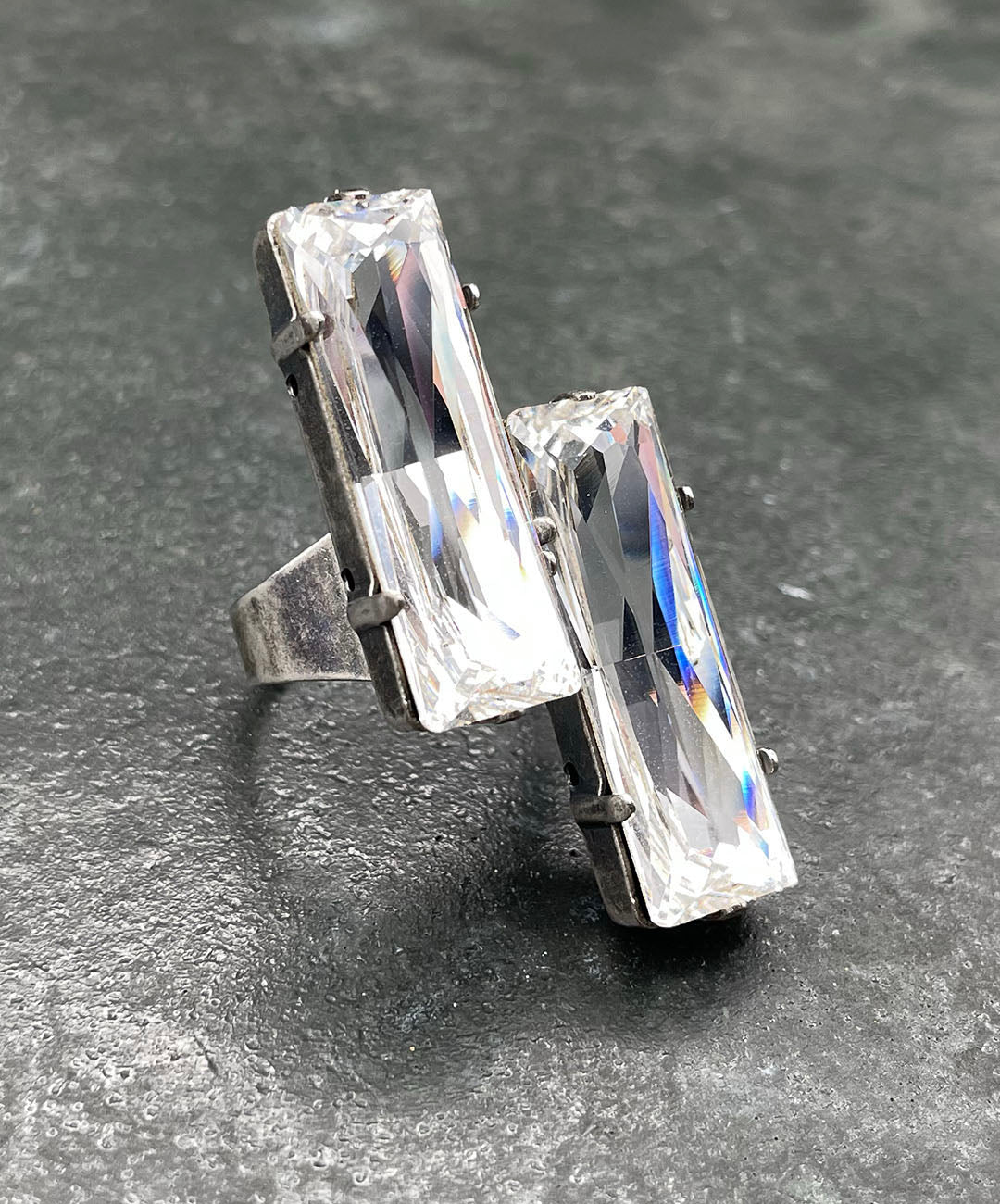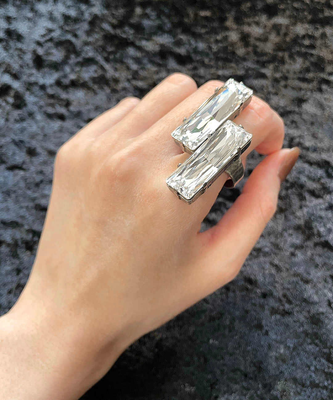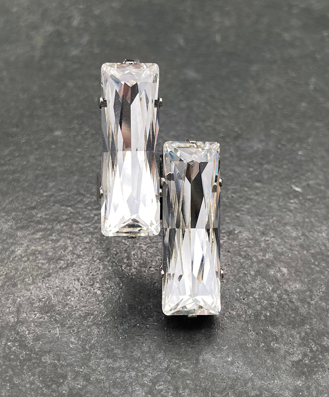 氷のように澄んだ輝きを放つこちらのクリスタルは、気品と洗練されたシャープさを併せ持つプリンセスバゲットカット。あえて2石セットすることで、他にはない抜群の存在感を放つステートメントリングに仕上げました。