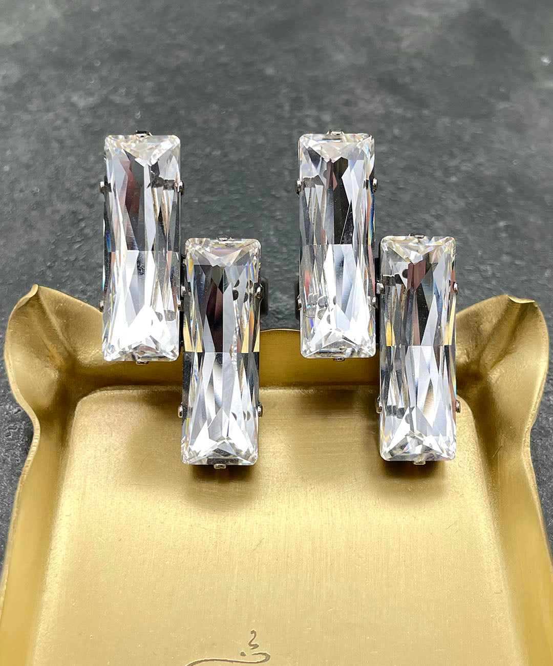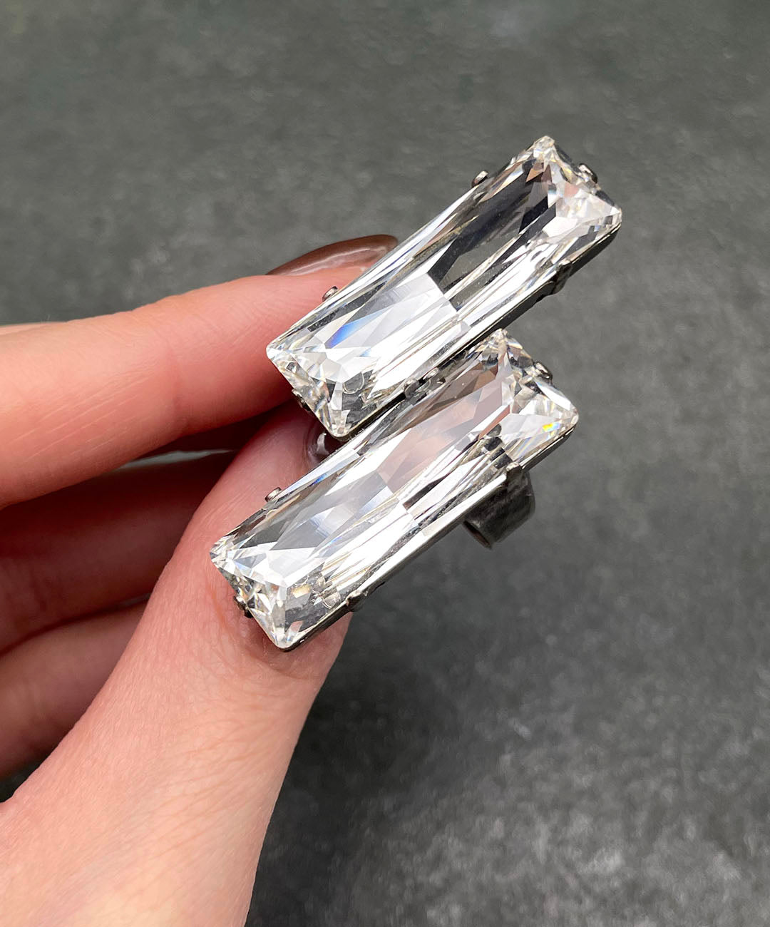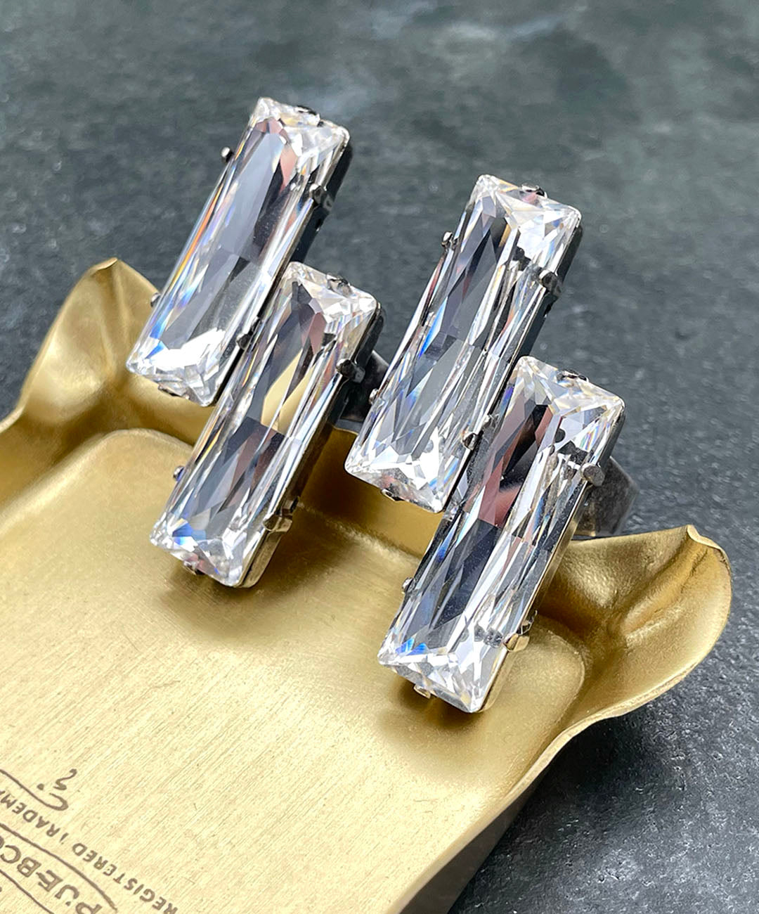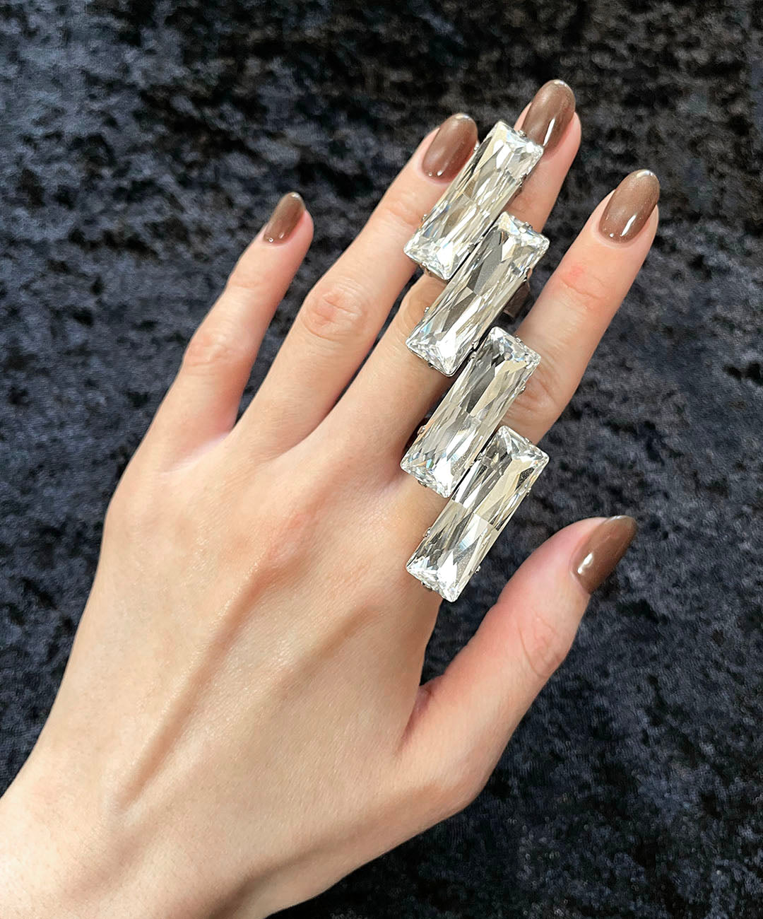 氷のように澄んだ輝きを放つこちらのクリスタルは、気品と洗練されたシャープさを併せ持つプリンセスバゲットカット。あえて2石セットすることで、他にはない抜群の存在感を放つステートメントリングに仕上げました。