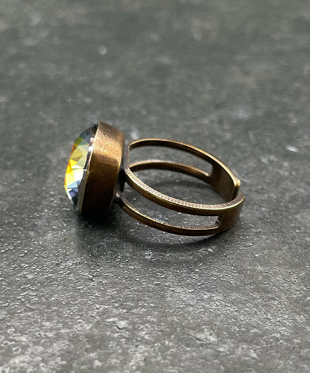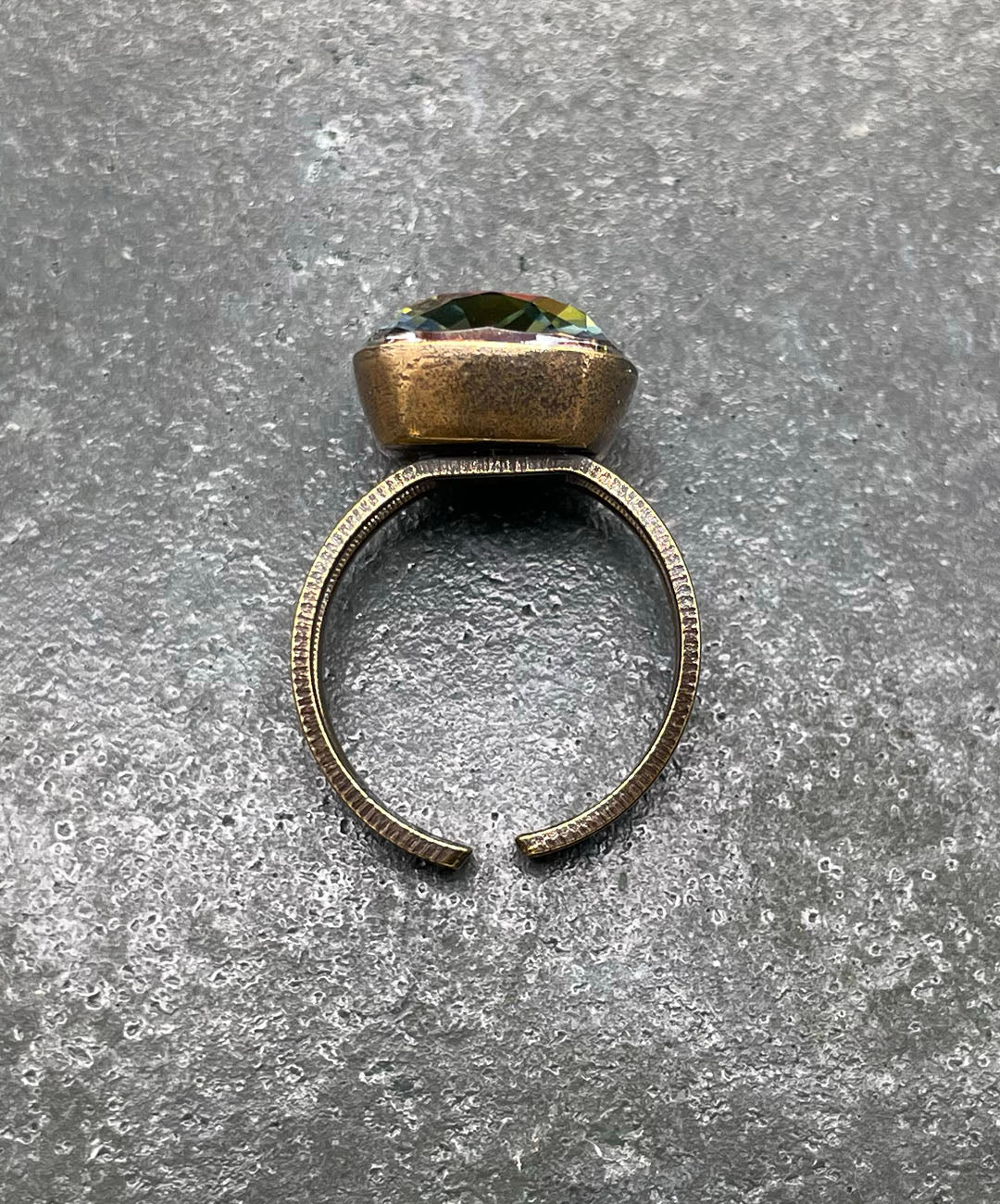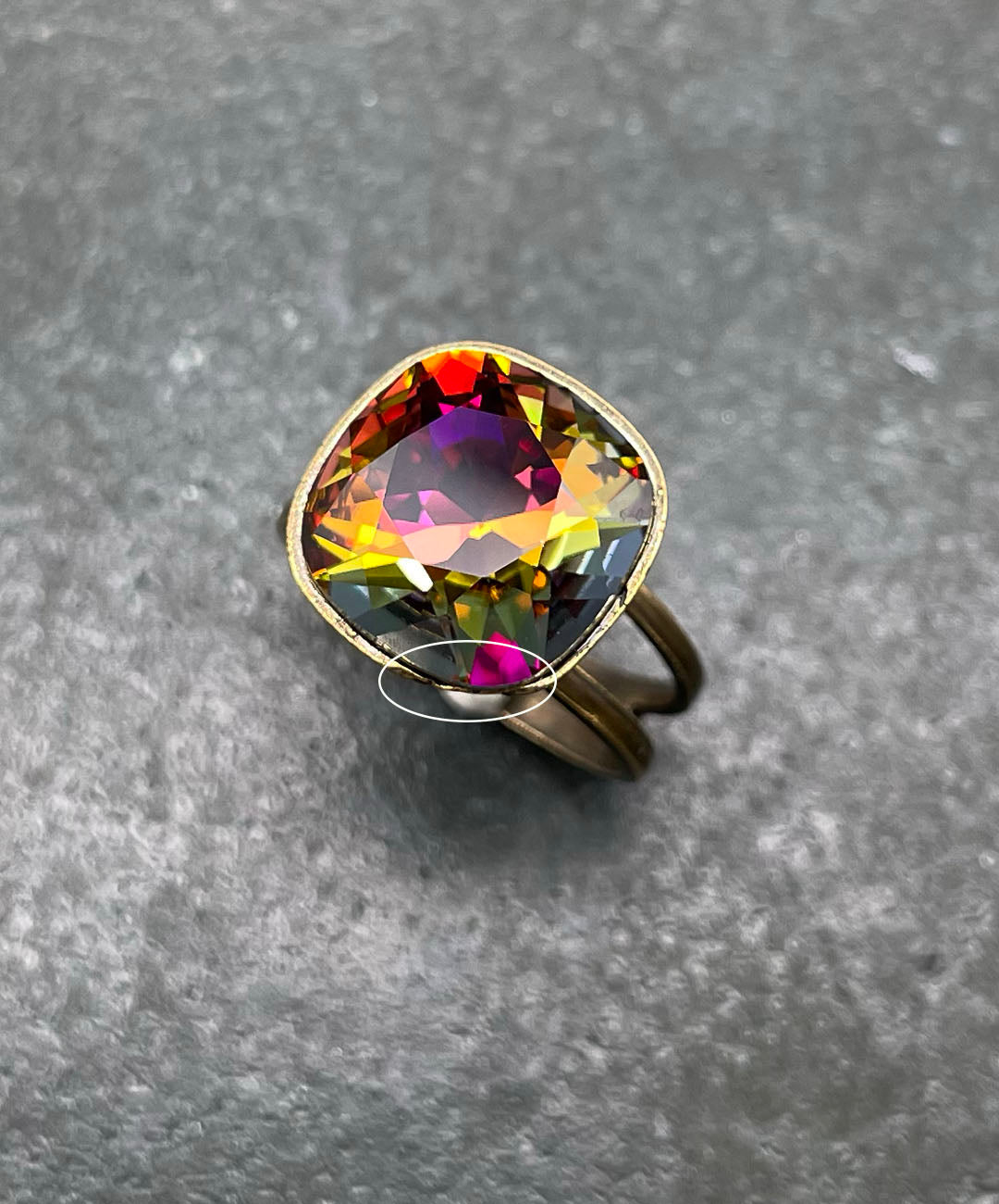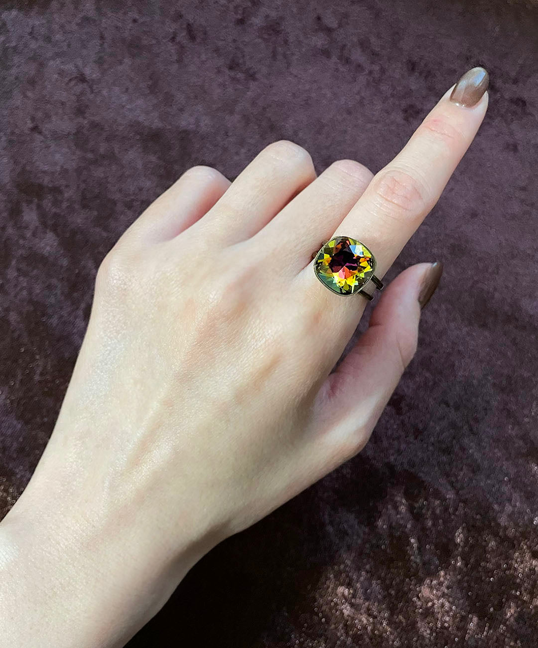 クリスタルの深みある輝きと調和する、シックなゴールドトーンの石枠にセット。ミニマルでモダンなデザインでありながら、ヴィンテージムード漂う古美色と、さりげなく主張するリングアームのデザインもポイントです。