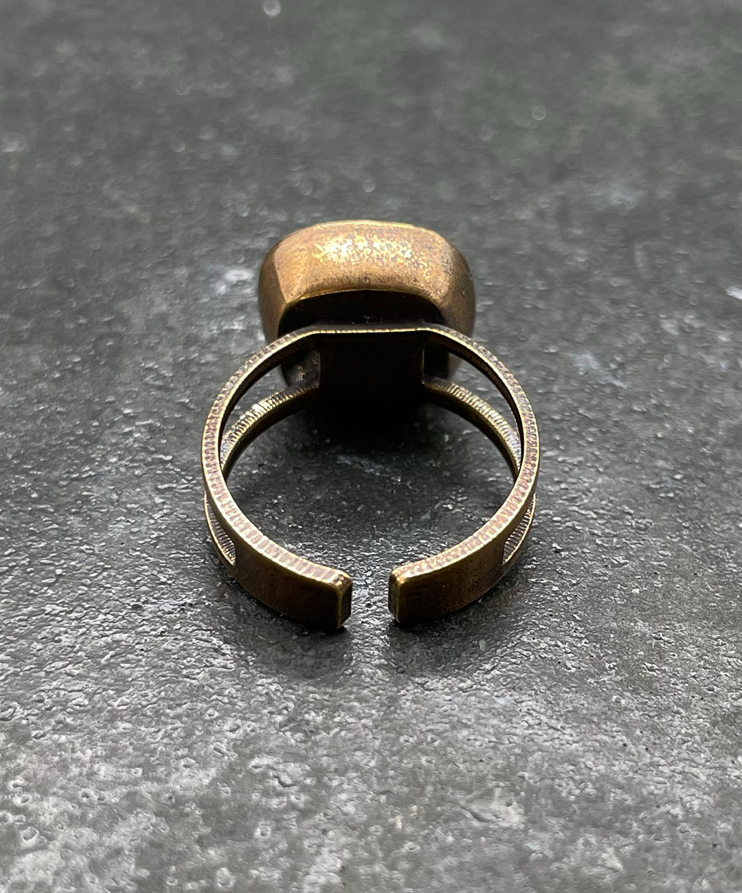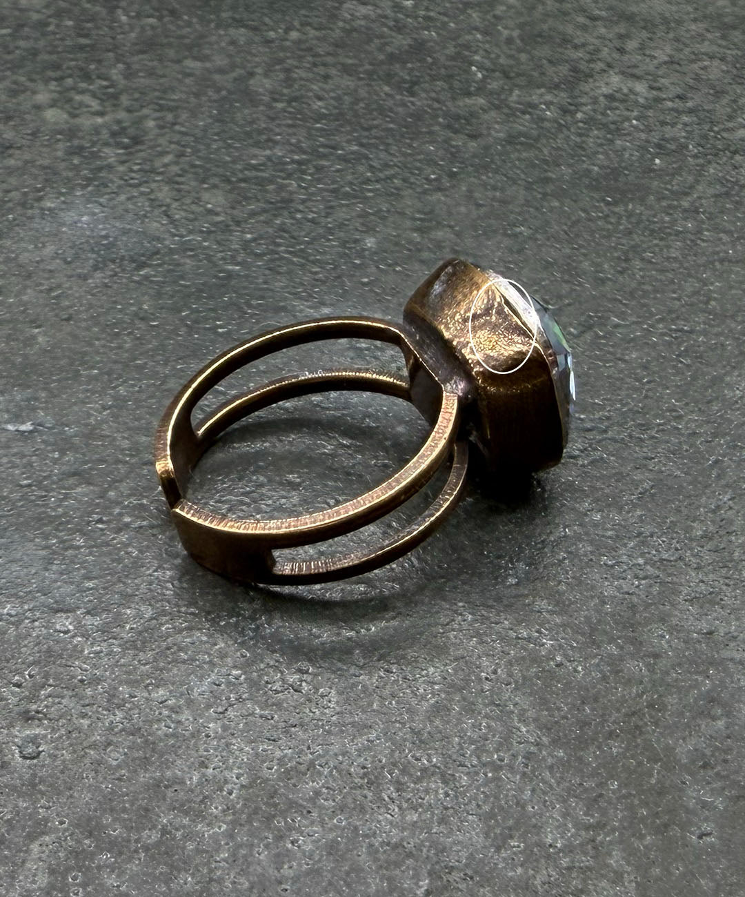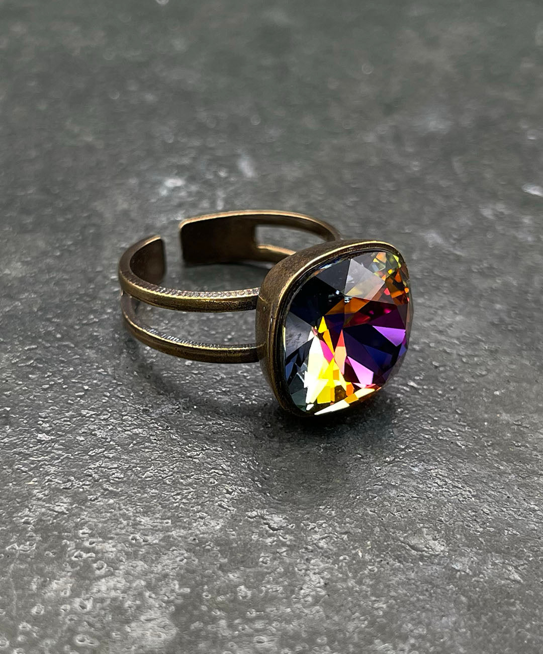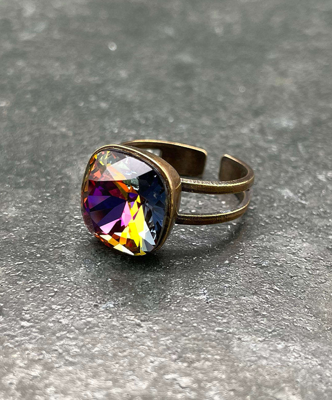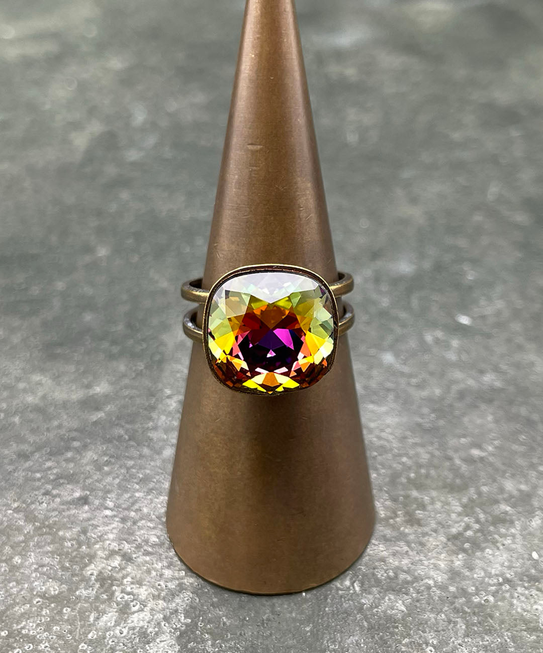 クリスタルの深みある輝きと調和する、シックなゴールドトーンの石枠にセット。ミニマルでモダンなデザインでありながら、ヴィンテージムード漂う古美色と、さりげなく主張するリングアームのデザインもポイントです。