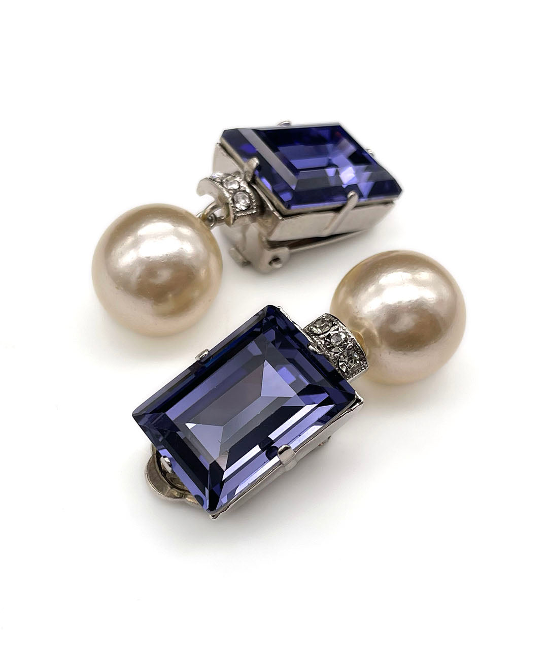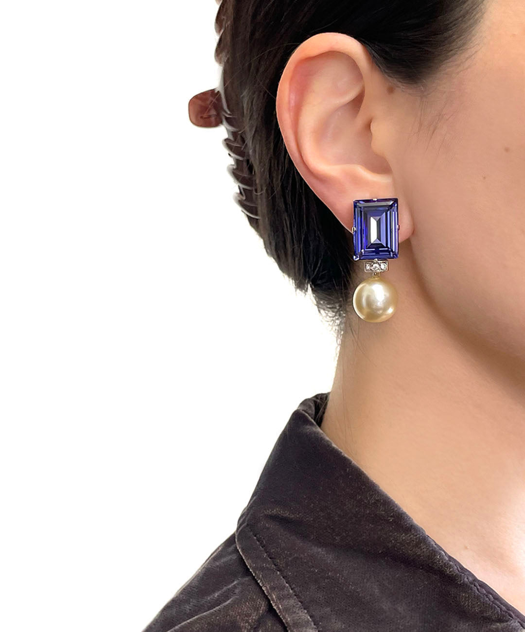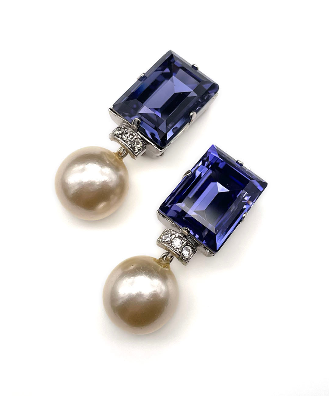 シルバートーンメタルにレクタングルカットのバイオレットガラス、クリアストーンがセットされ、先端にアイボリーカラーのラウンドパールが揺れます。