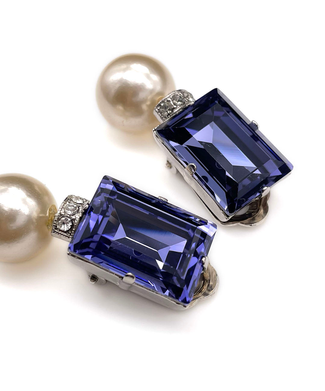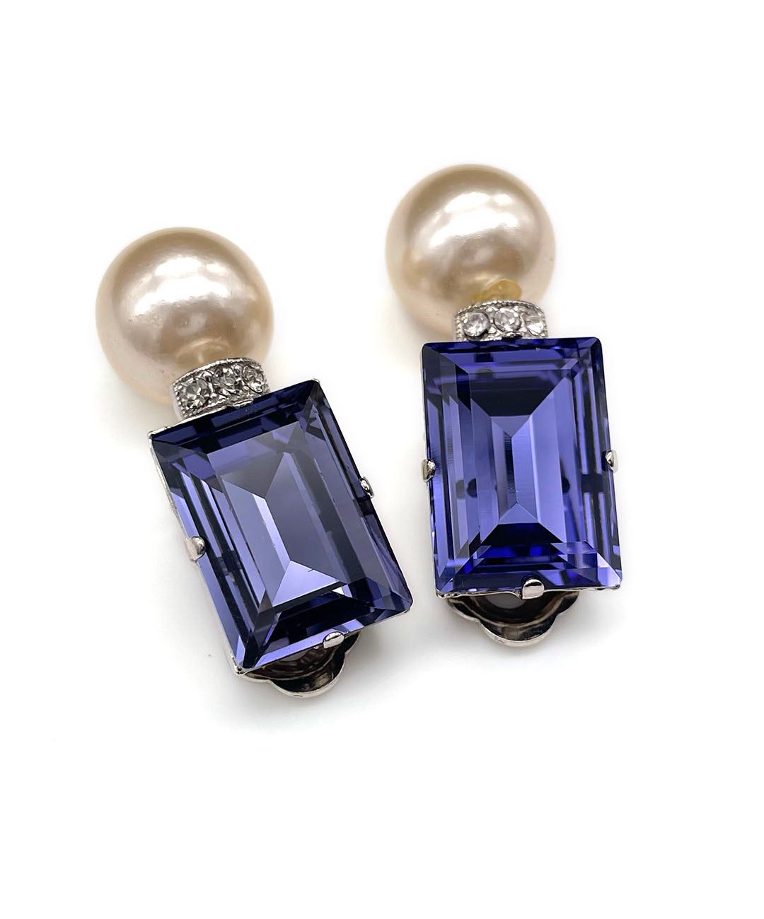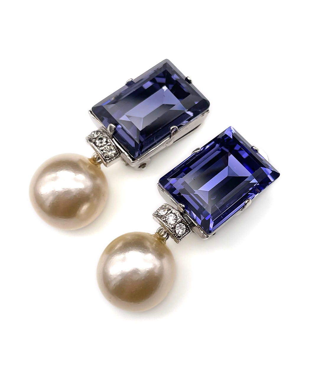 シルバートーンメタルにレクタングルカットのバイオレットガラス、クリアストーンがセットされ、先端にアイボリーカラーのラウンドパールが揺れます。