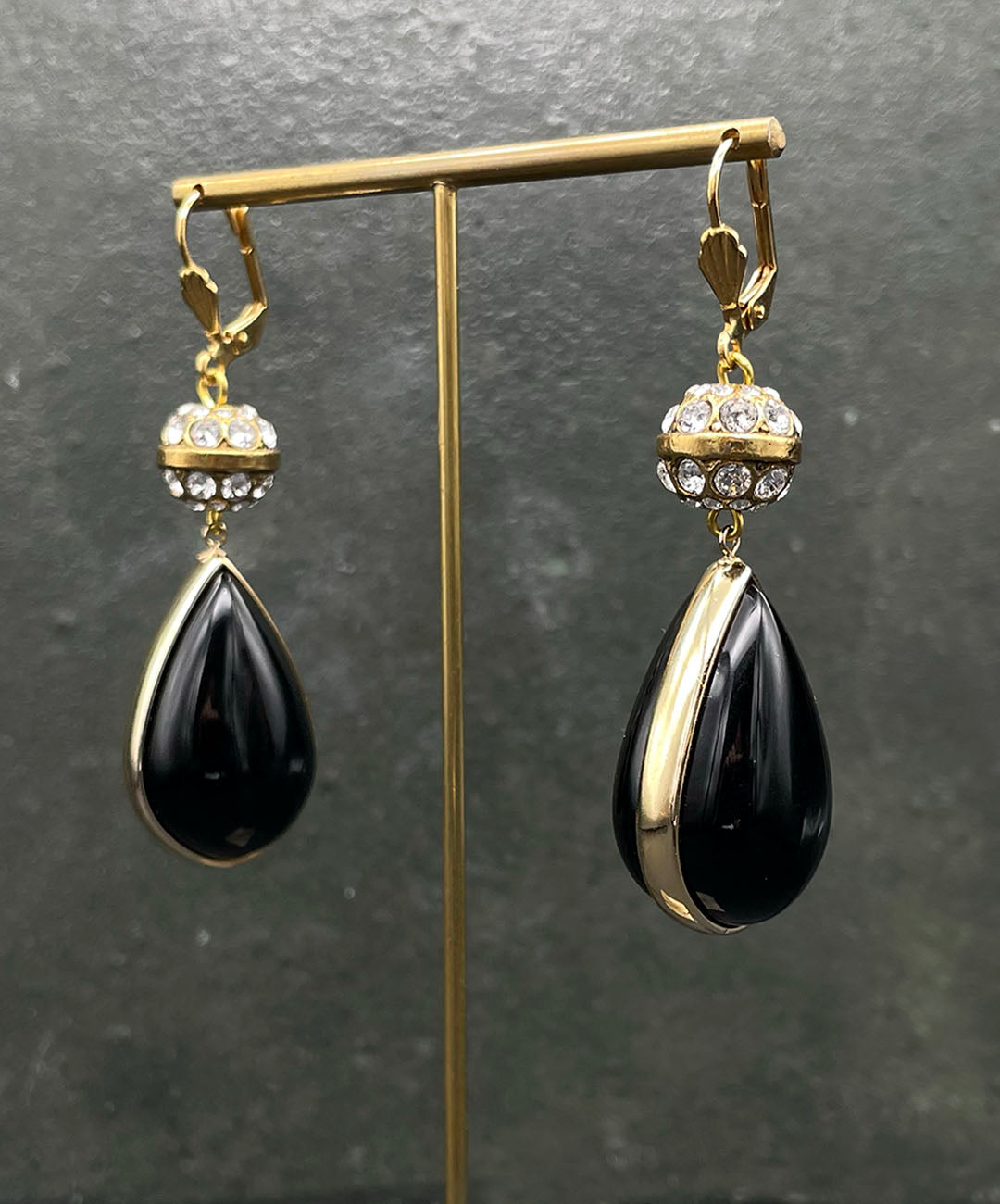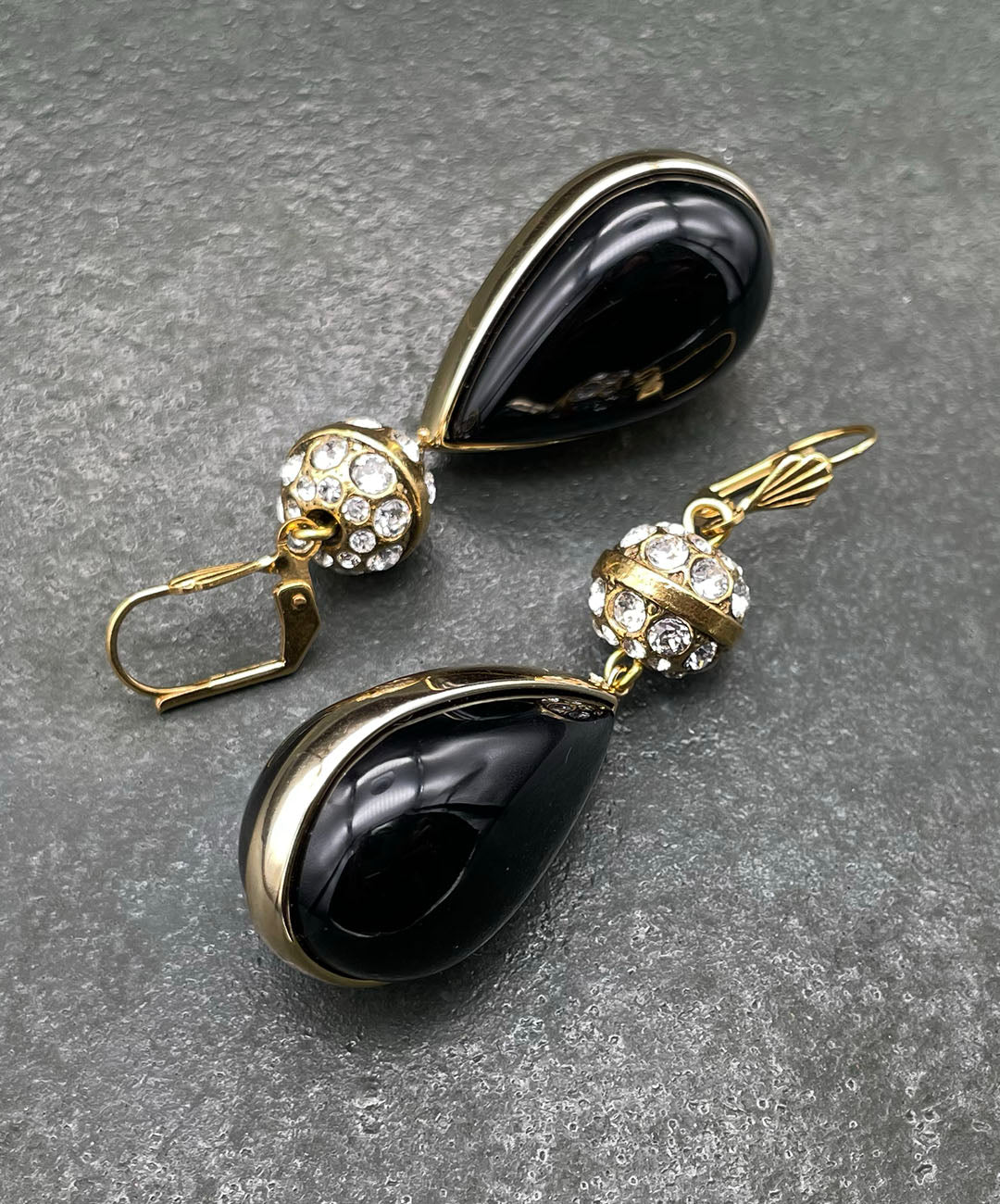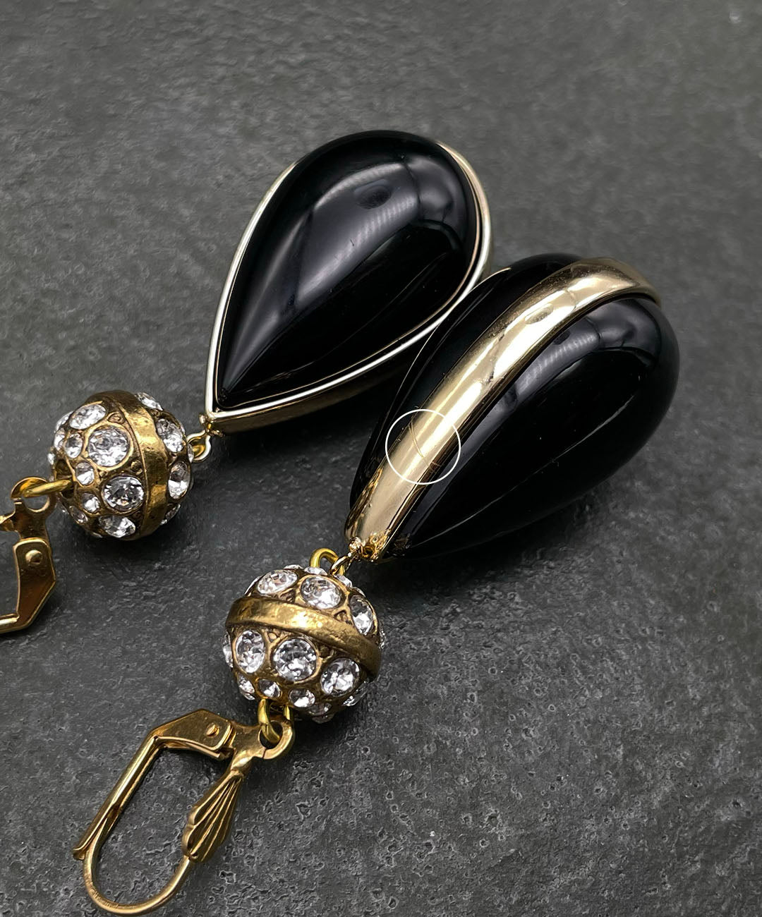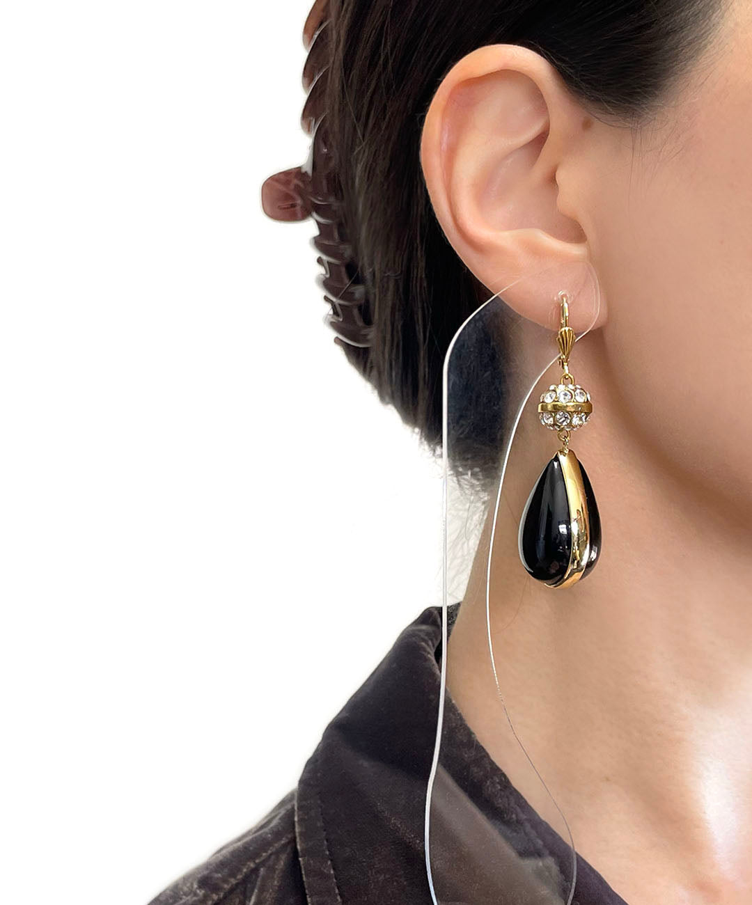 クリアガラスが敷き詰められたゴールドトーンの球体モチーフから、ゴールドのラインが艶めくブラックの大ぶりティアドロップモチーフが垂れ下がるデザイン。