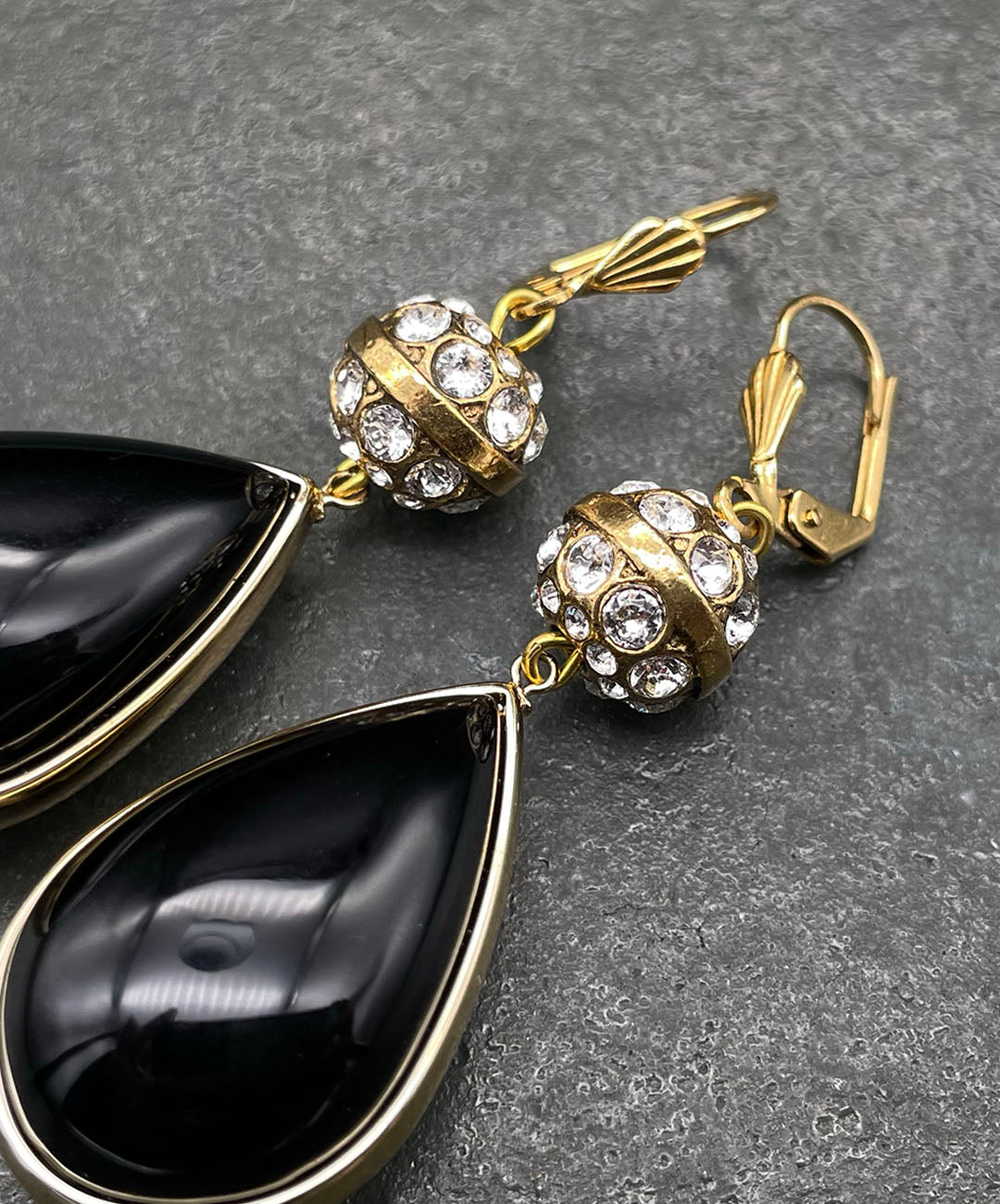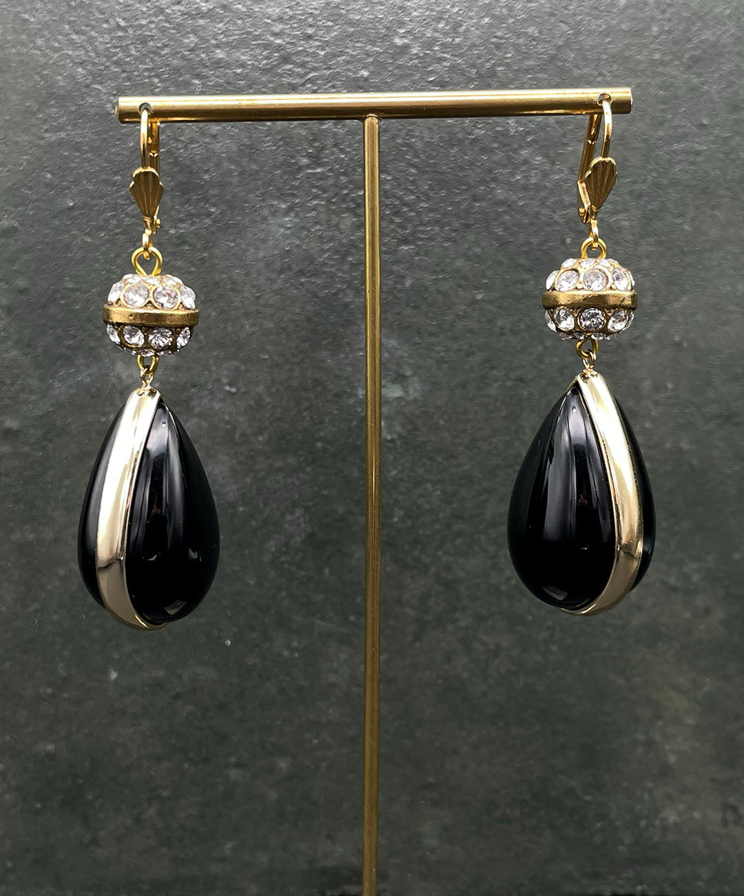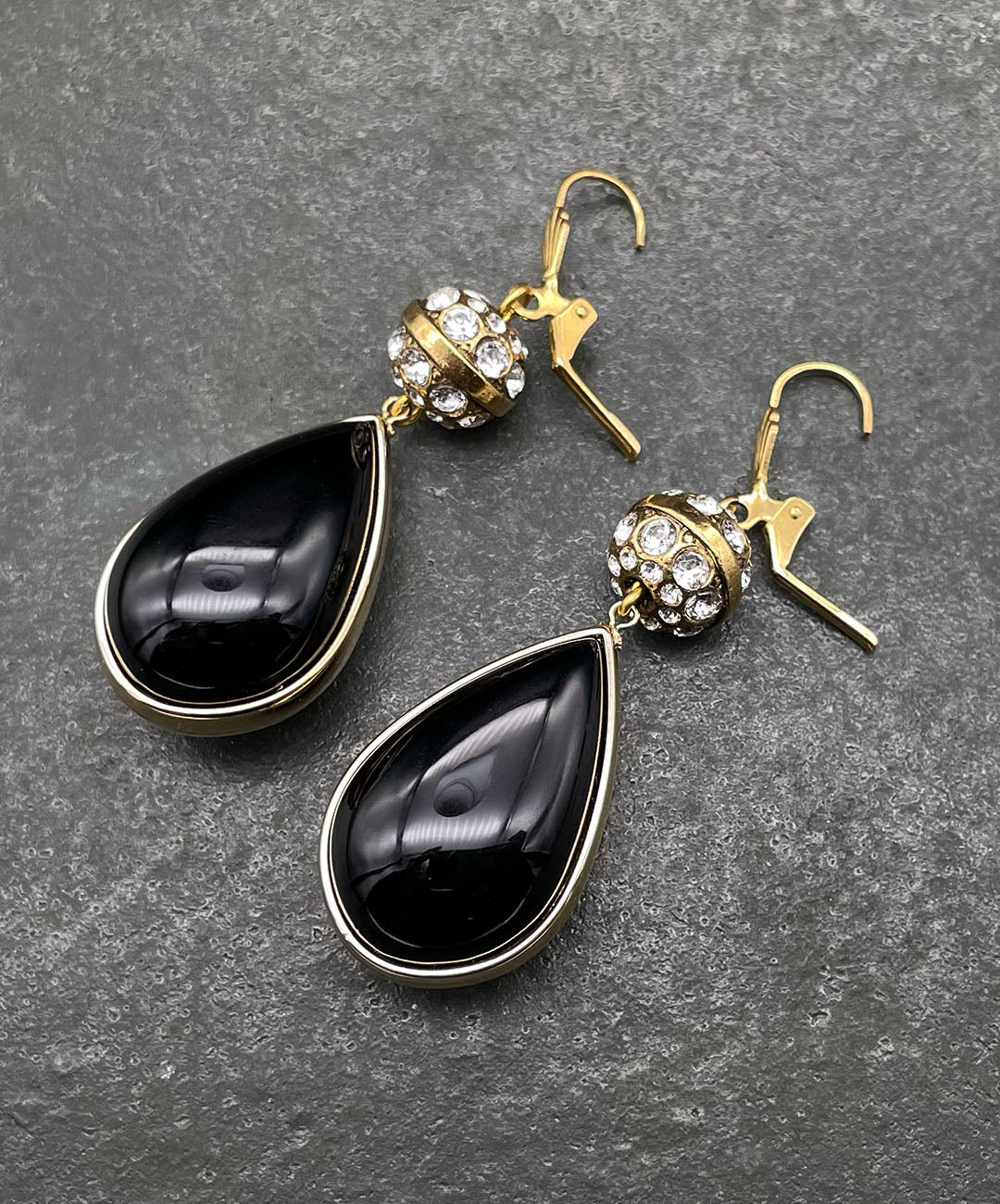 クリアガラスが敷き詰められたゴールドトーンの球体モチーフから、ゴールドのラインが艶めくブラックの大ぶりティアドロップモチーフが垂れ下がるデザイン。