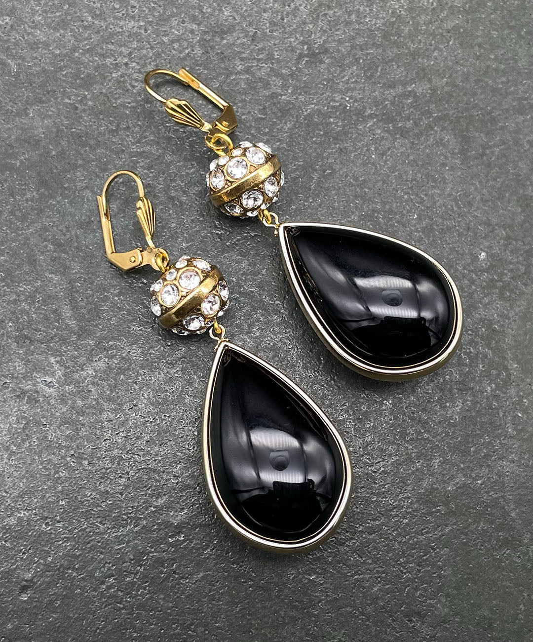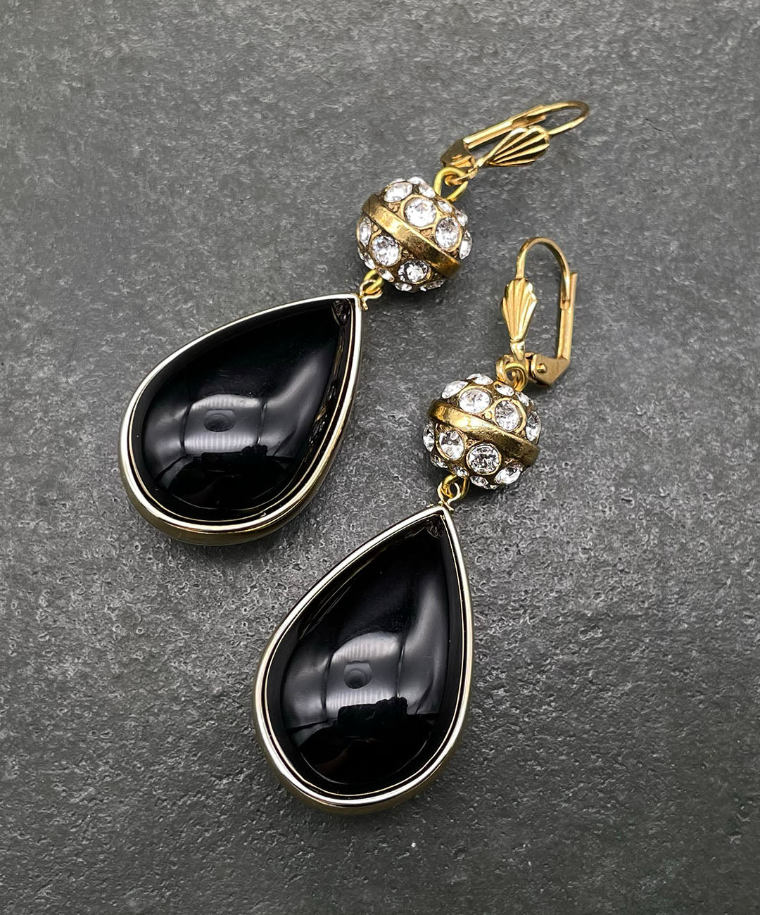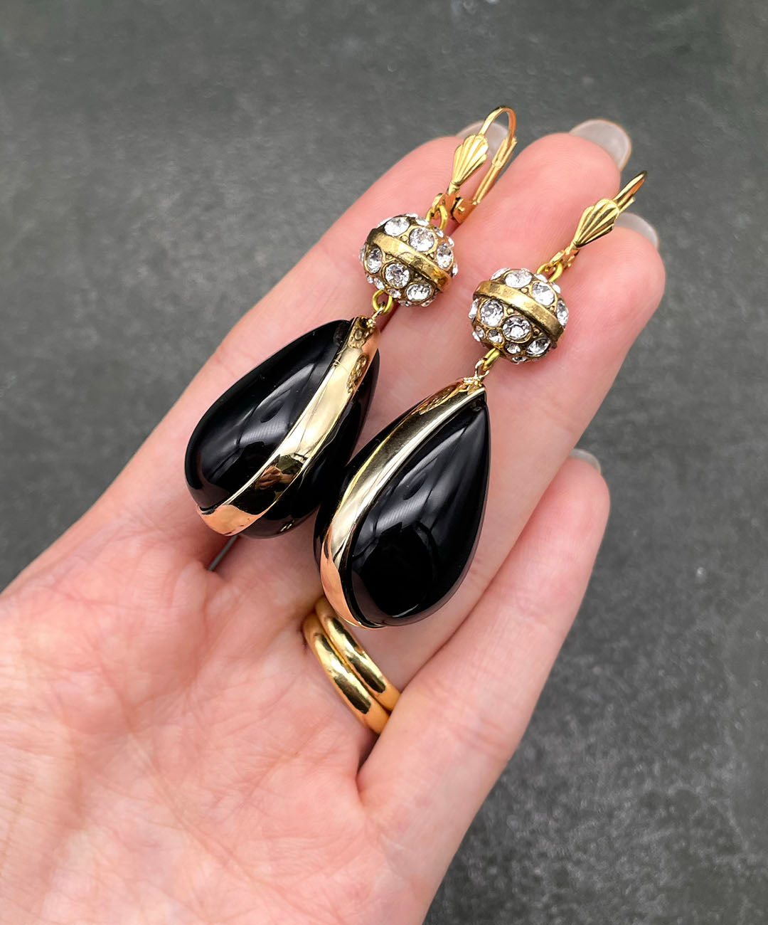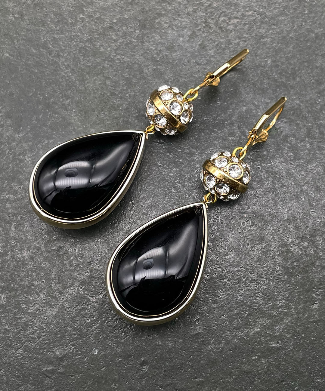 クリアガラスが敷き詰められたゴールドトーンの球体モチーフから、ゴールドのラインが艶めくブラックの大ぶりティアドロップモチーフが垂れ下がるデザイン。