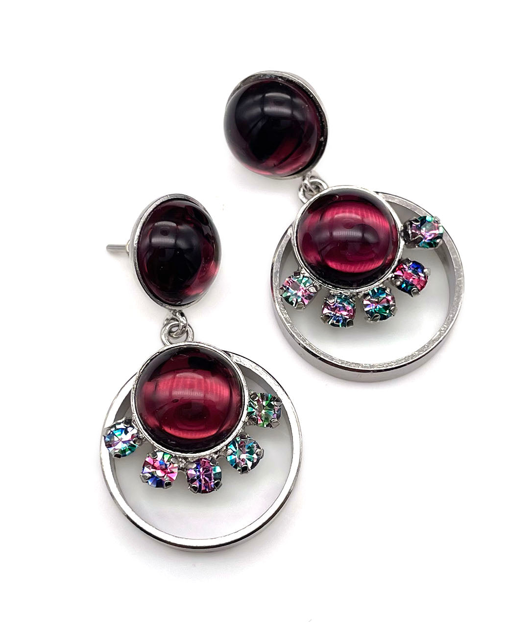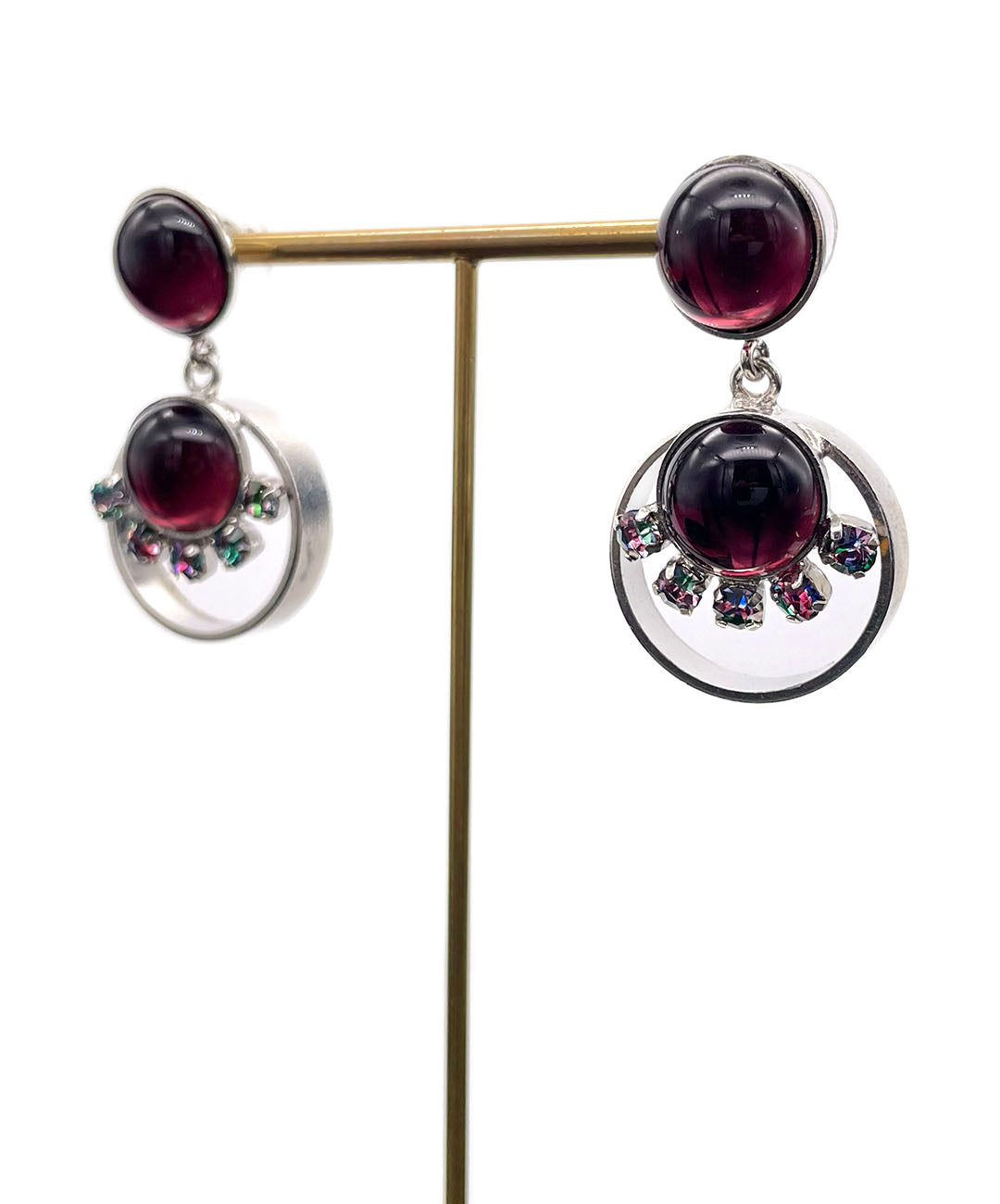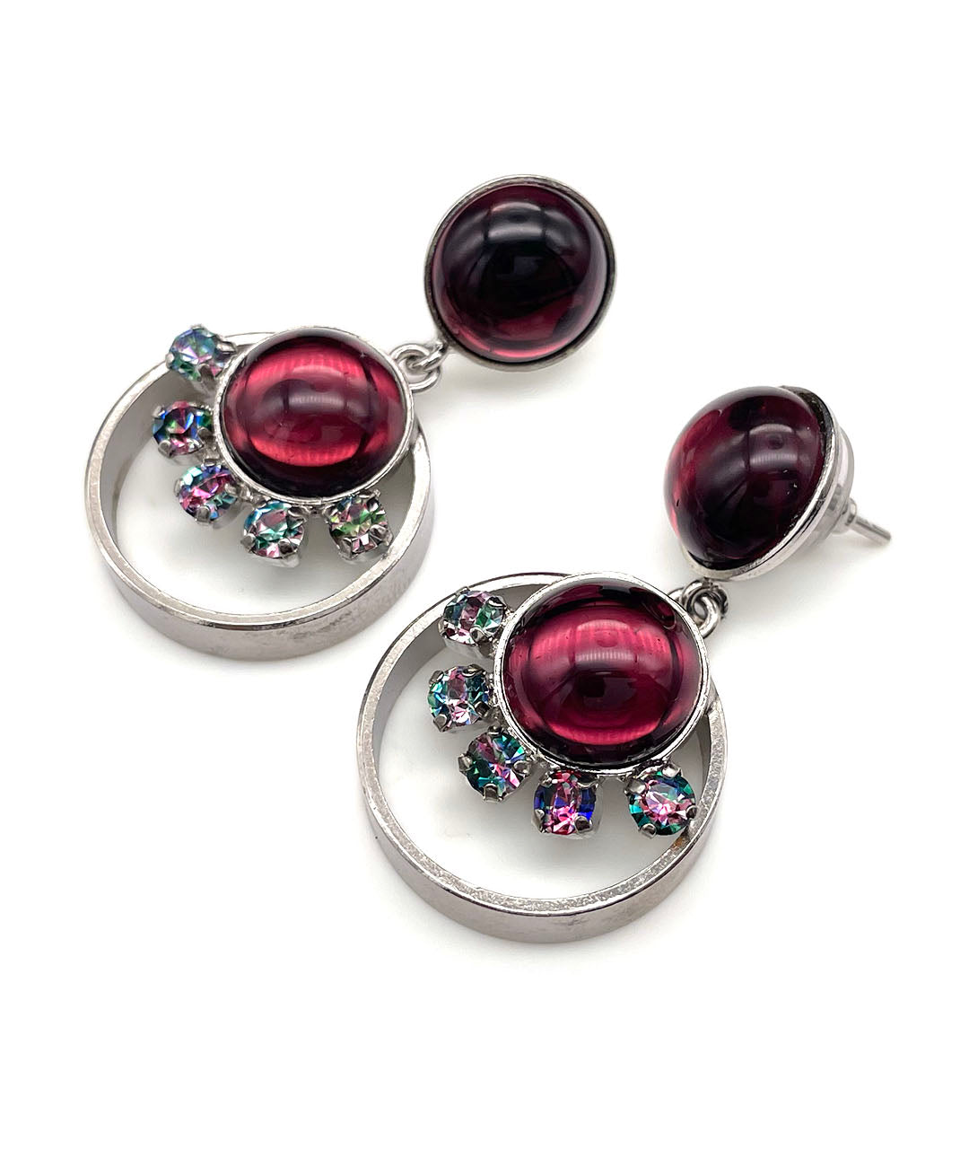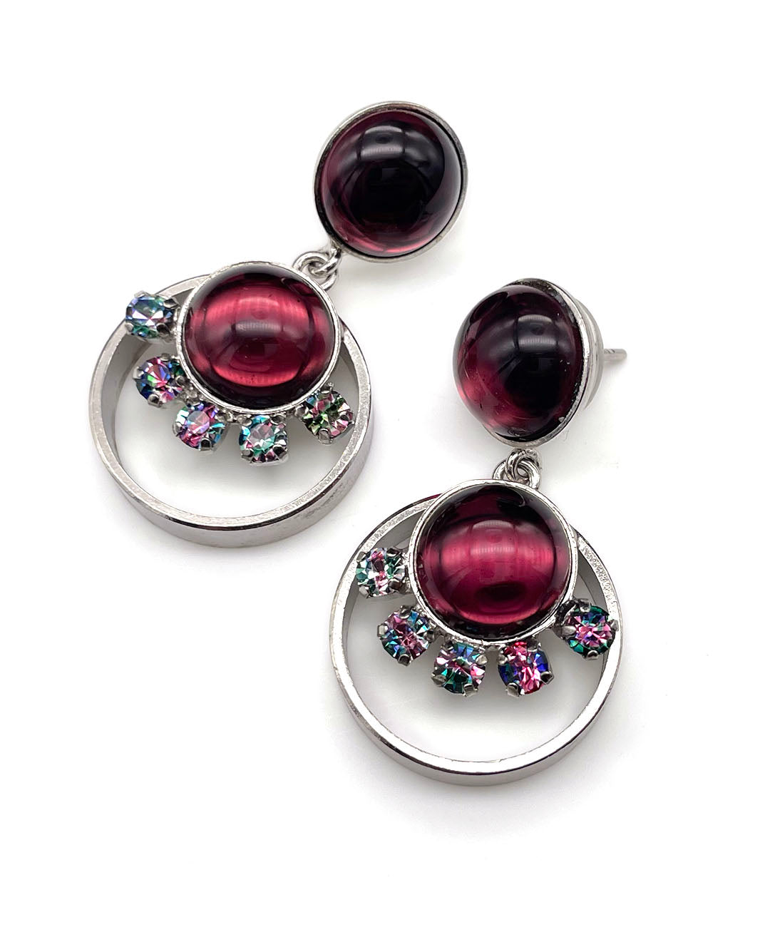 シルバートーンのオープンワークメタルに、バーガンディーのカボションガラスと、爪留めされたアイリスガラスがあしらわれて揺らめくデザイン。