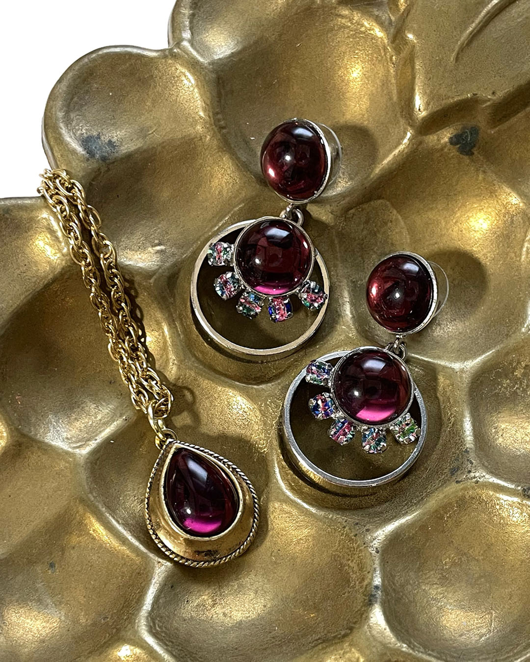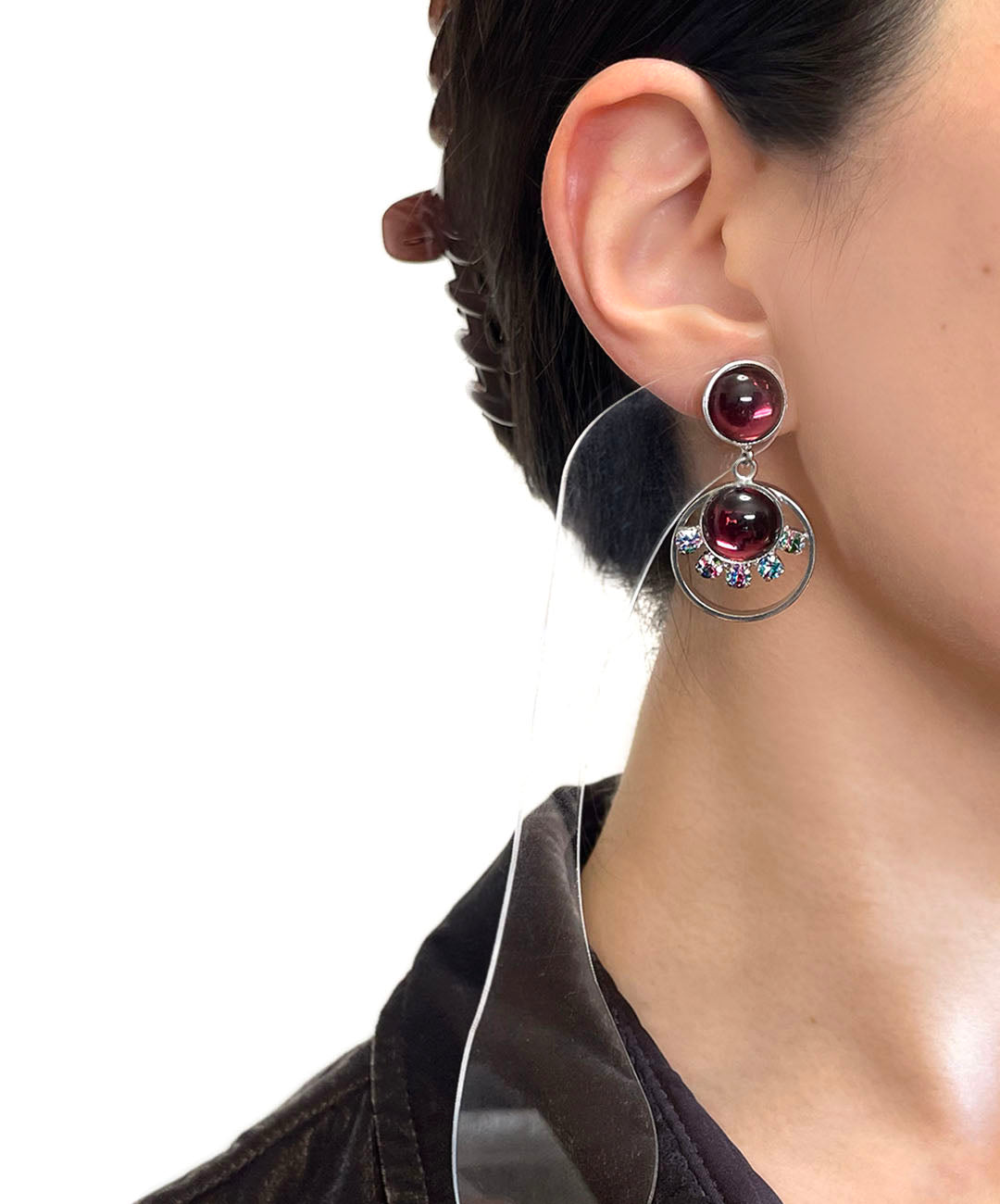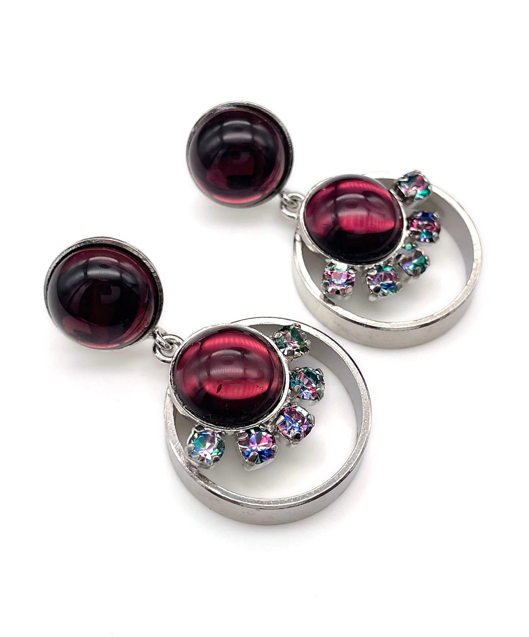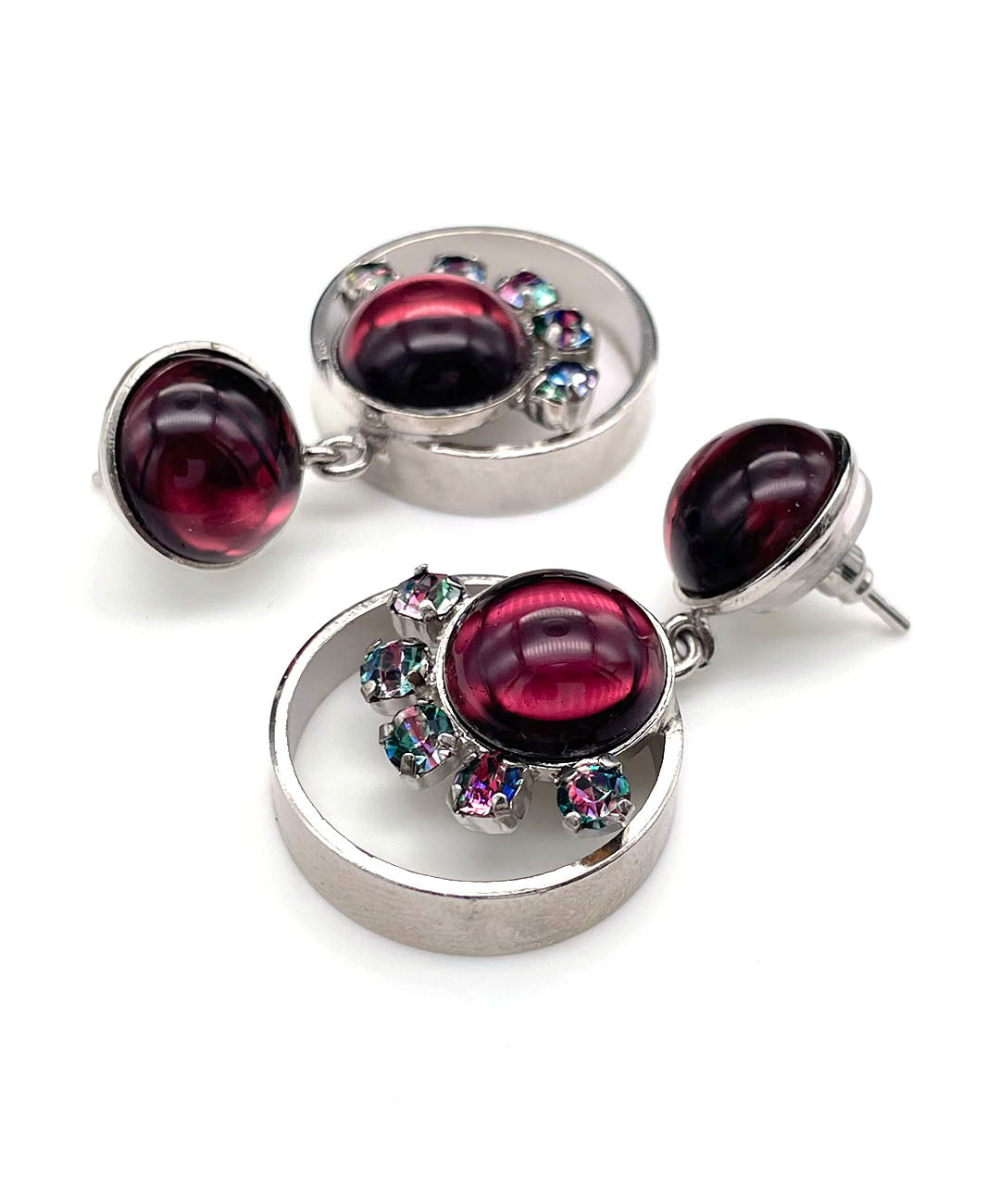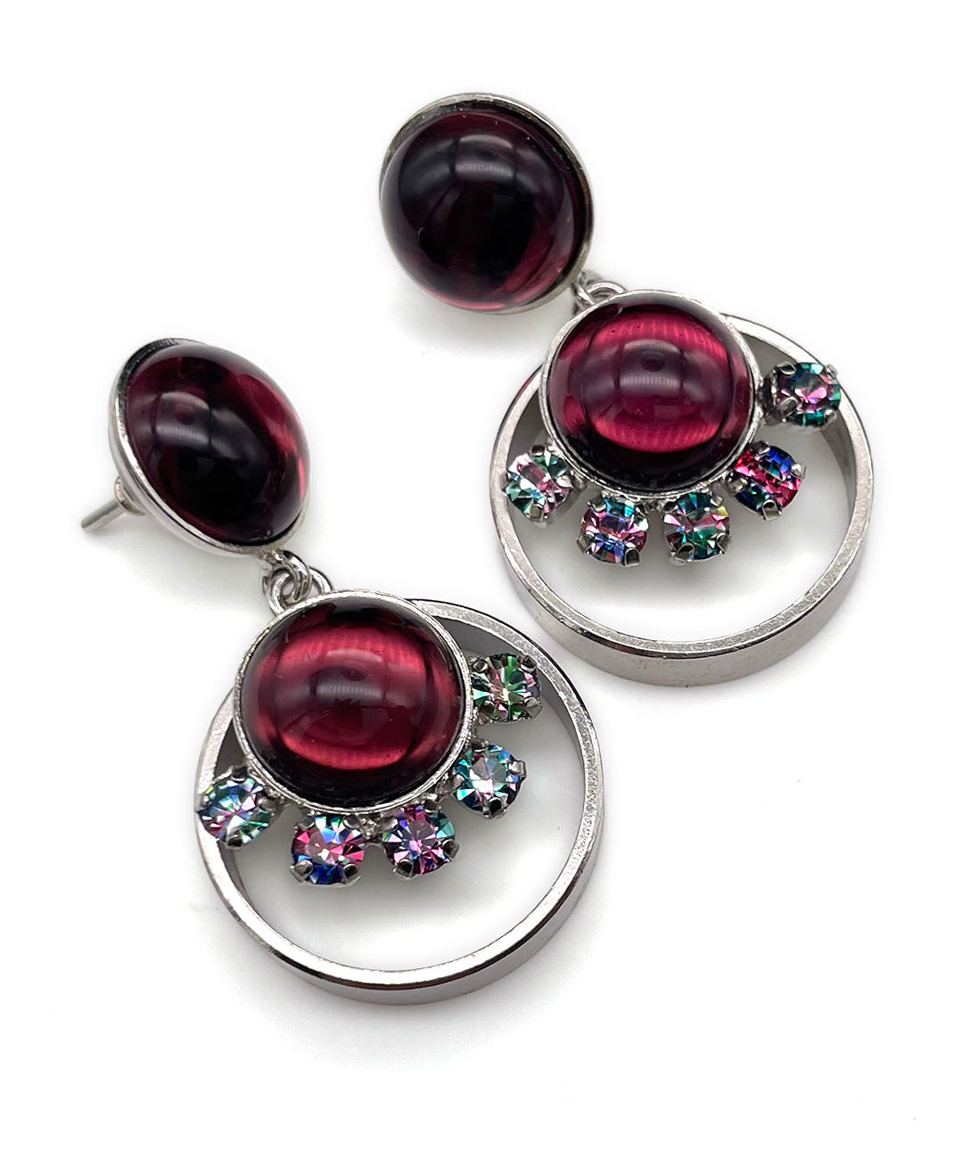 シルバートーンのオープンワークメタルに、バーガンディーのカボションガラスと、爪留めされたアイリスガラスがあしらわれて揺らめくデザイン。