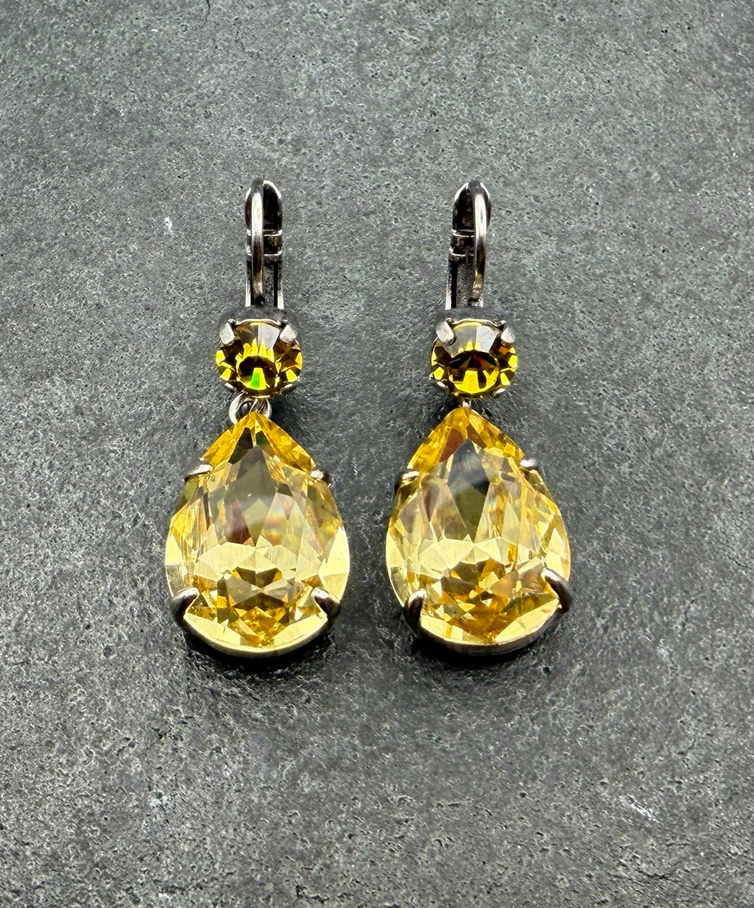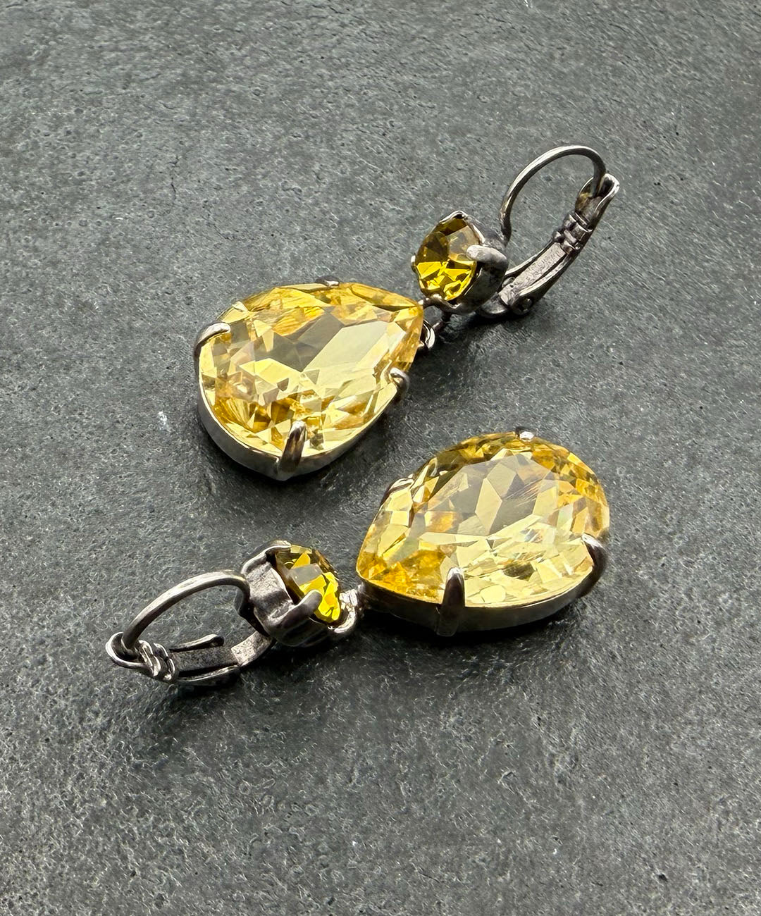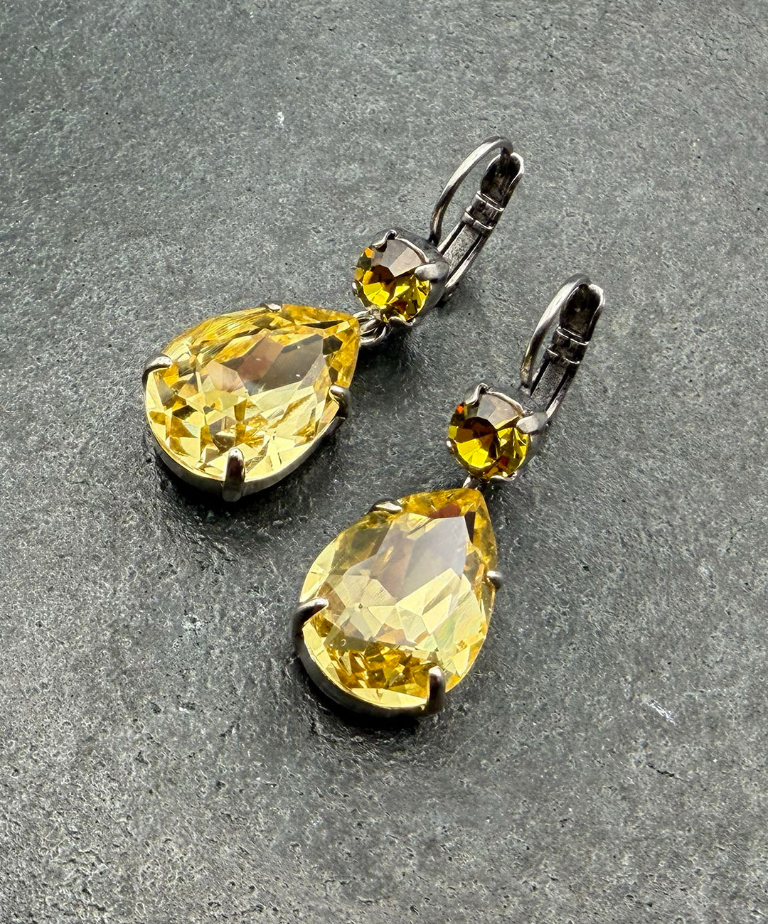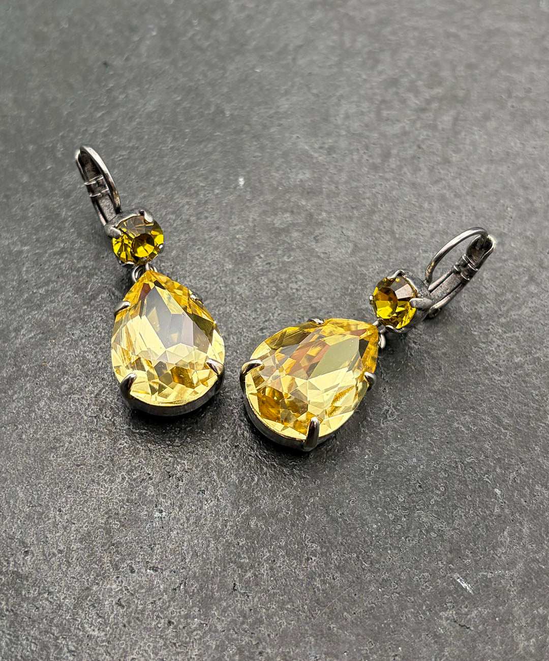 シルバートーンメタルに、ラウンドカット、ティアドロップシェイプのイエローガラスが爪留めされて揺らめくデザイン。