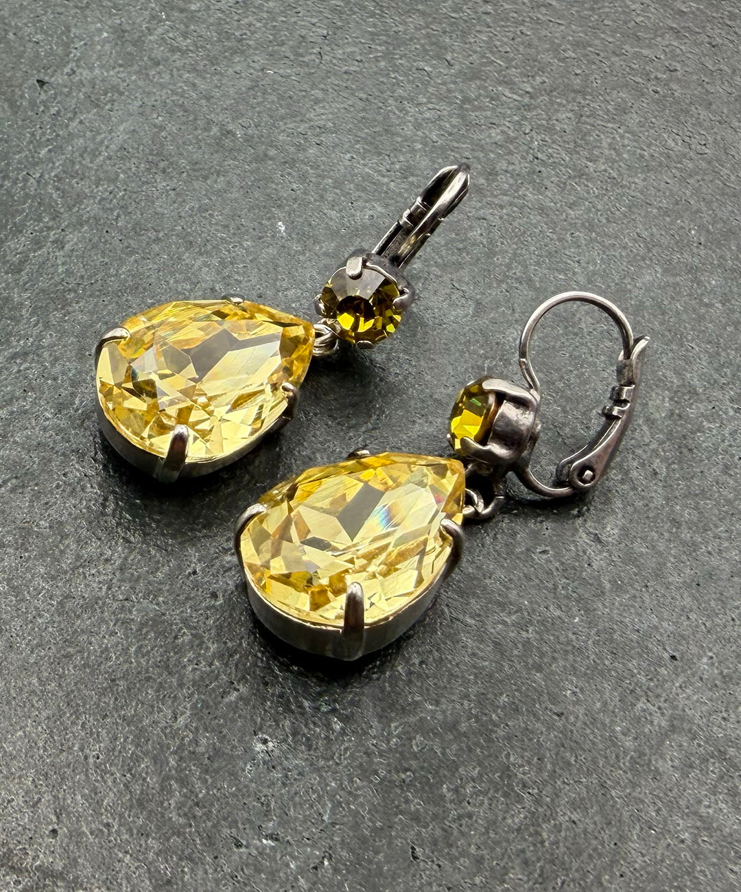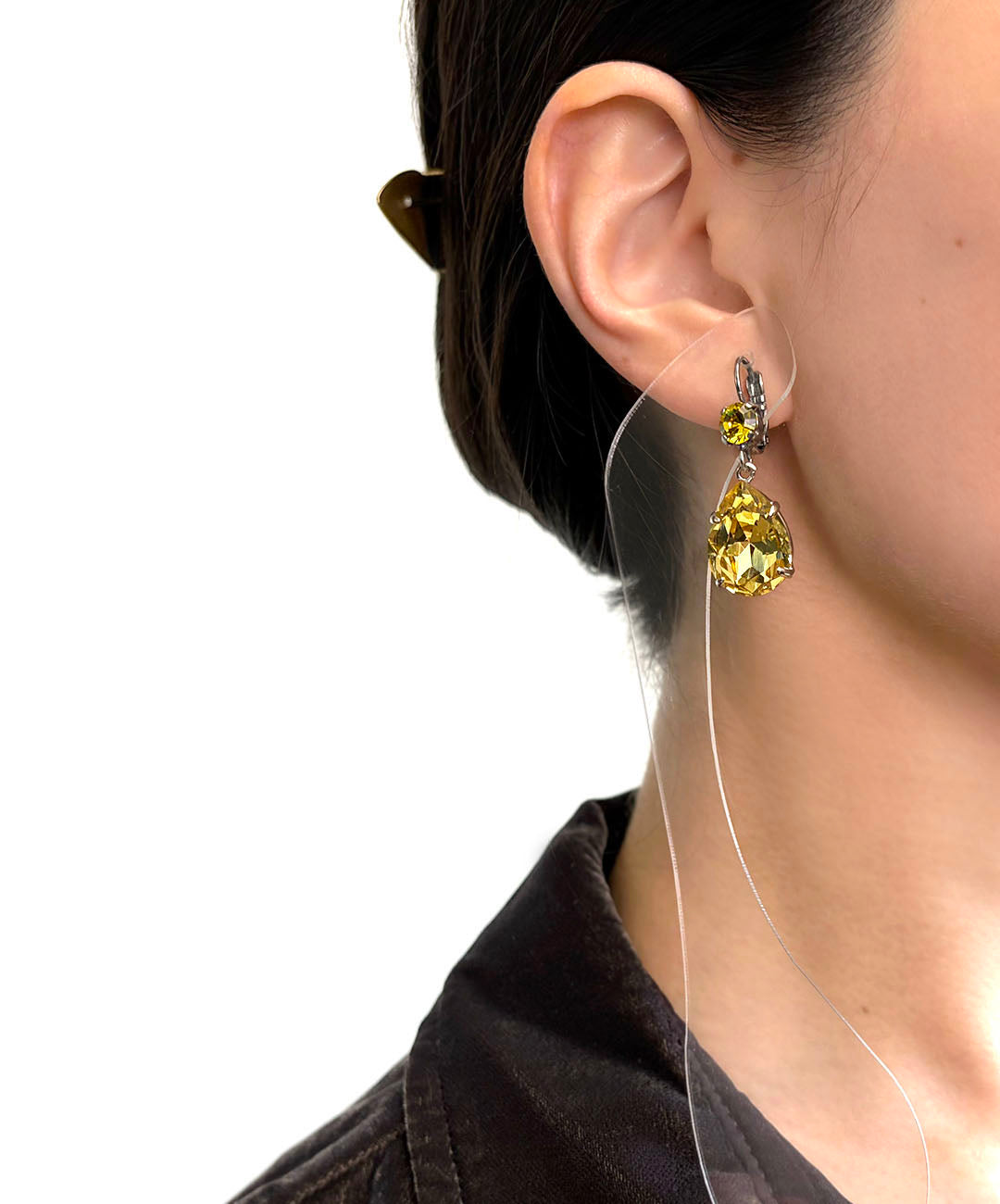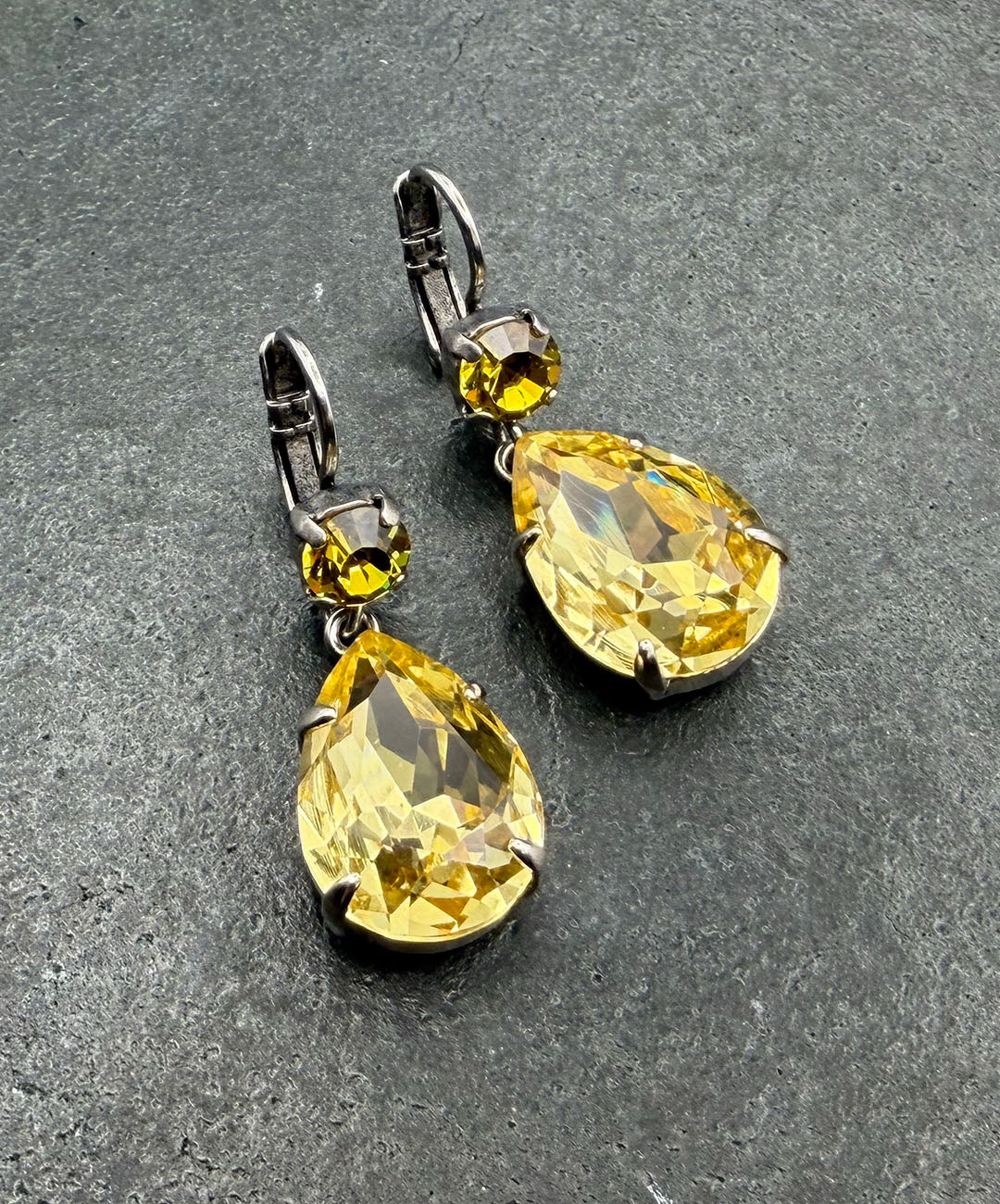 シルバートーンメタルに、ラウンドカット、ティアドロップシェイプのイエローガラスが爪留めされて揺らめくデザイン。