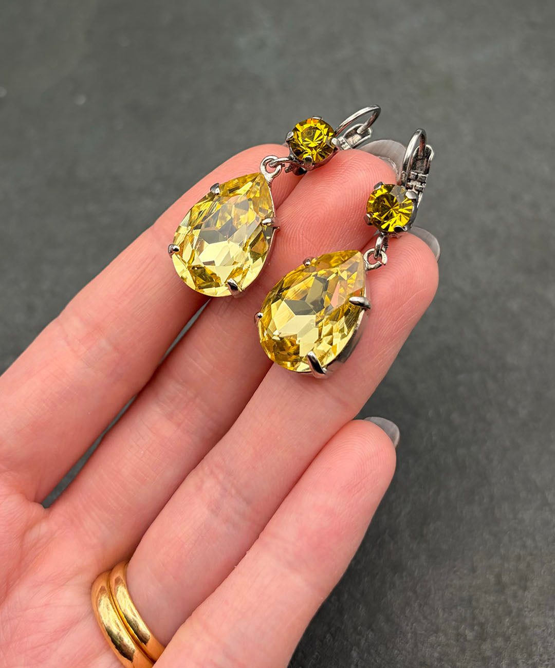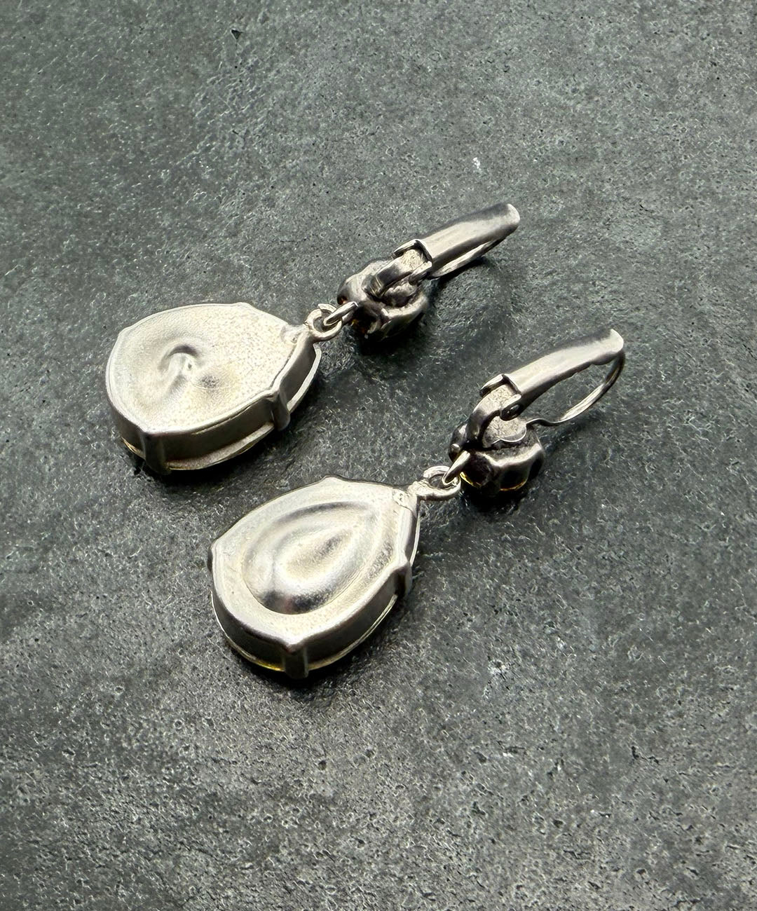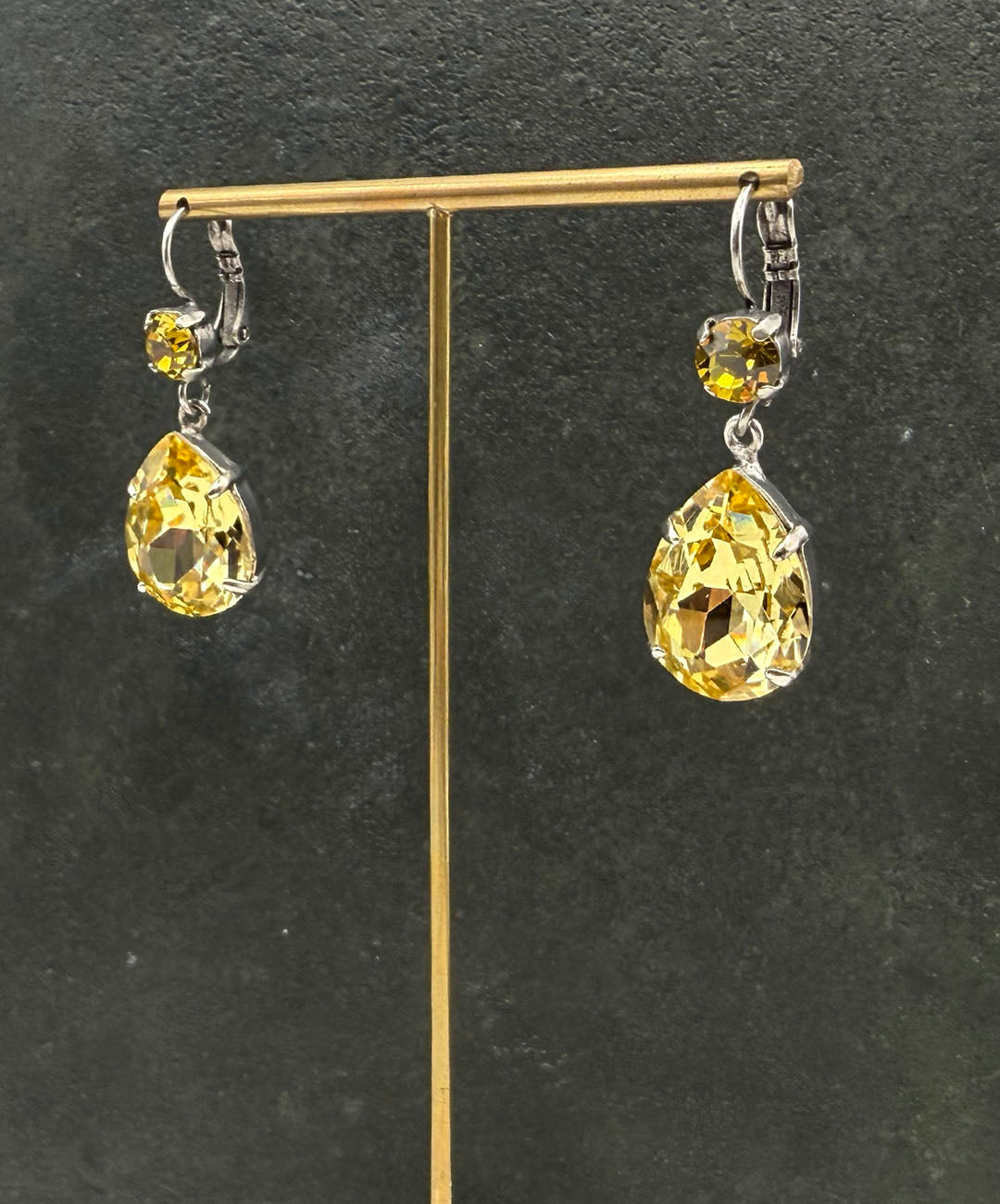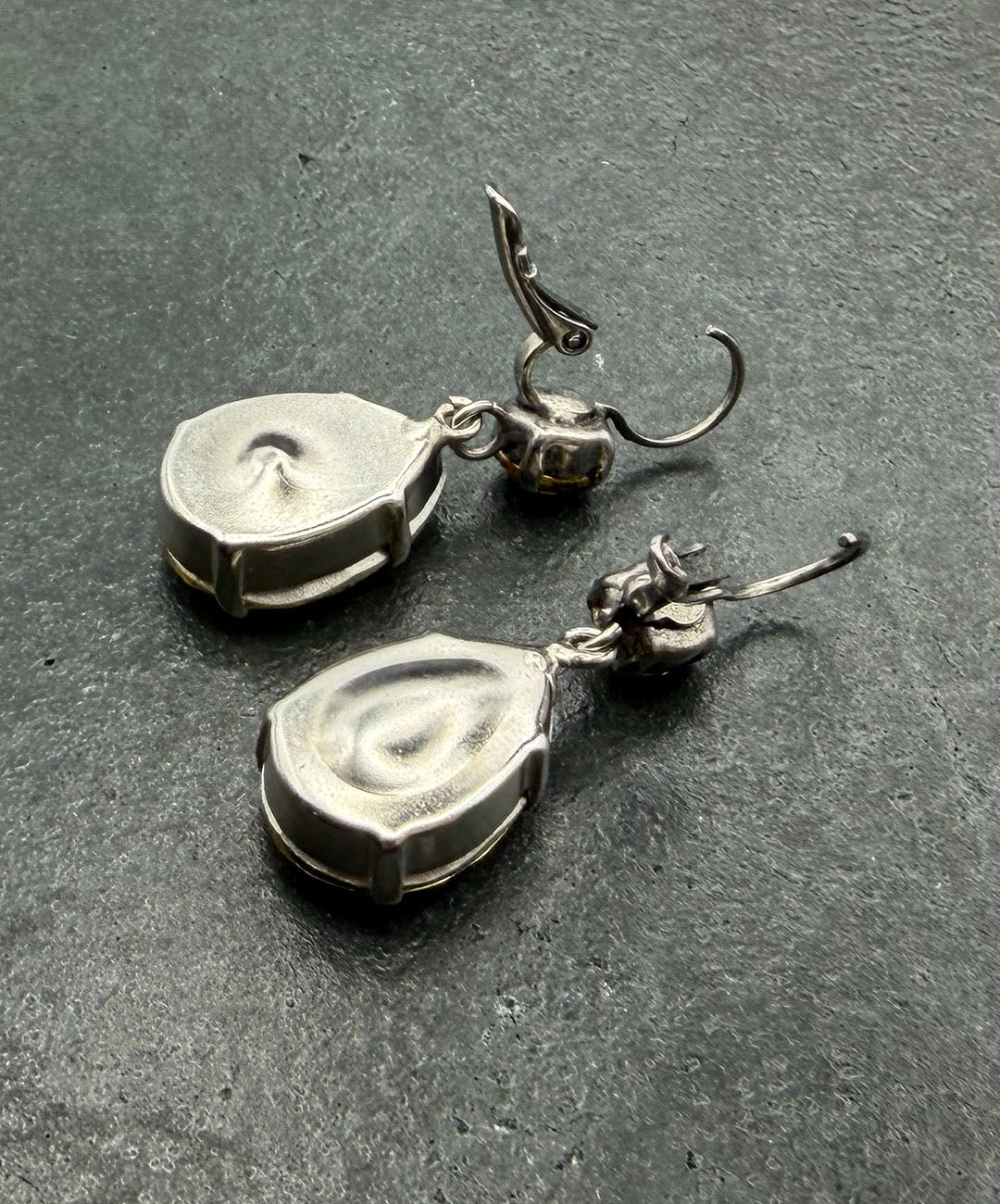 シルバートーンメタルに、ラウンドカット、ティアドロップシェイプのイエローガラスが爪留めされて揺らめくデザイン。