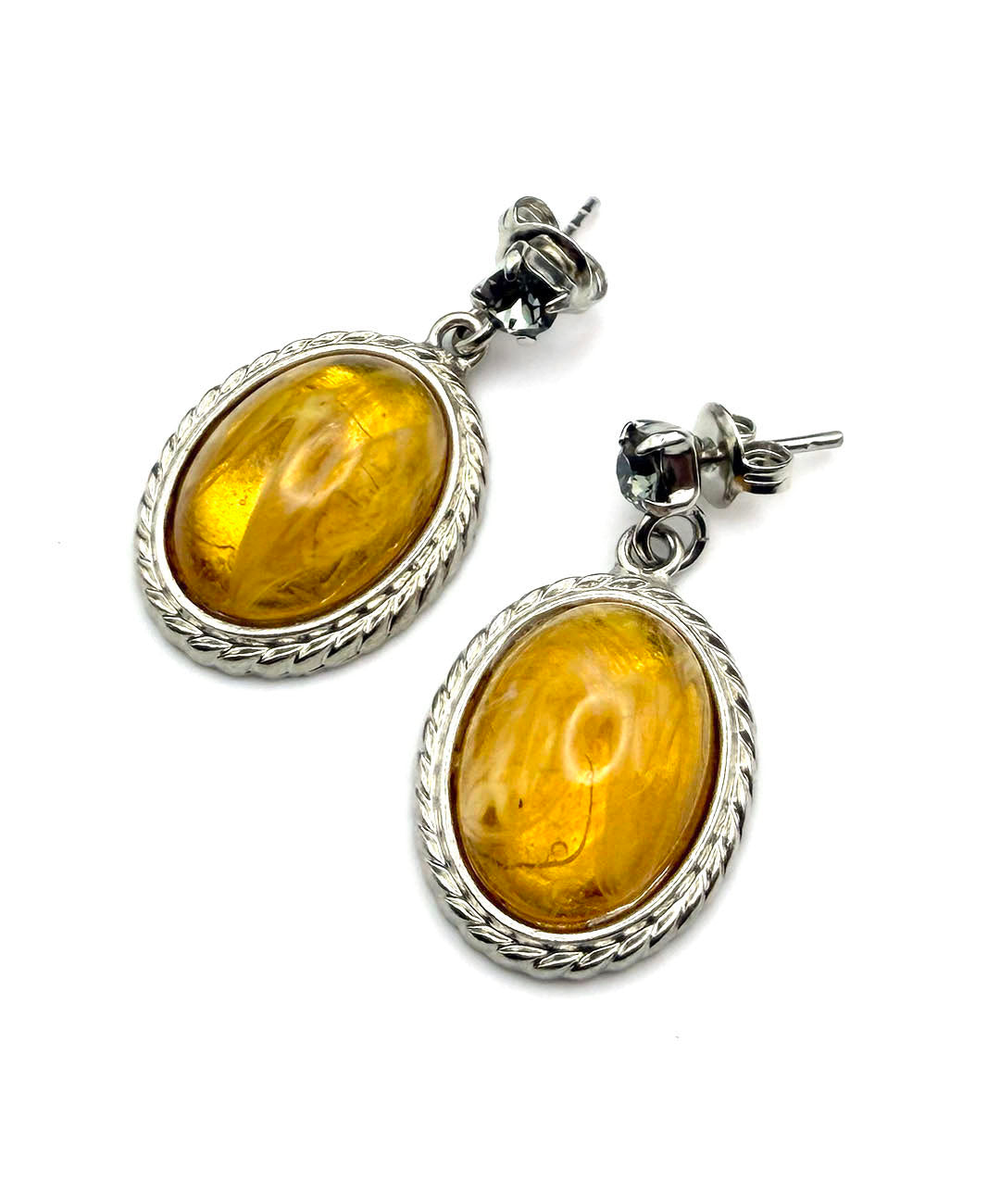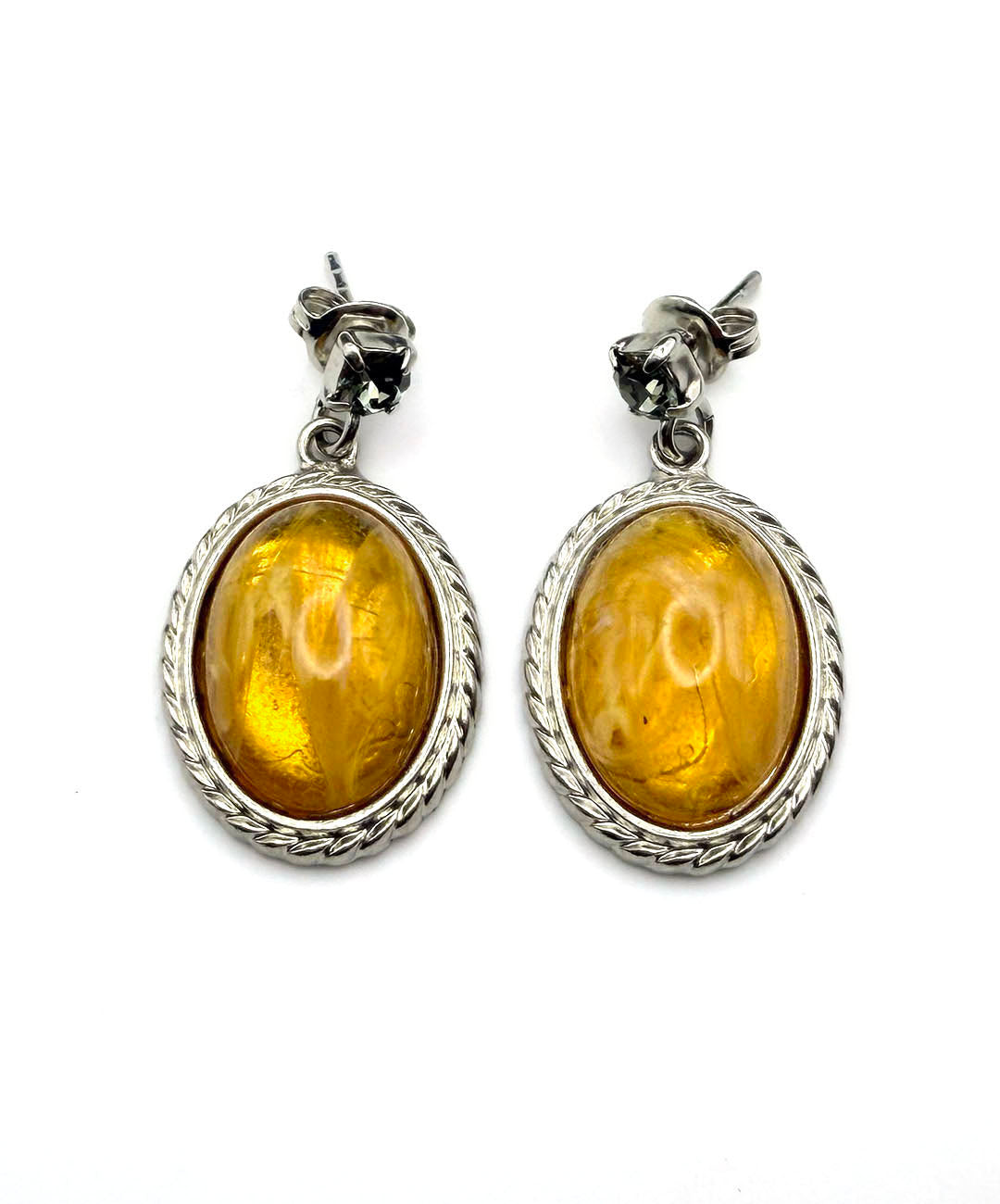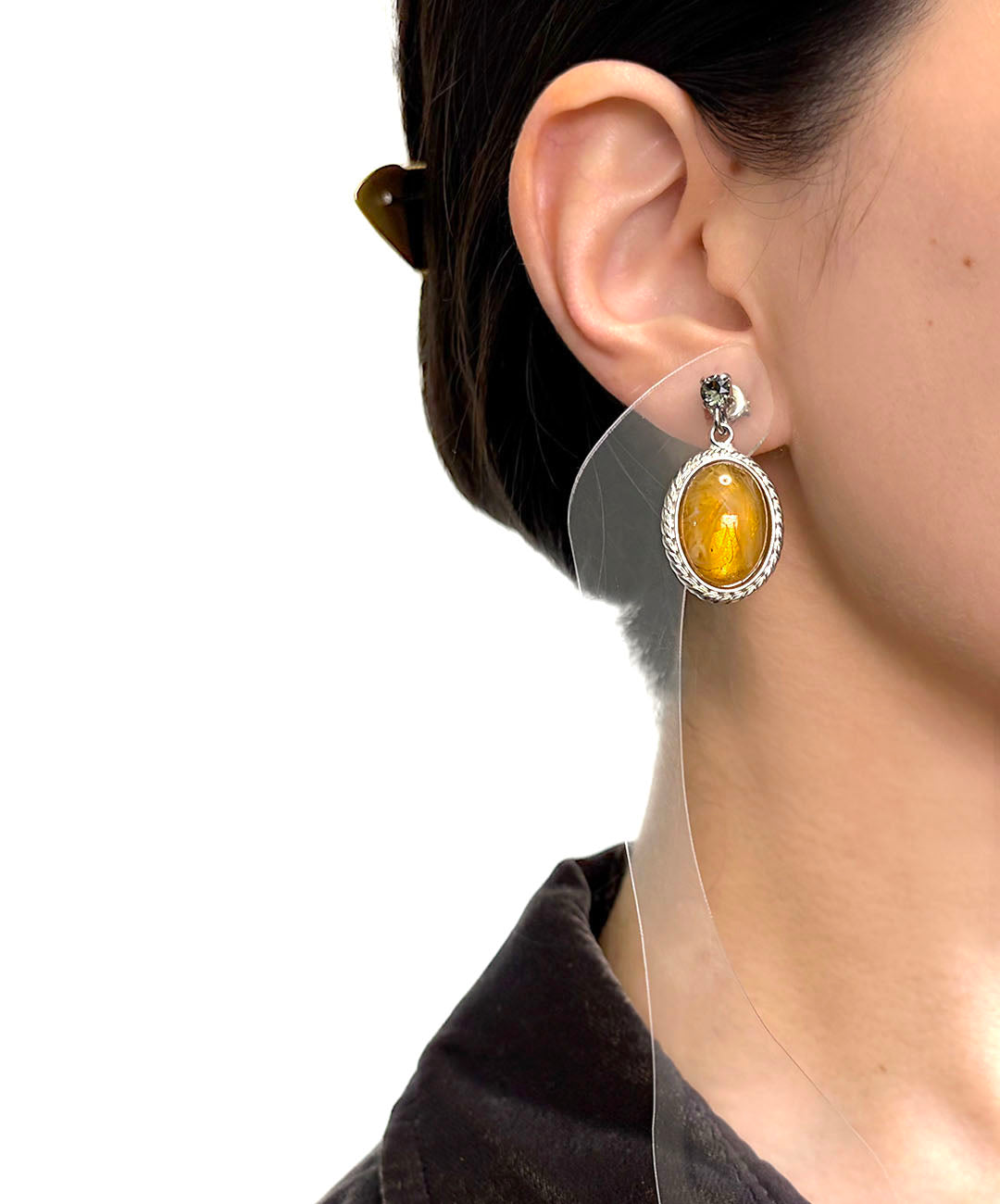 シルバートーンメタルにグレーのストーンが爪留めされ、ゴールデンアンバーのオーバルカボションガラスが垂れ下がり揺らめくデザインです。
