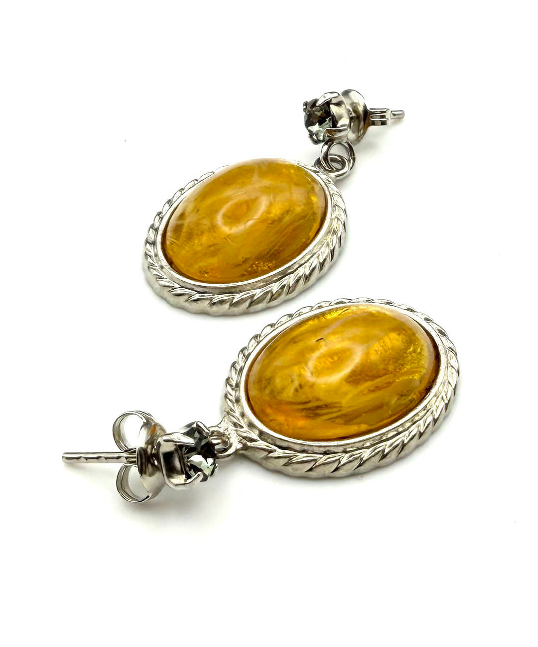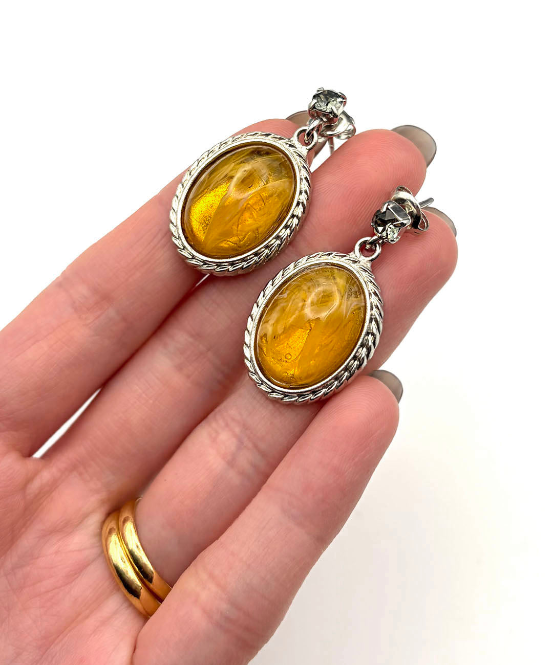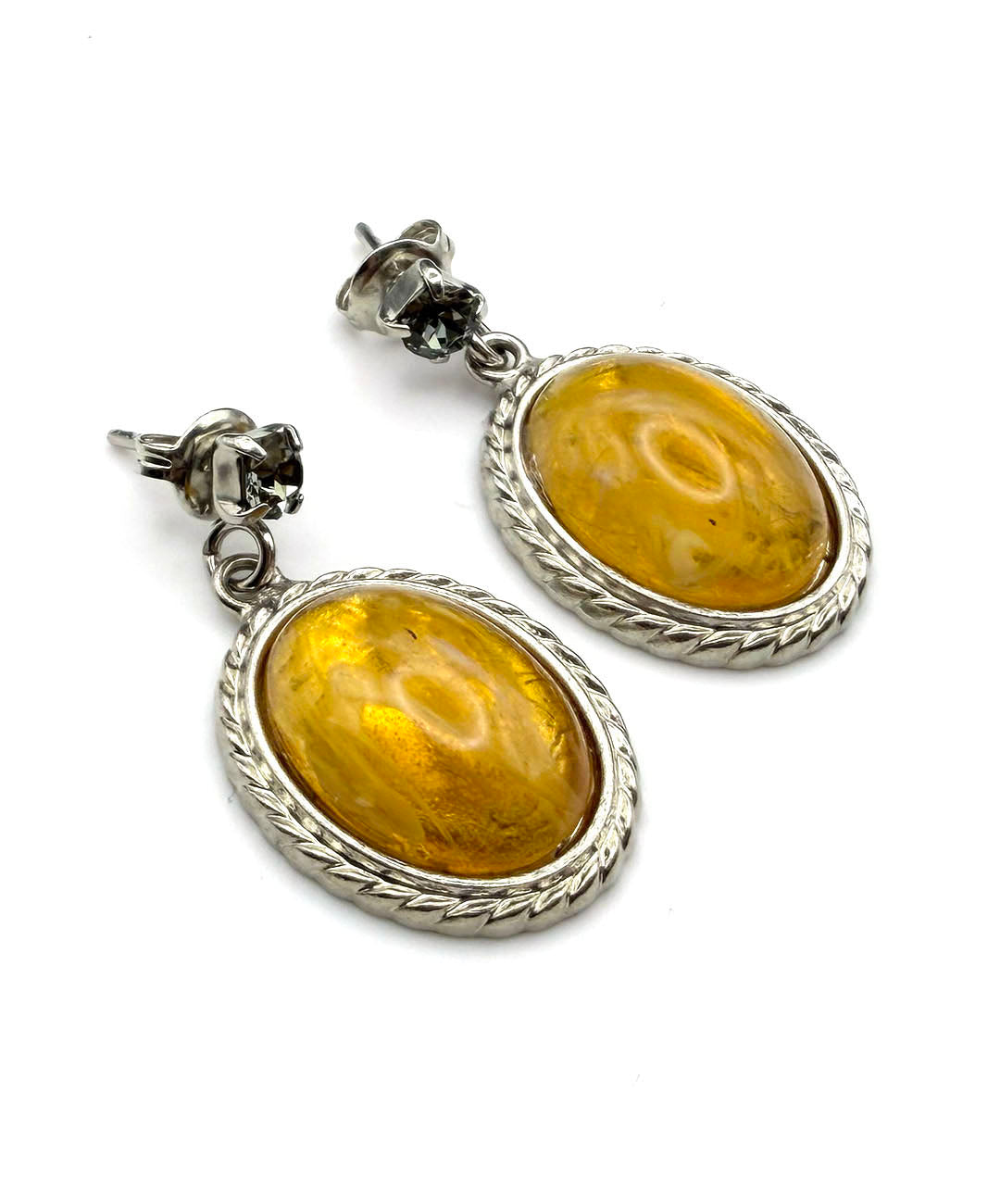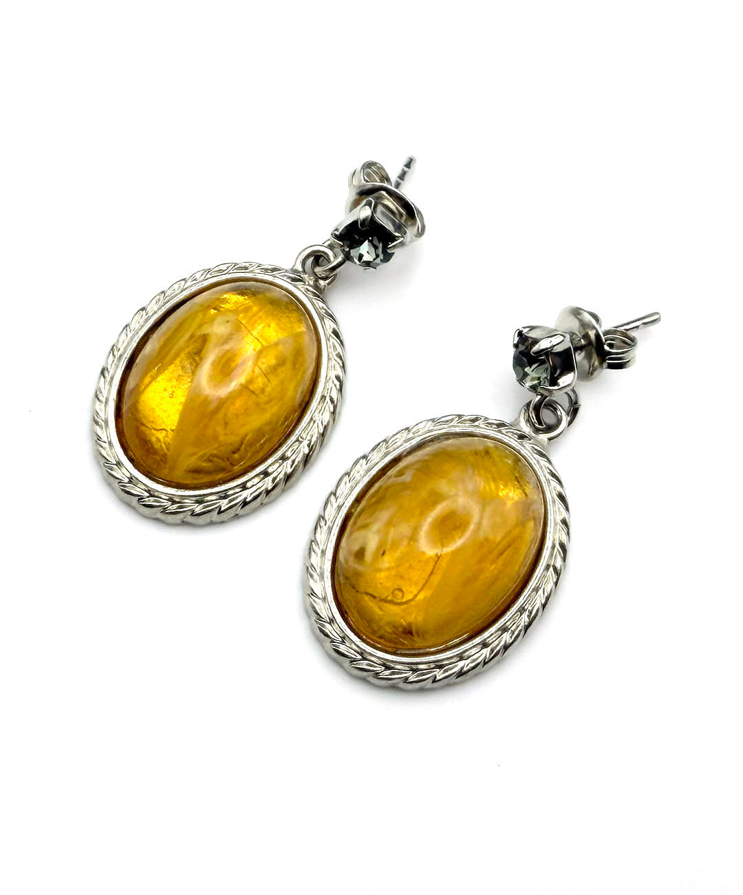 シルバートーンメタルにグレーのストーンが爪留めされ、ゴールデンアンバーのオーバルカボションガラスが垂れ下がり揺らめくデザインです。