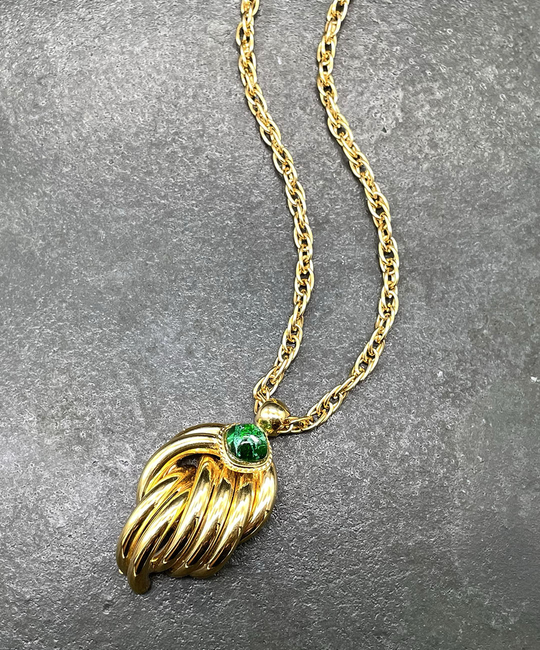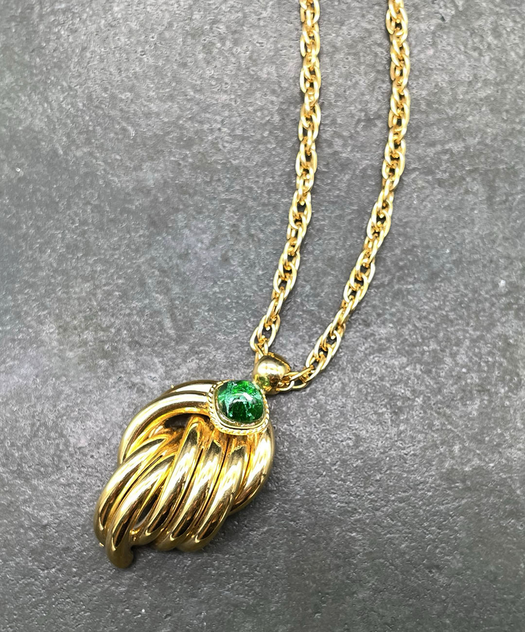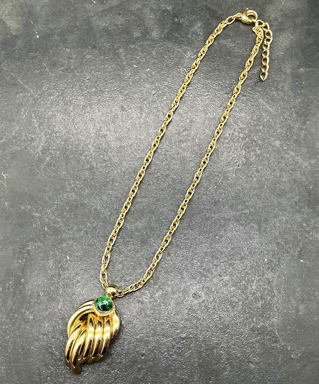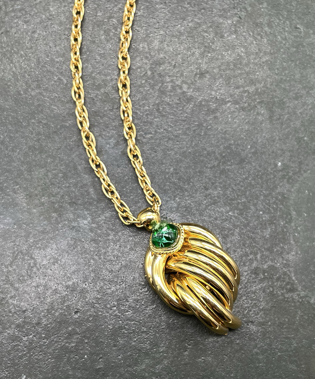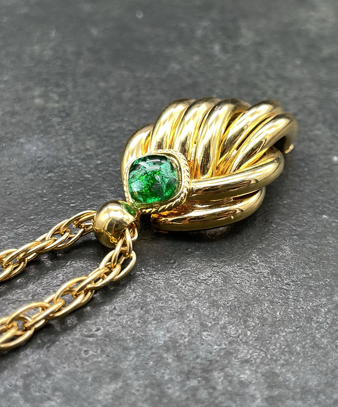 ゴールドトーンのクラシカルなデザインチェーンに、クッションシェイプのグリーンカボションガラスがセットされた、アブストラクトモチーフペンダントがあしらわれています。
