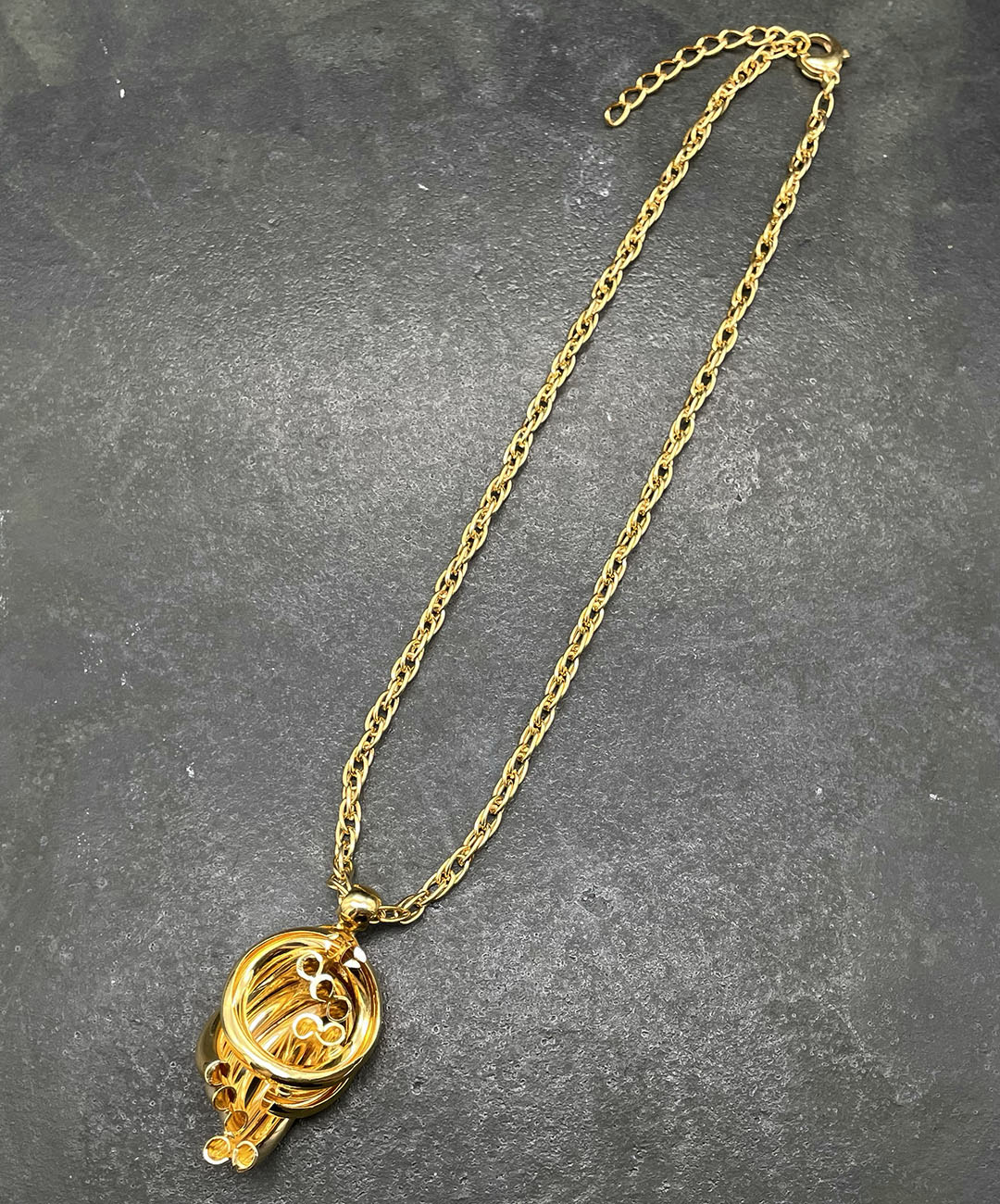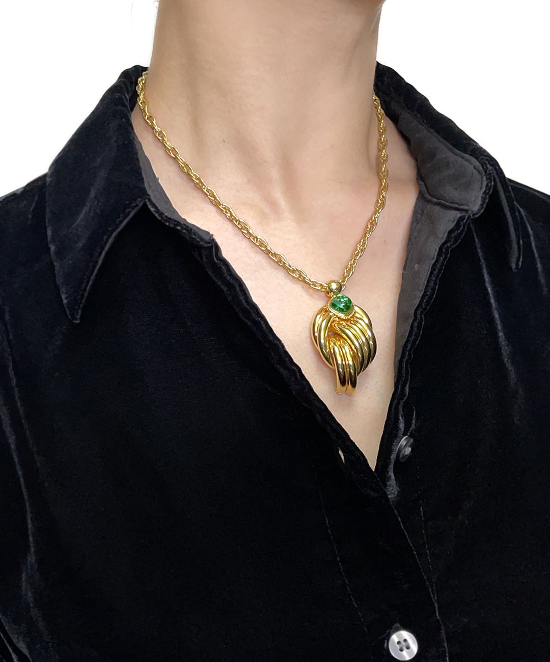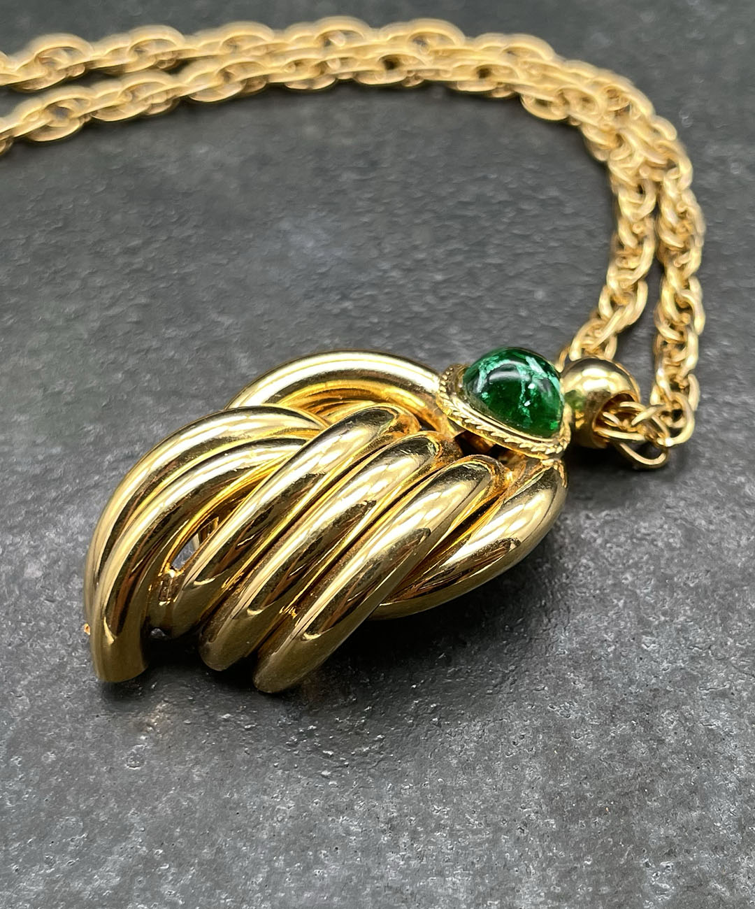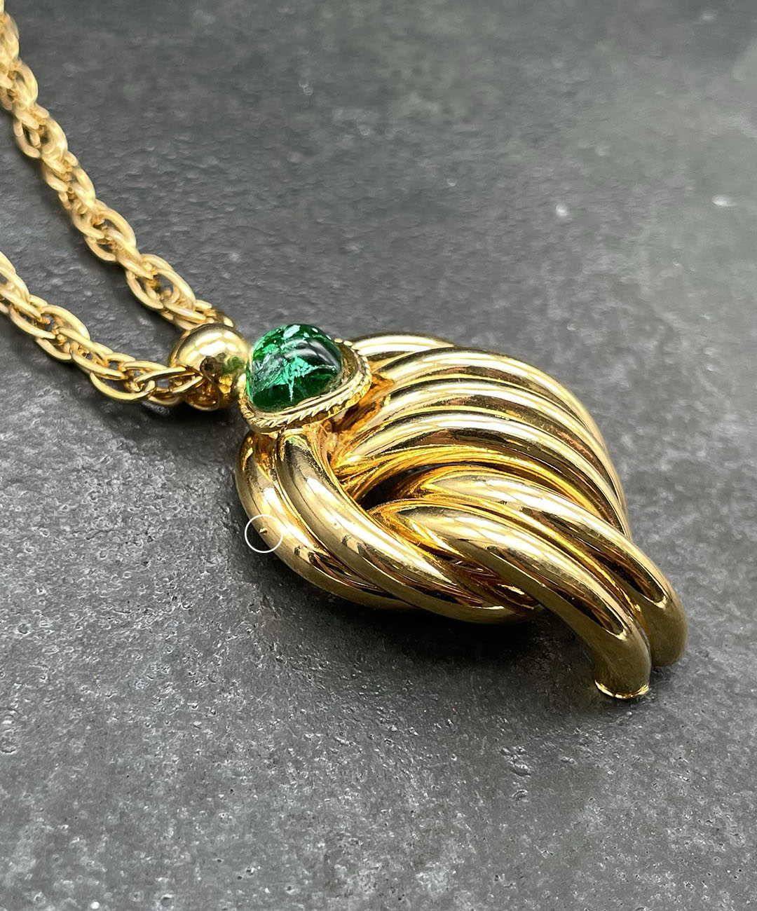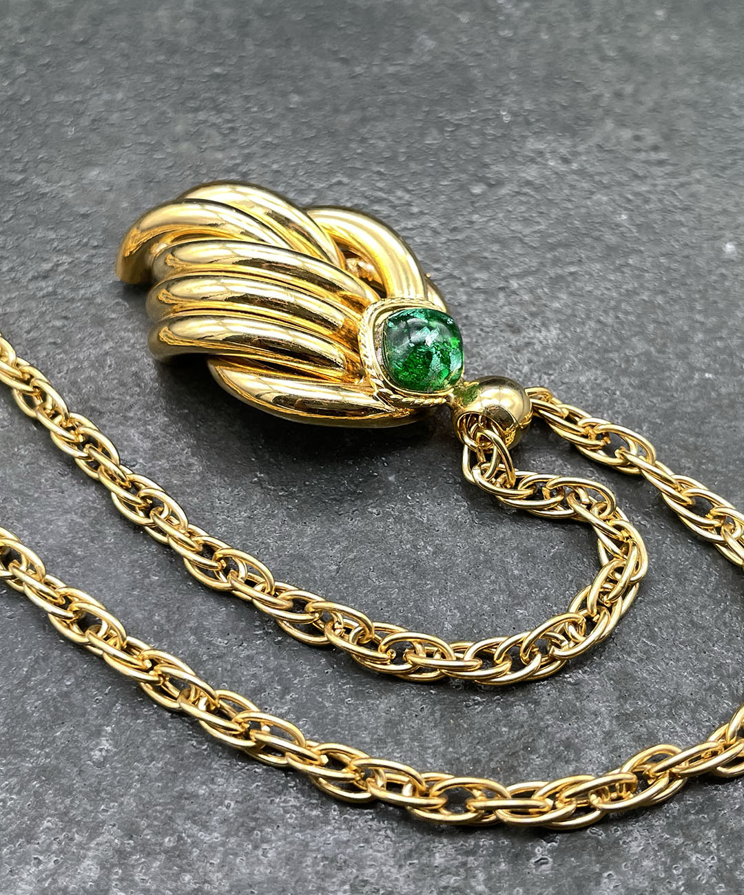 ゴールドトーンのクラシカルなデザインチェーンに、クッションシェイプのグリーンカボションガラスがセットされた、アブストラクトモチーフペンダントがあしらわれています。