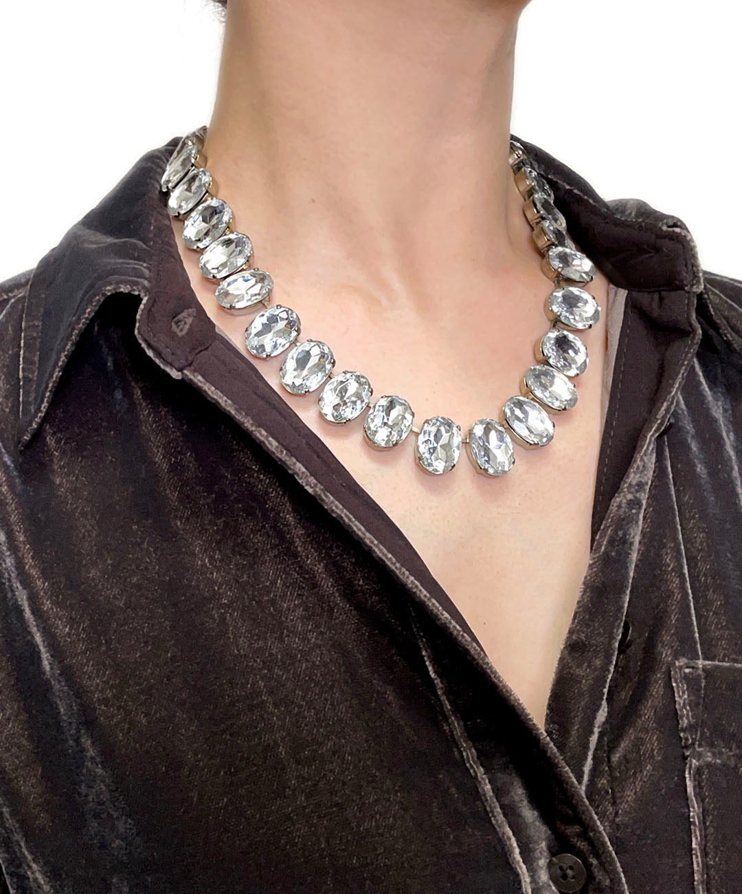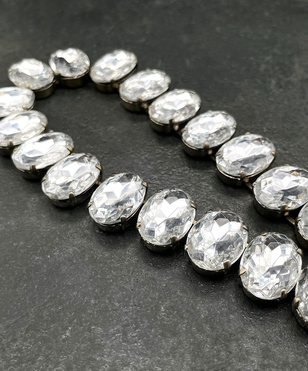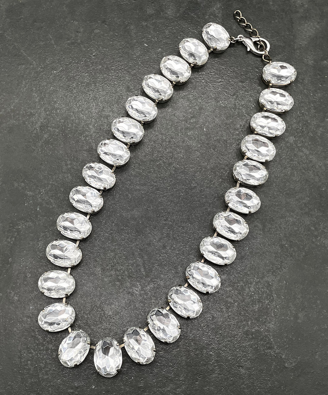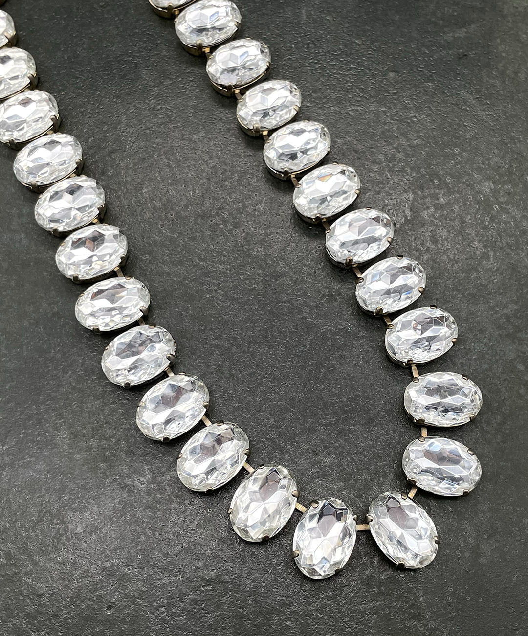 ダークなシルバートーンメタルに、オーバルシェイプの大ぶりクリアガラスがたっぷりと爪留めされて連なり、クリアな輝きを放っています。