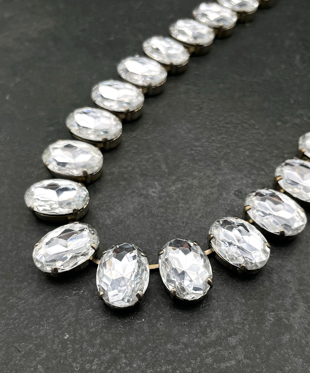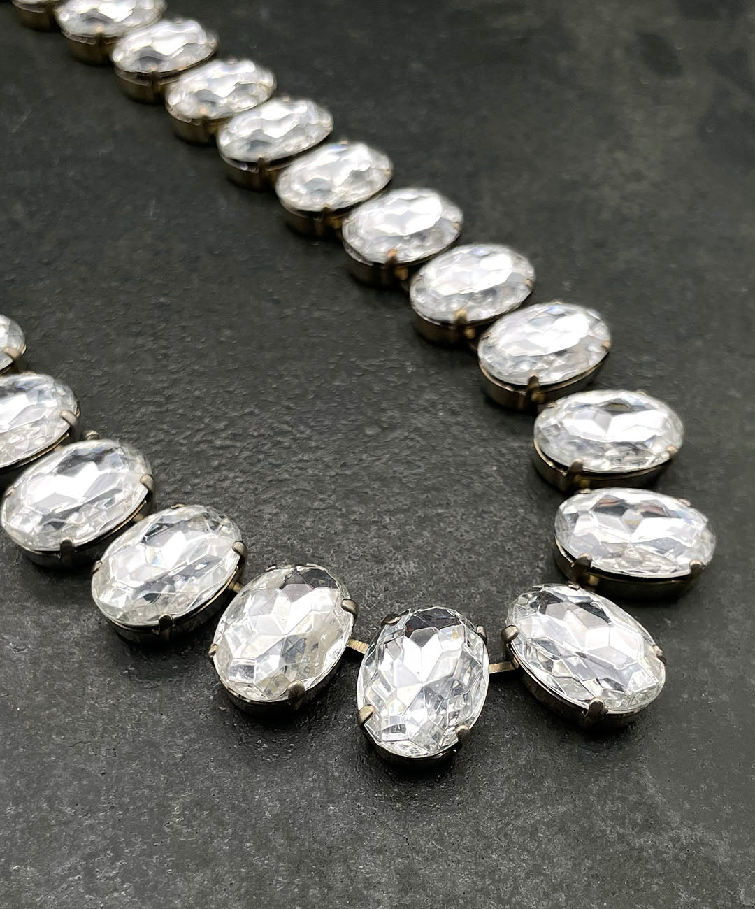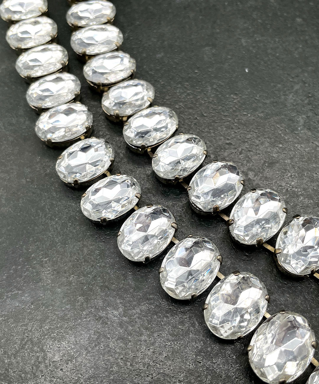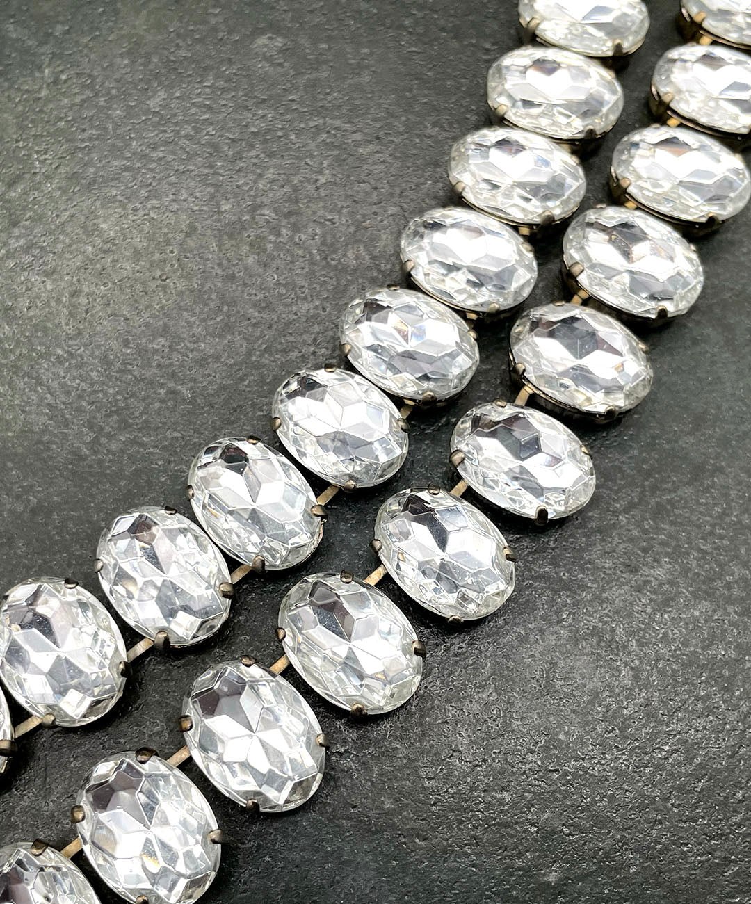 ダークなシルバートーンメタルに、オーバルシェイプの大ぶりクリアガラスがたっぷりと爪留めされて連なり、クリアな輝きを放っています。