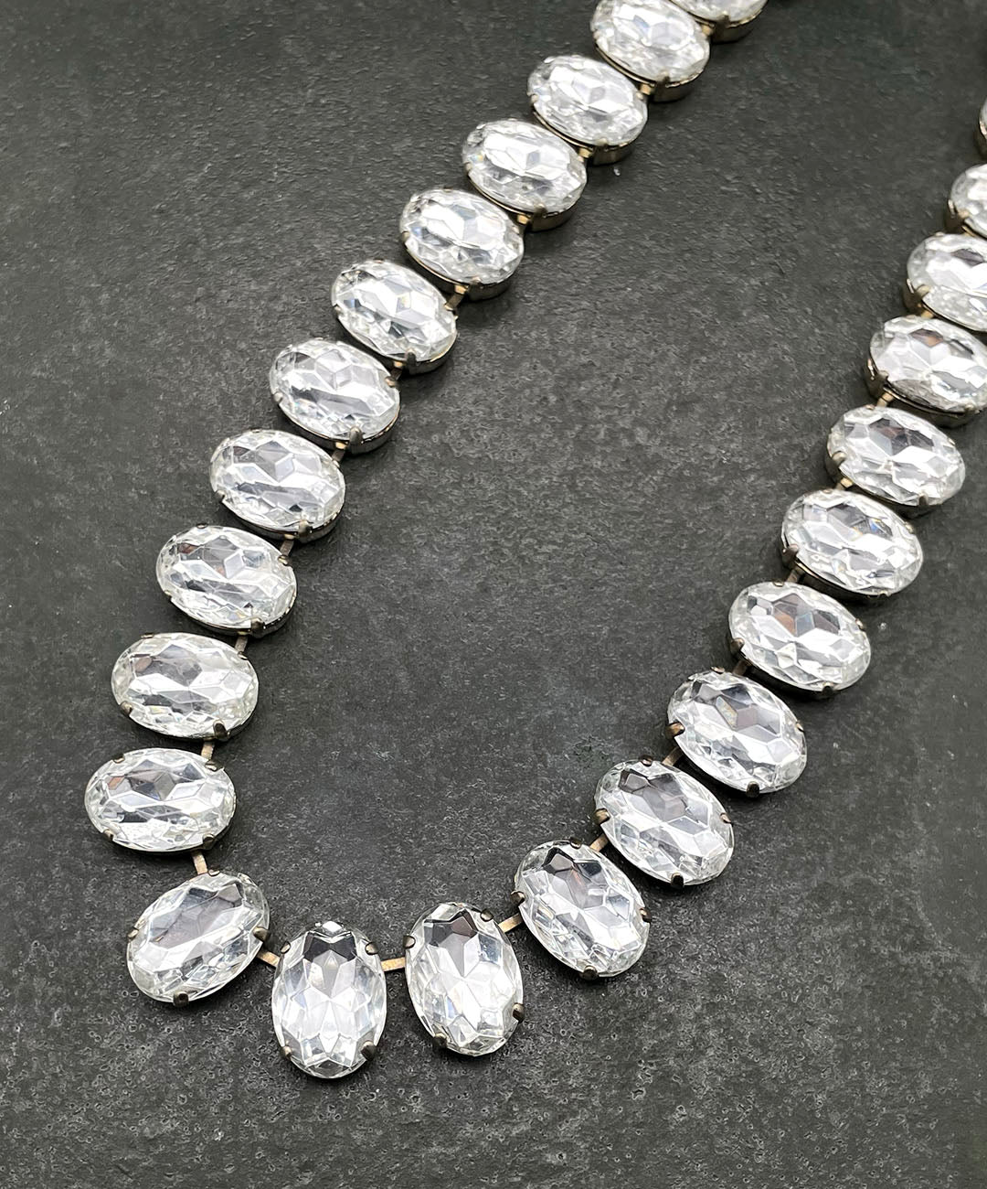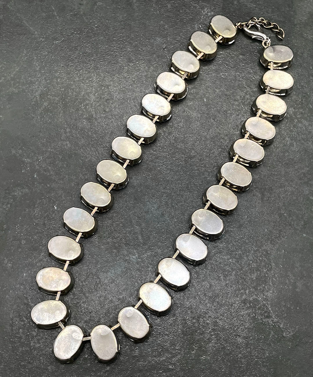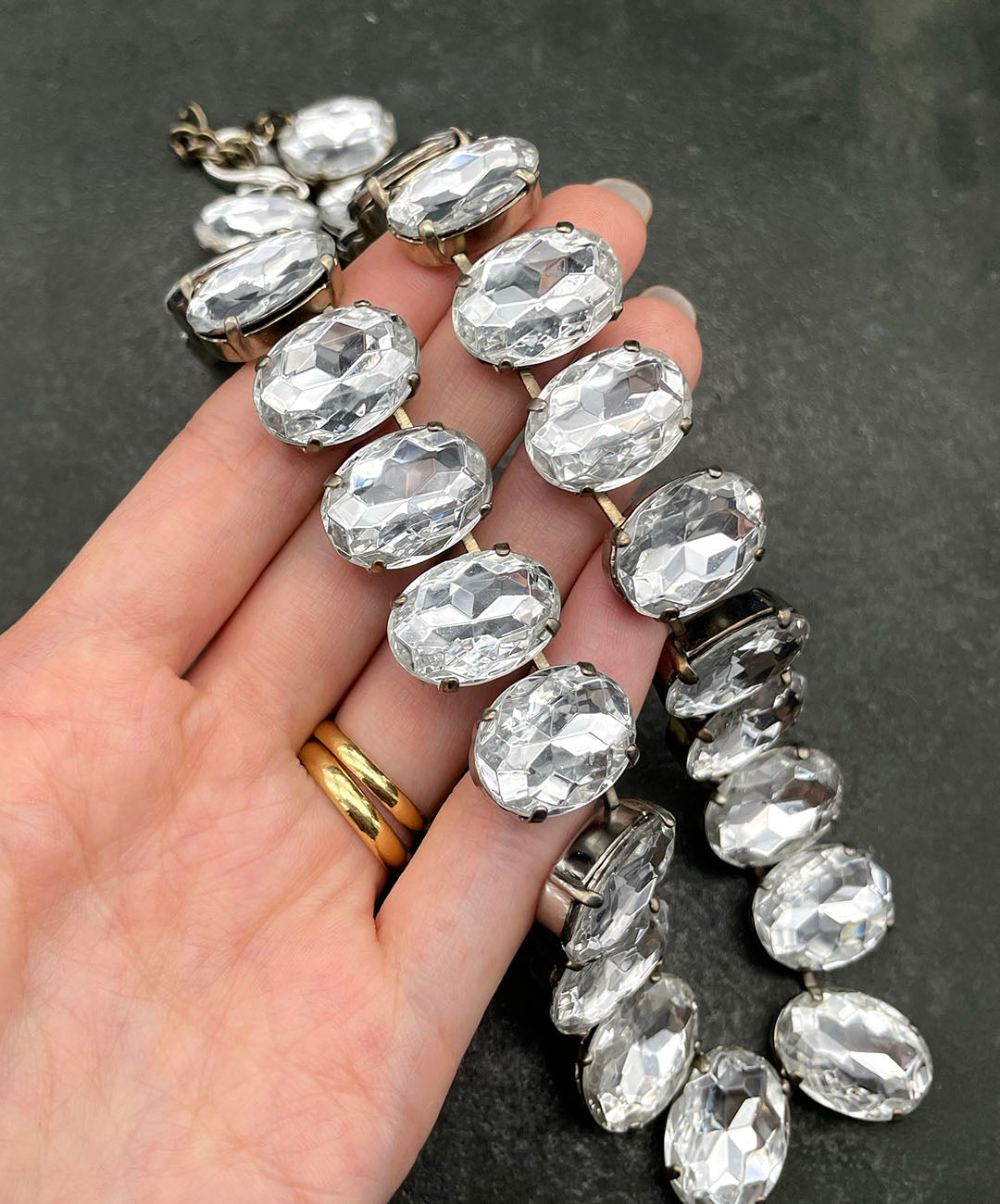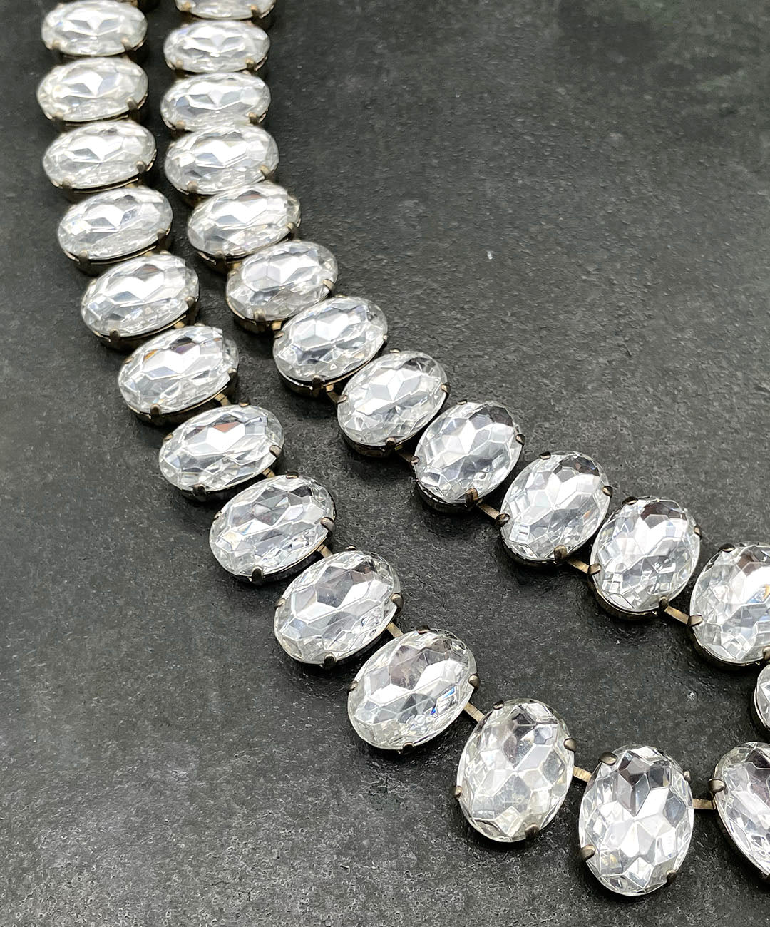 ダークなシルバートーンメタルに、オーバルシェイプの大ぶりクリアガラスがたっぷりと爪留めされて連なり、クリアな輝きを放っています。