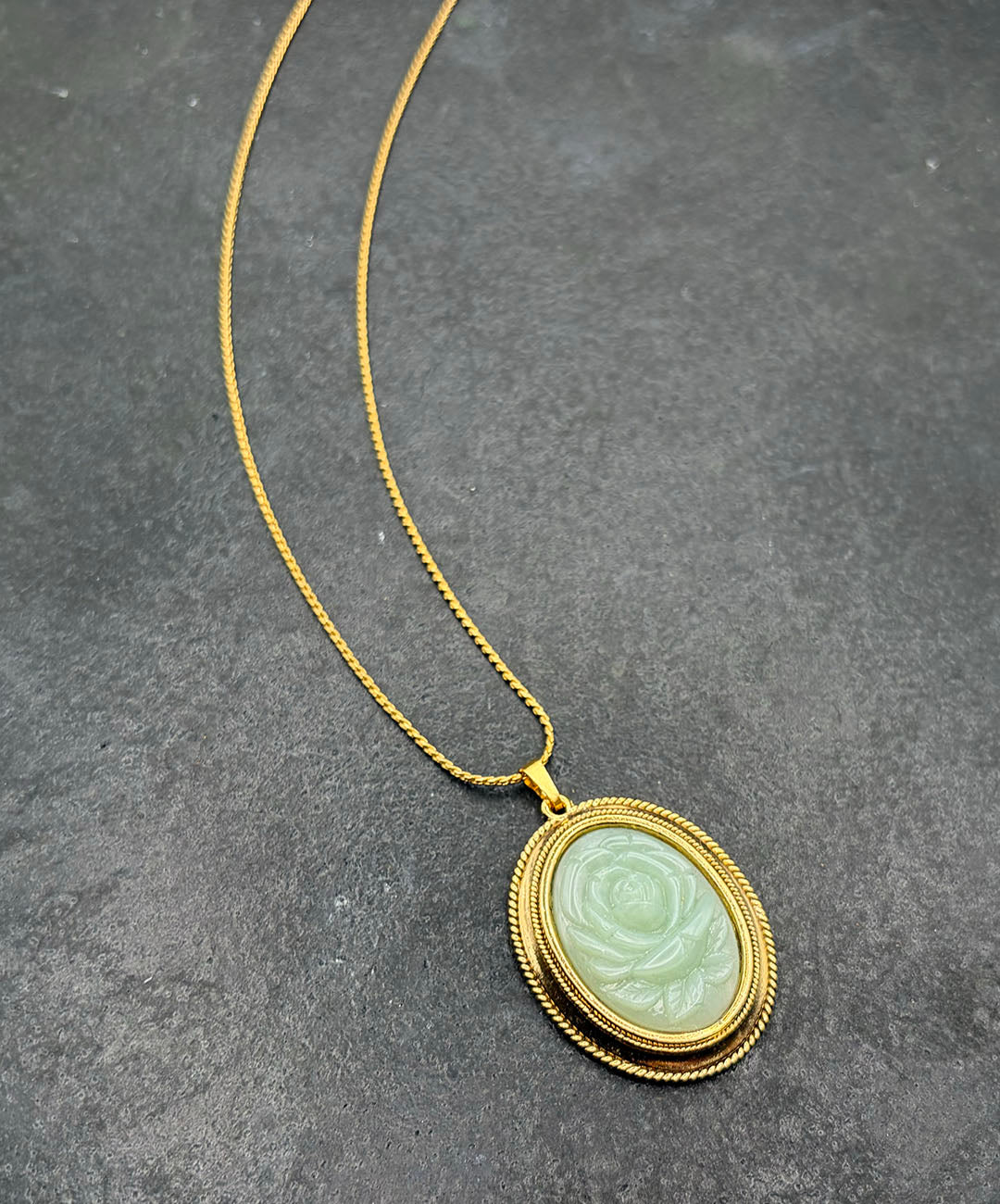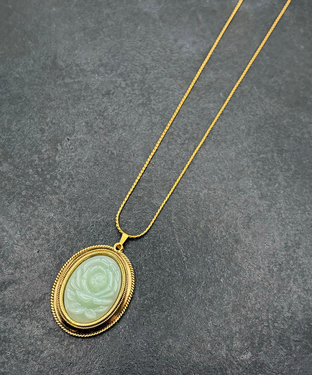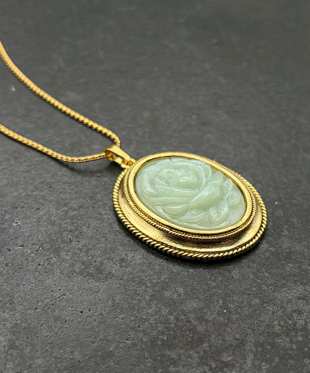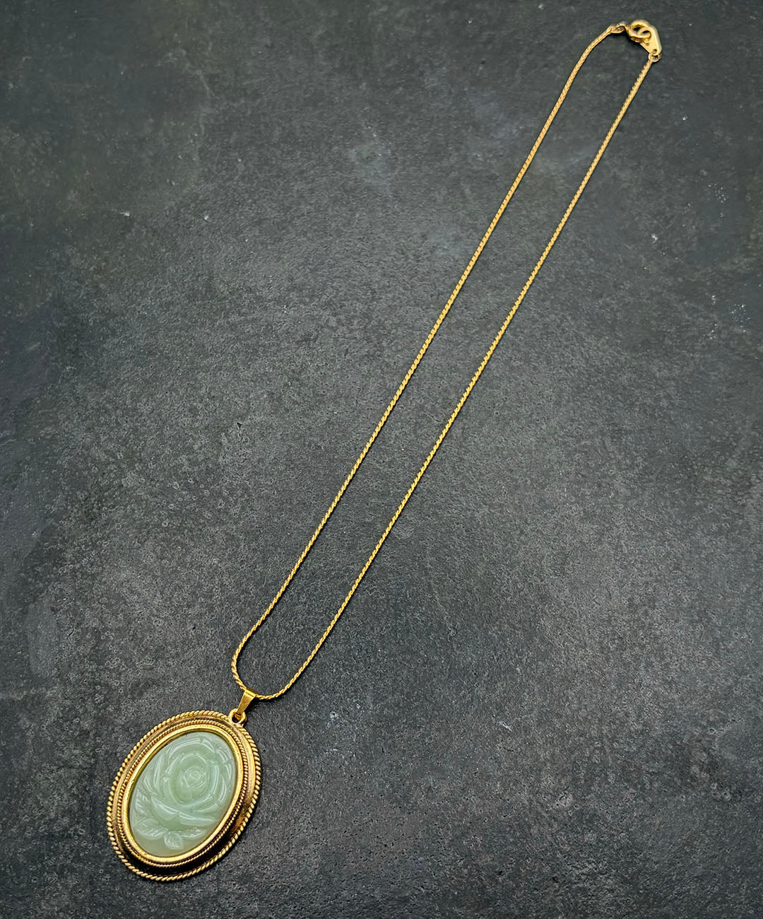 しなやかに艶めくゴールドトーンチェーンにに、ロープテクスチャーの石枠にライトジェードグリーンのローズモチーフガラスがセットされたペンダントが通されています。