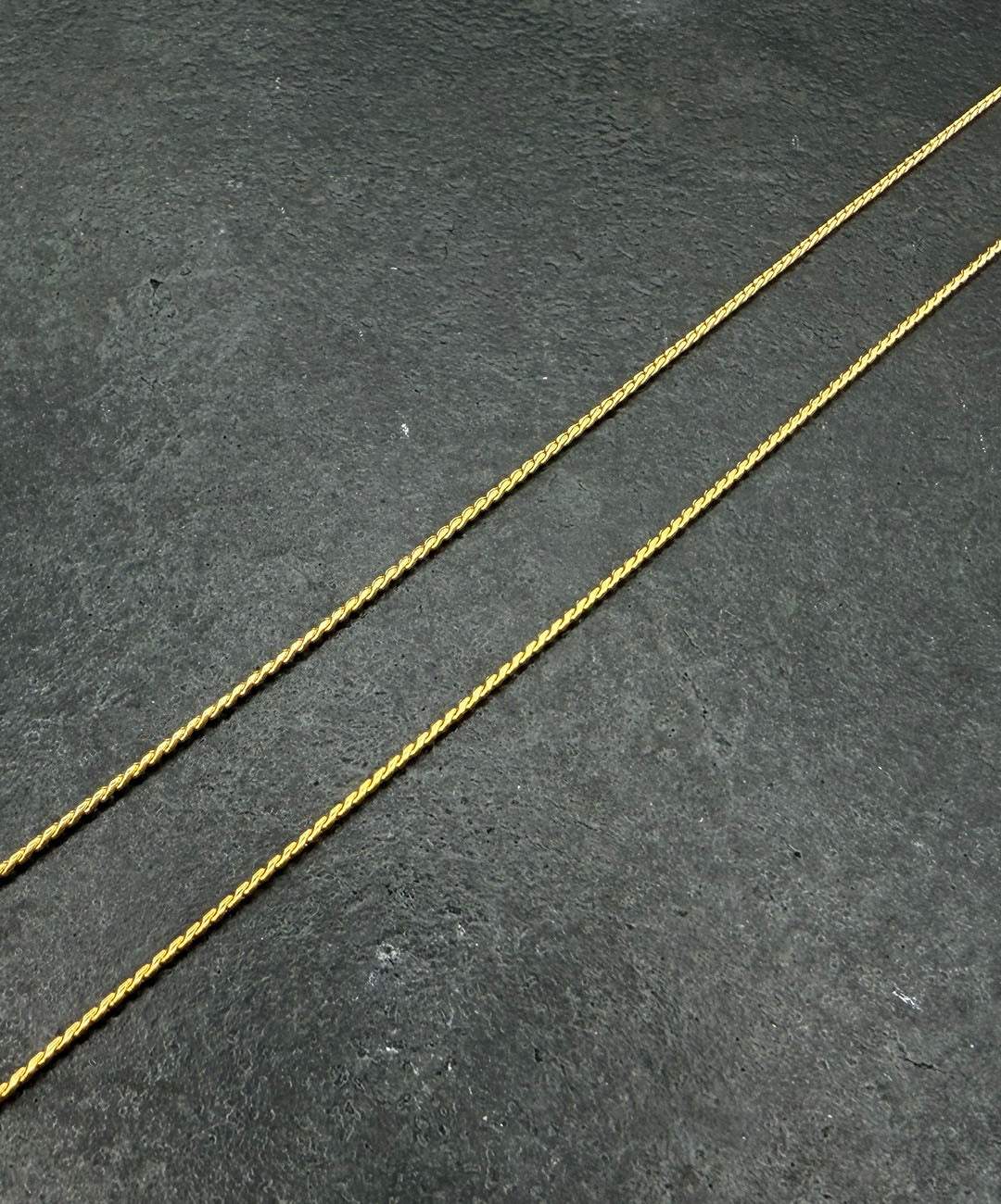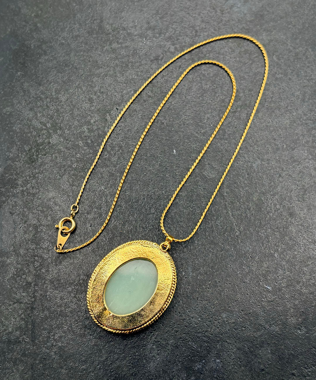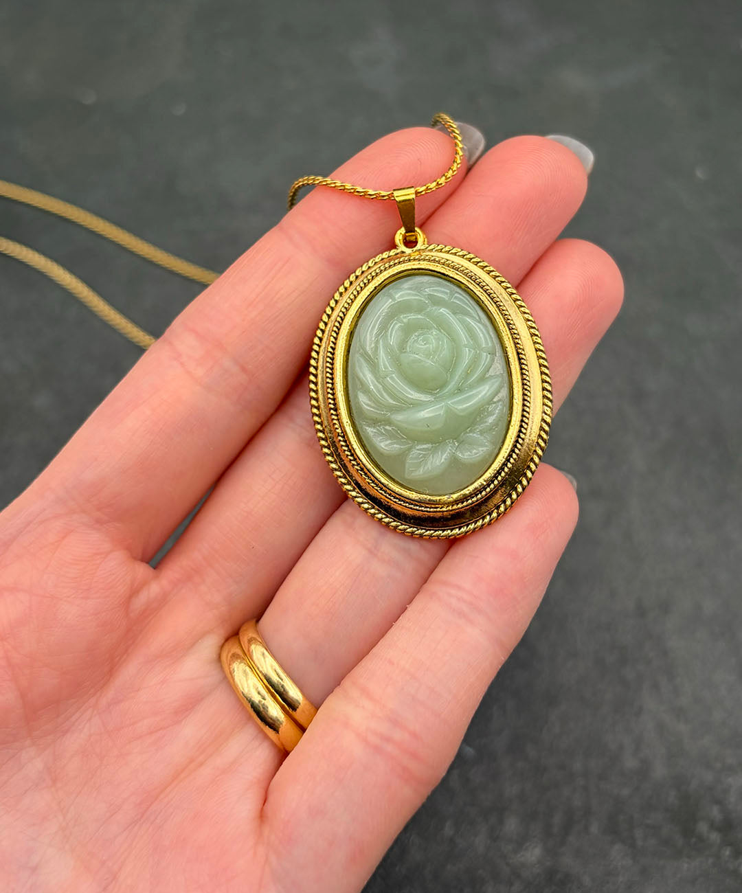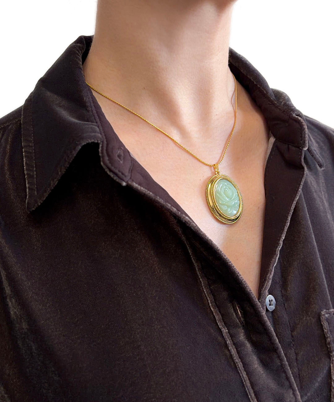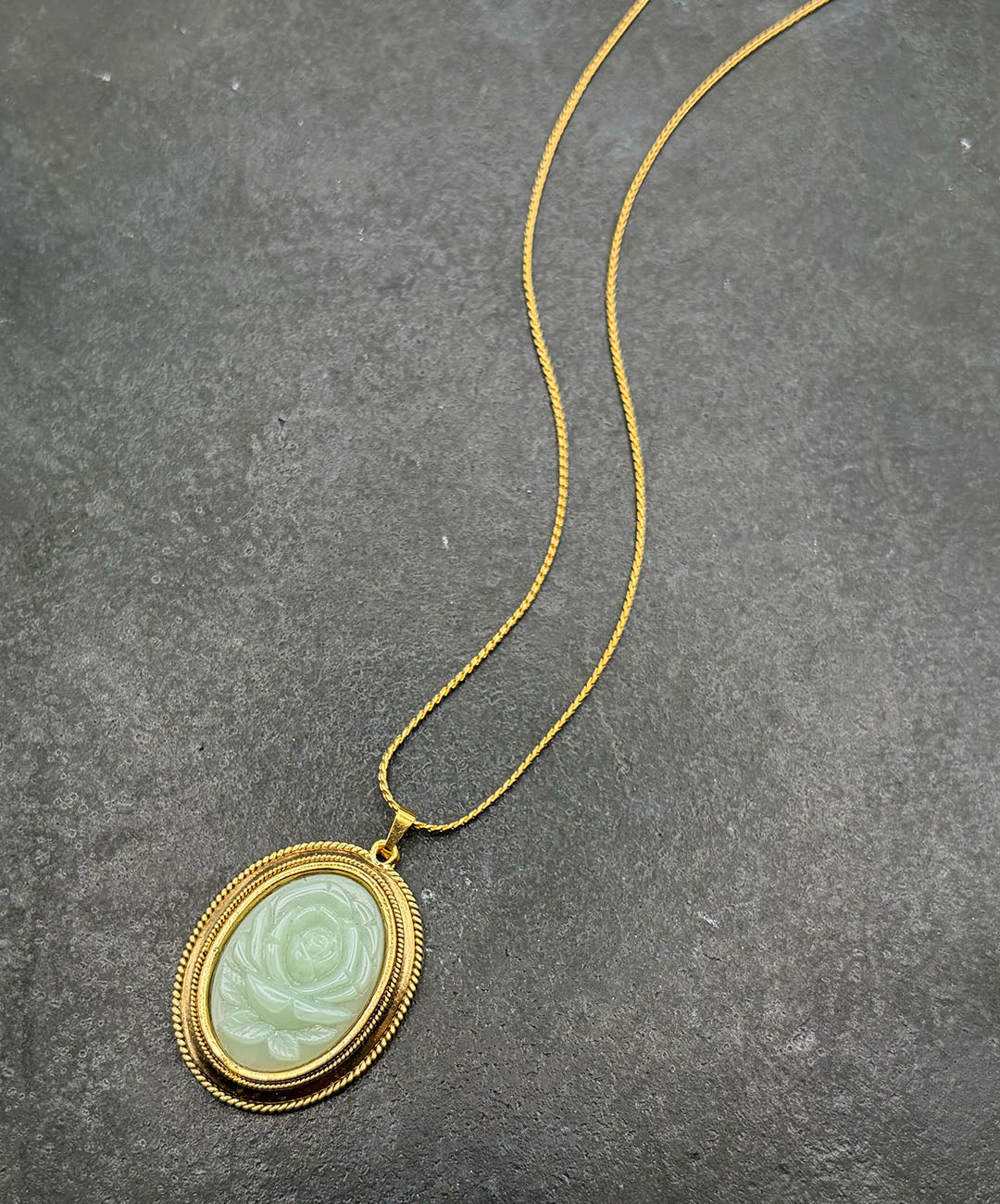 しなやかに艶めくゴールドトーンチェーンにに、ロープテクスチャーの石枠にライトジェードグリーンのローズモチーフガラスがセットされたペンダントが通されています。
