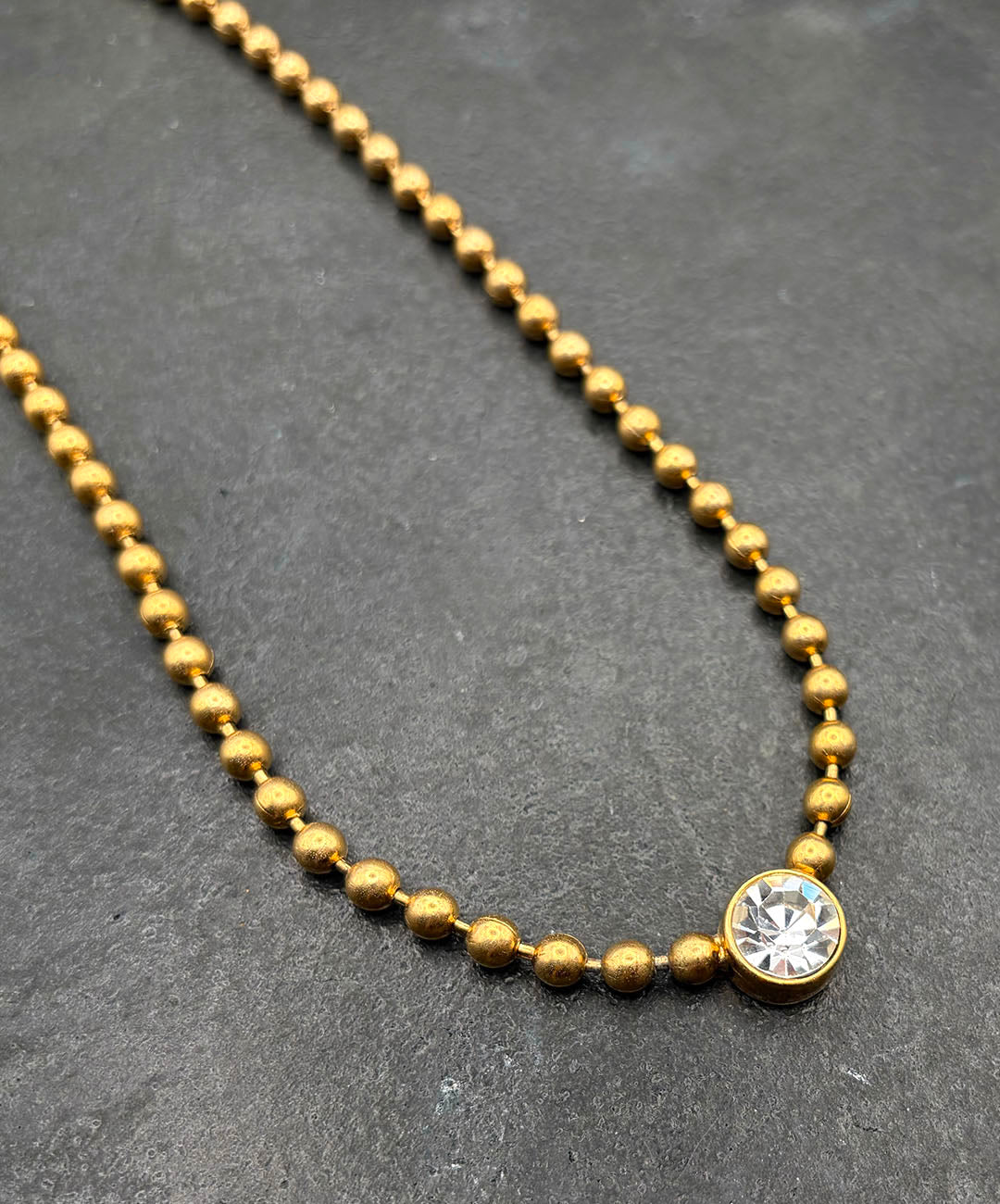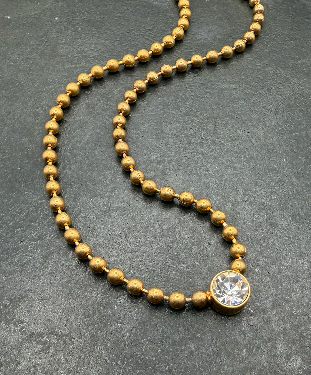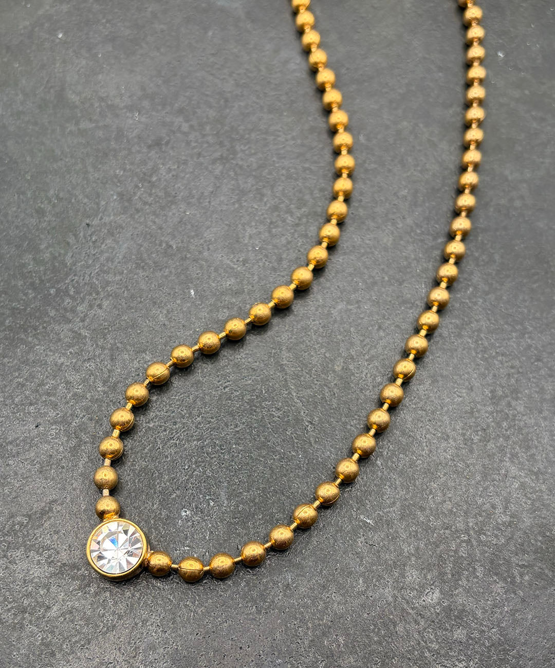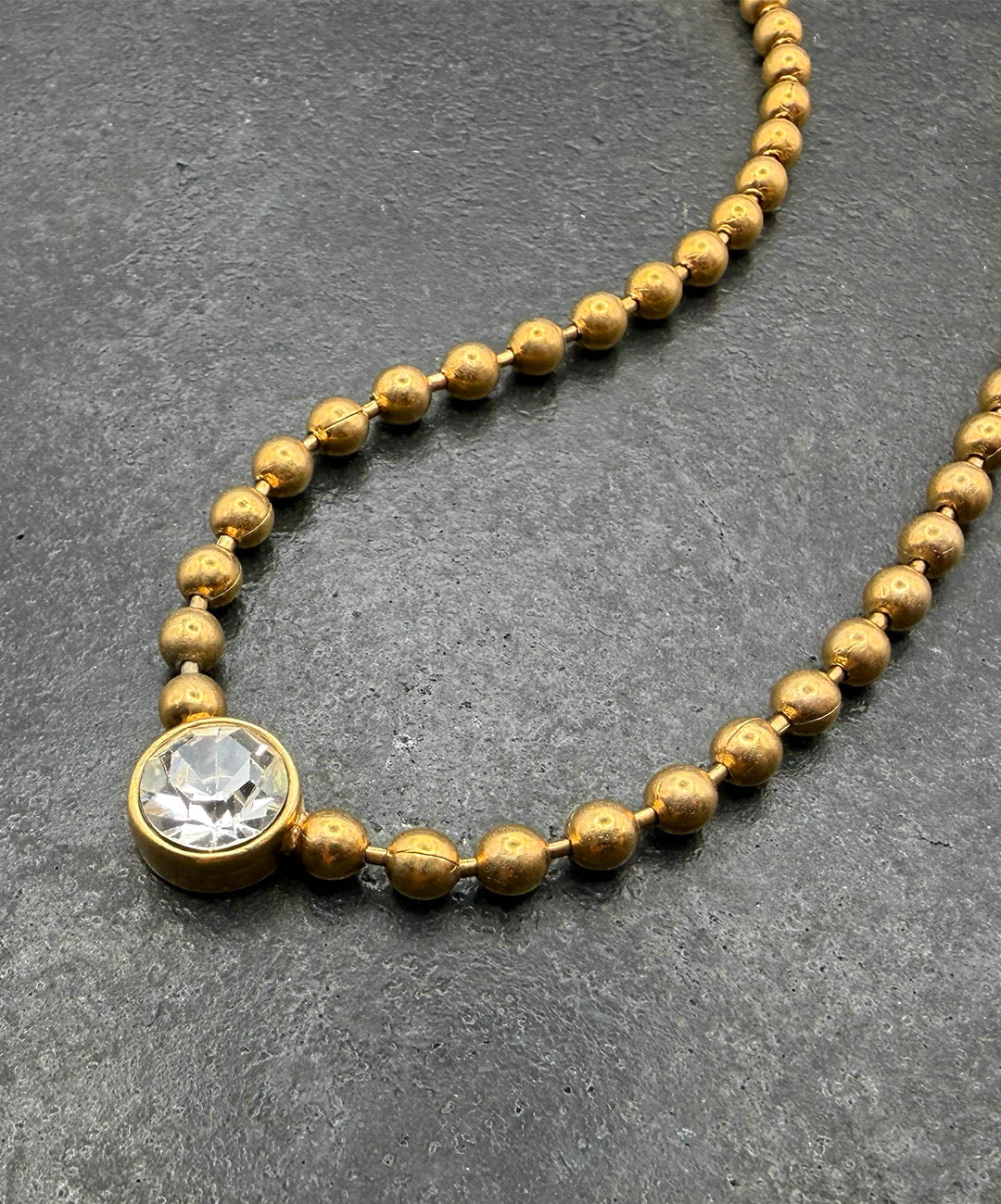 落ち着いた光沢を放つゴールドトーンのボールチェーンに、ラウンドカットの大粒クリスタルがセットされたデザイン。