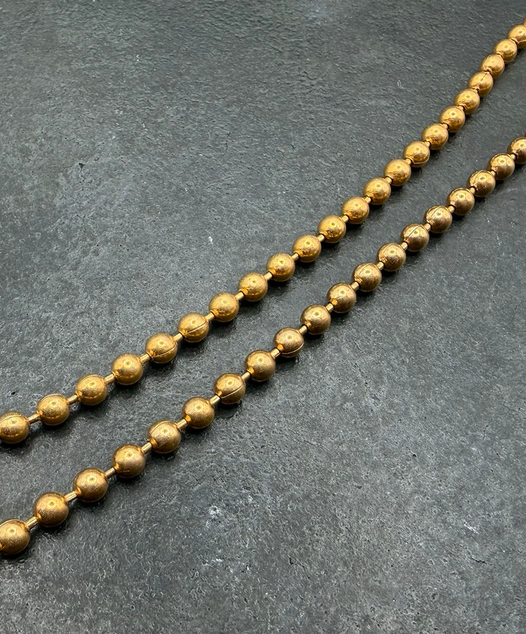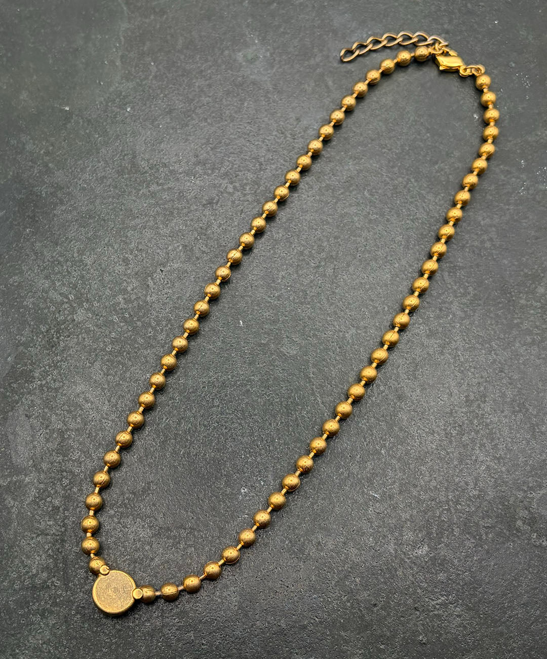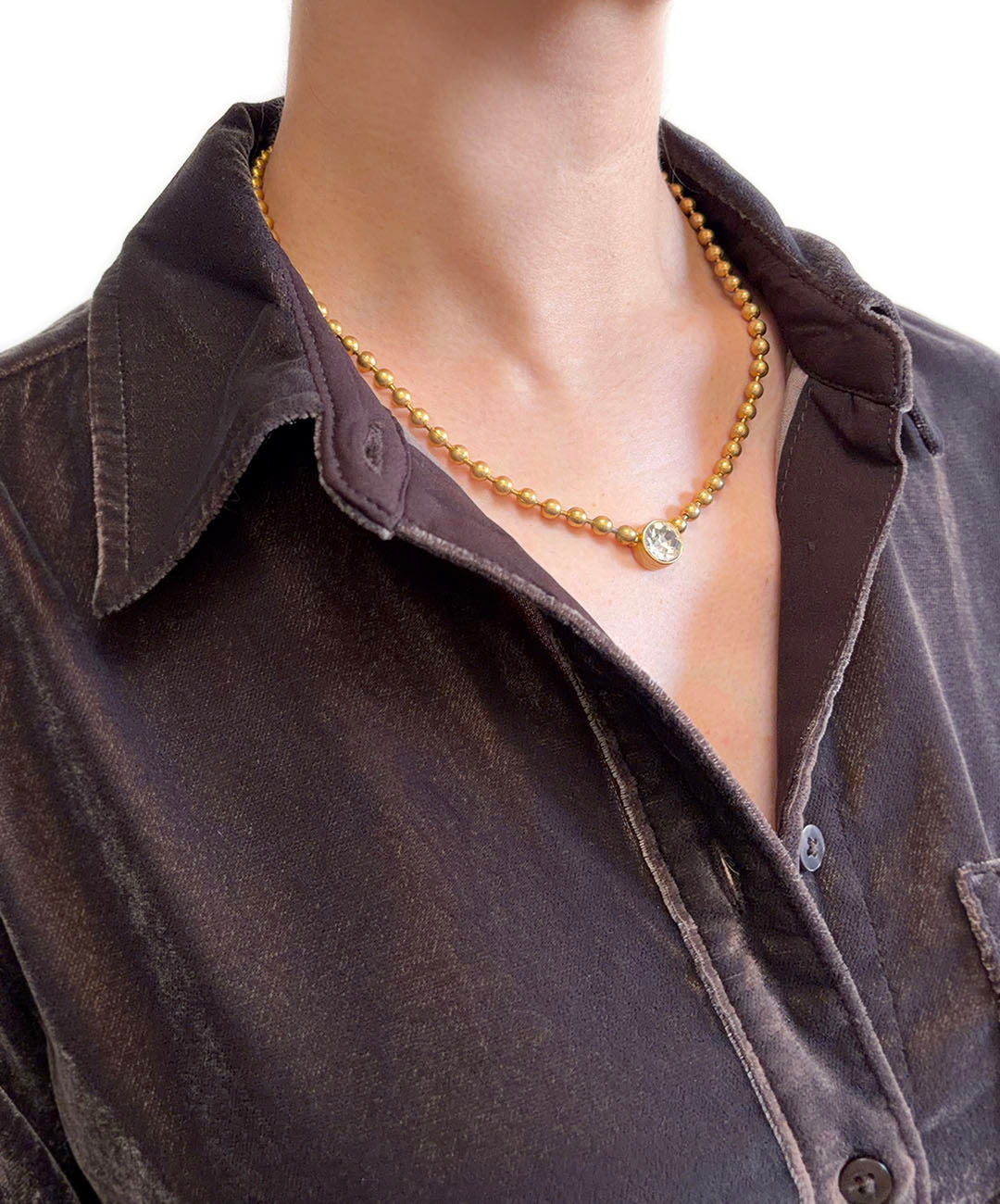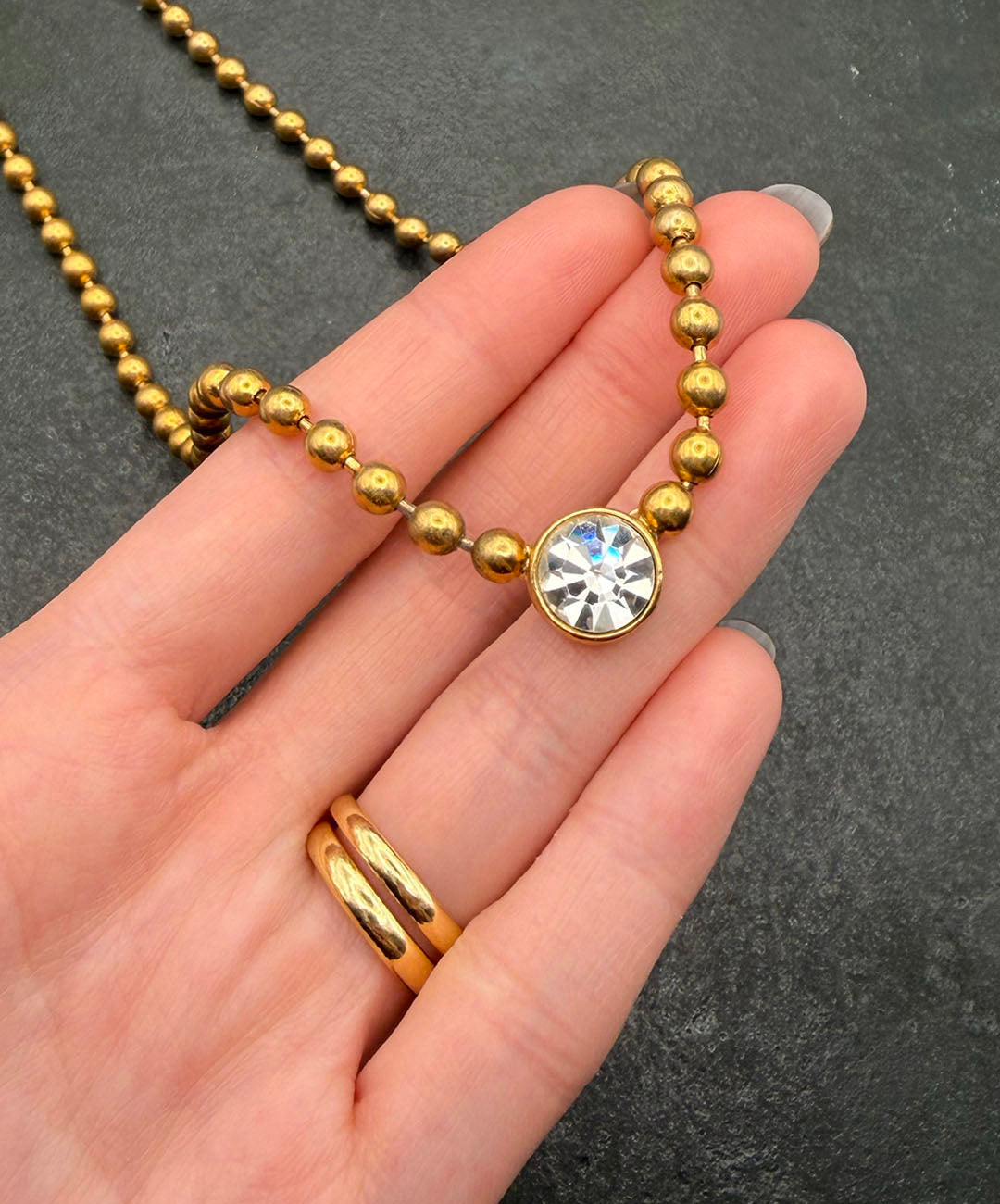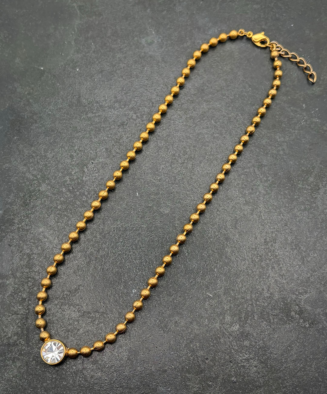落ち着いた光沢を放つゴールドトーンのボールチェーンに、ラウンドカットの大粒クリスタルがセットされたデザイン。
