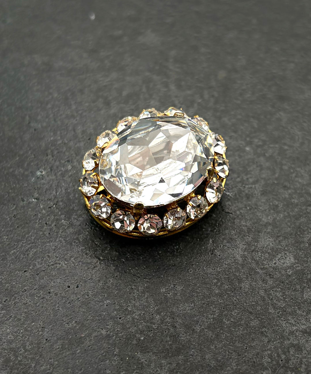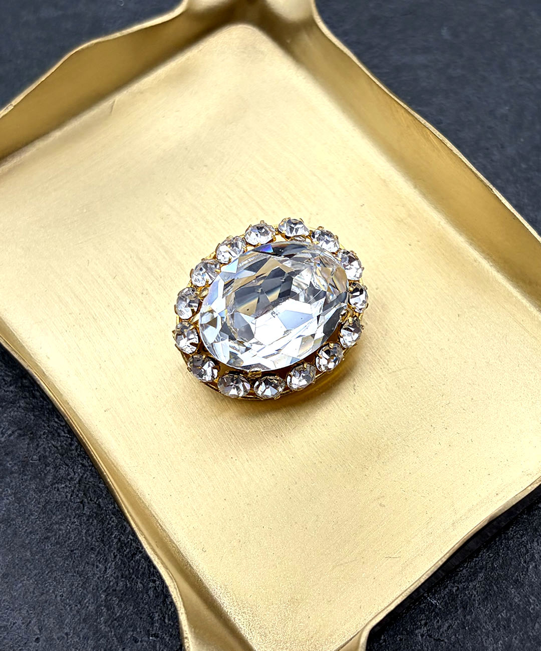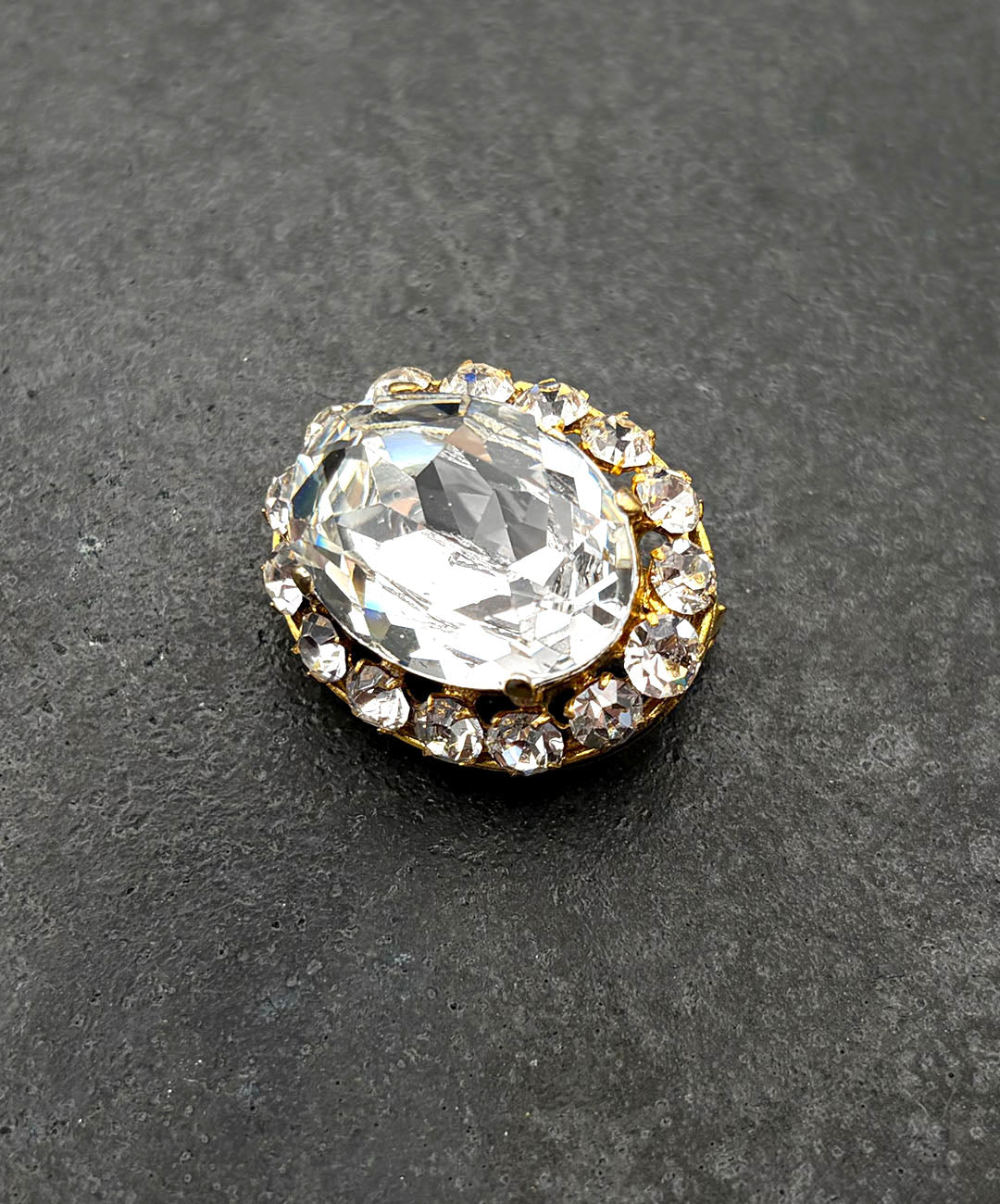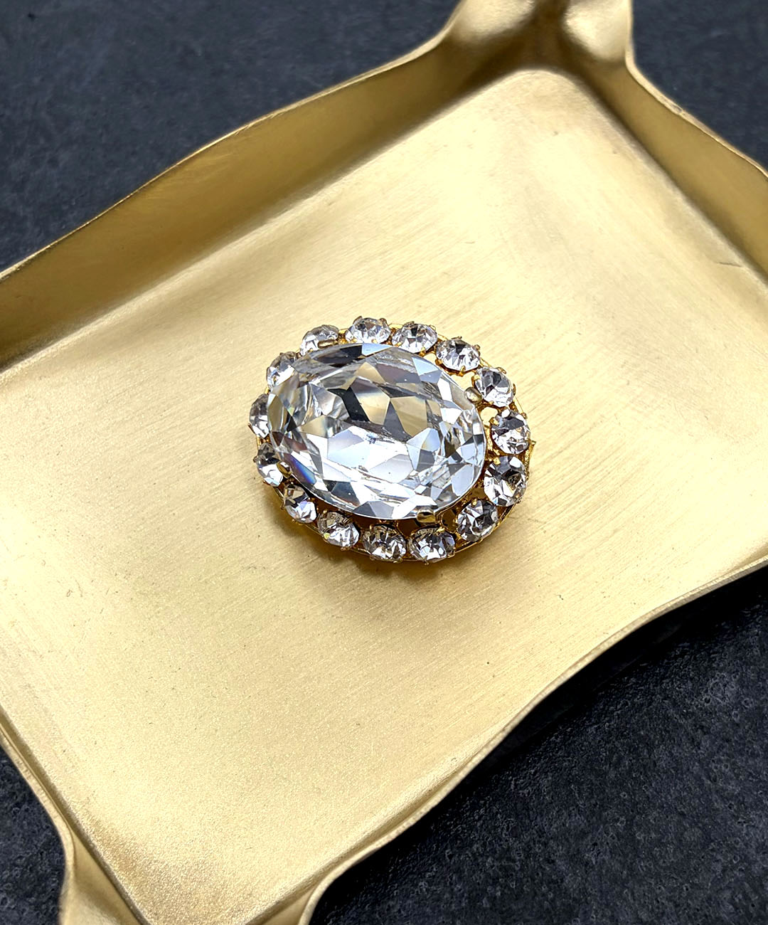ゴールドトーンメタルに、オーバルカットの大粒クリスタル、その周囲をラウンドカットのクリスタルが取り巻くようにセットされています。