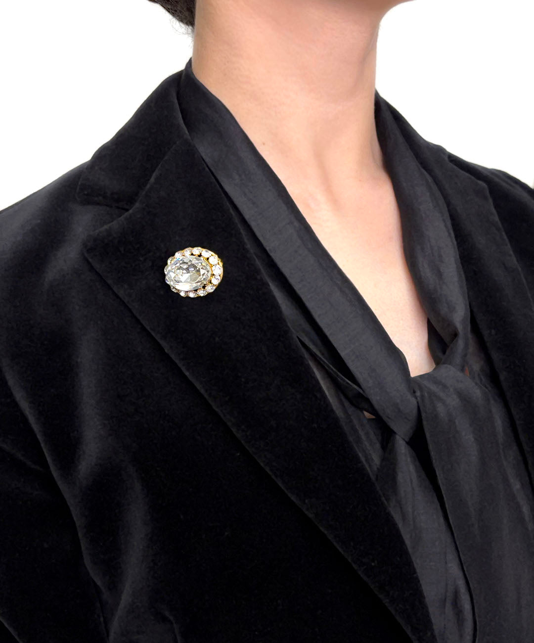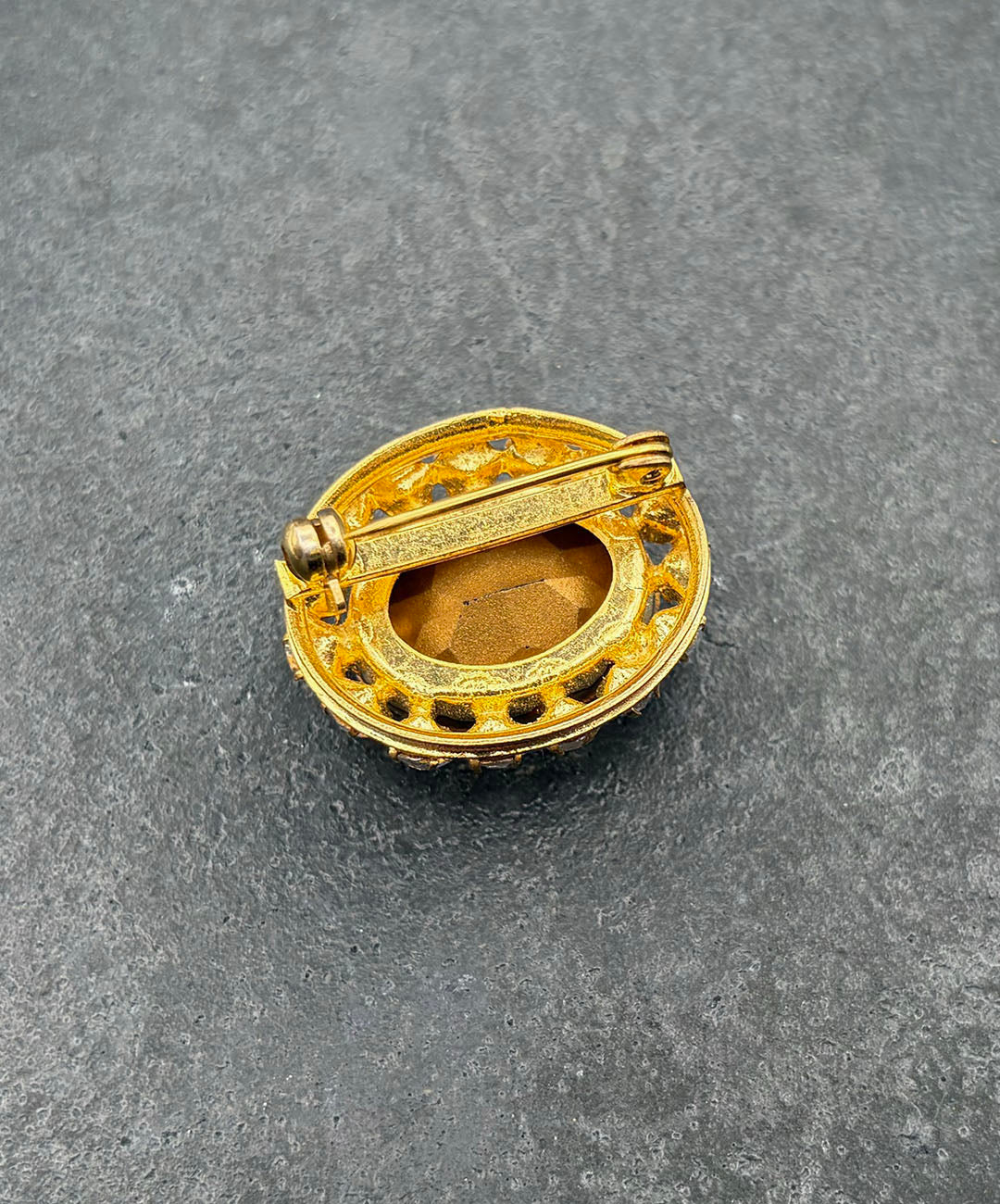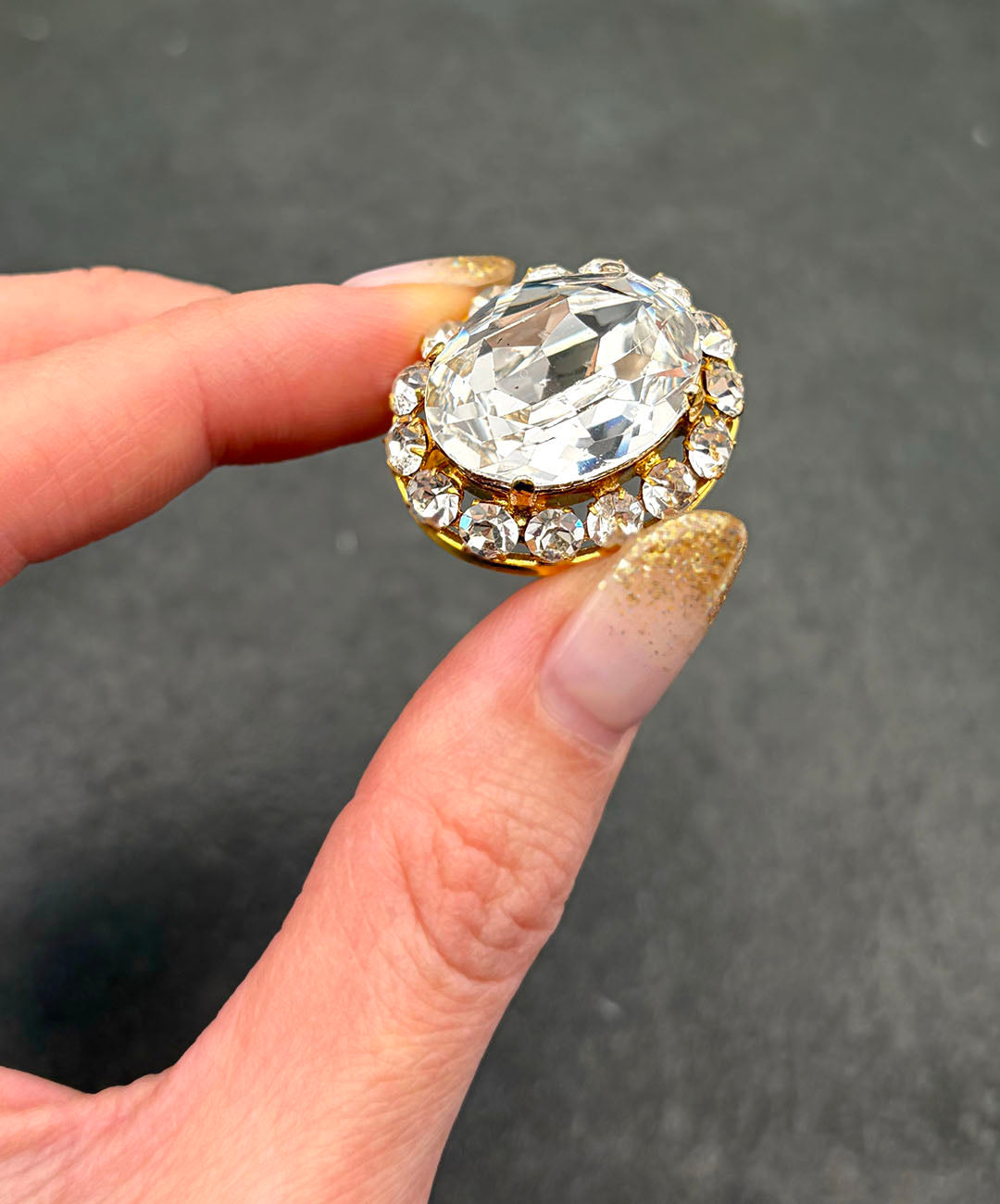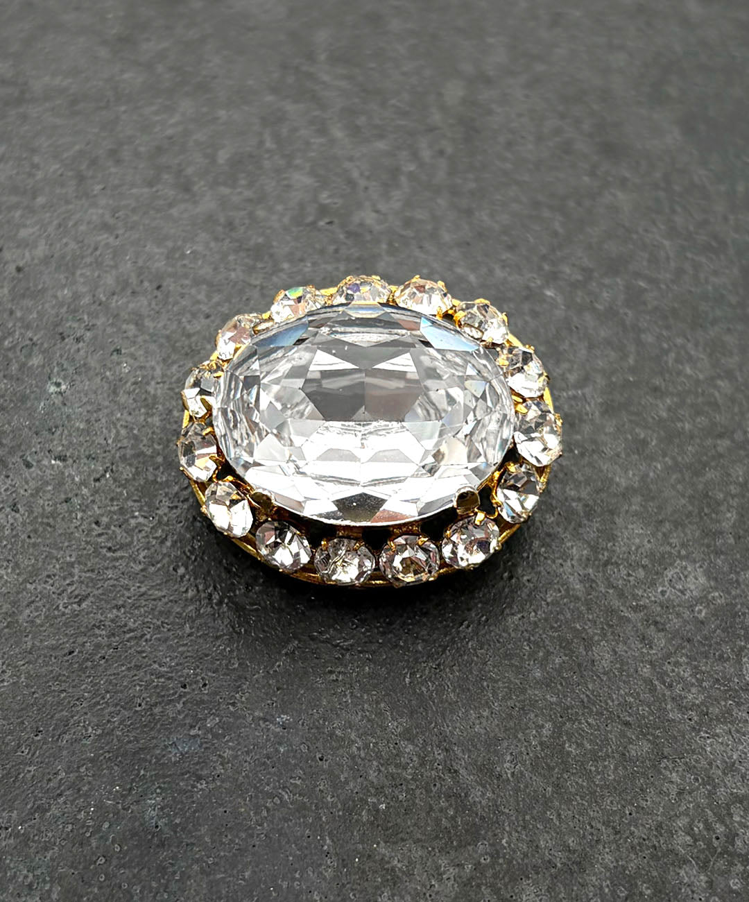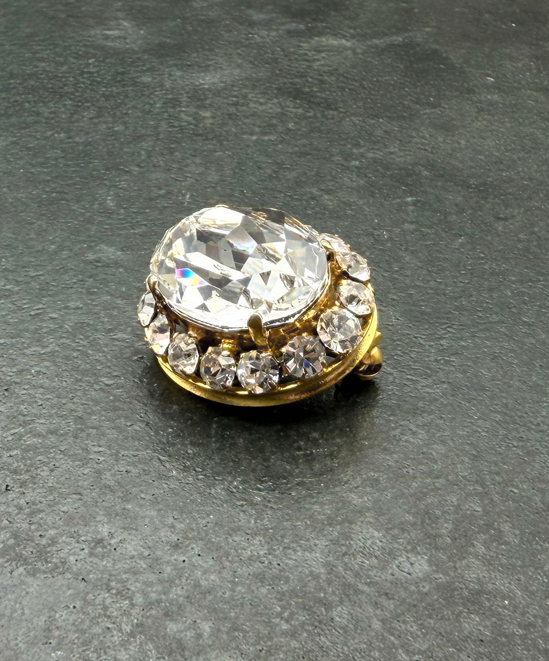 ゴールドトーンメタルに、オーバルカットの大粒クリスタル、その周囲をラウンドカットのクリスタルが取り巻くようにセットされています。