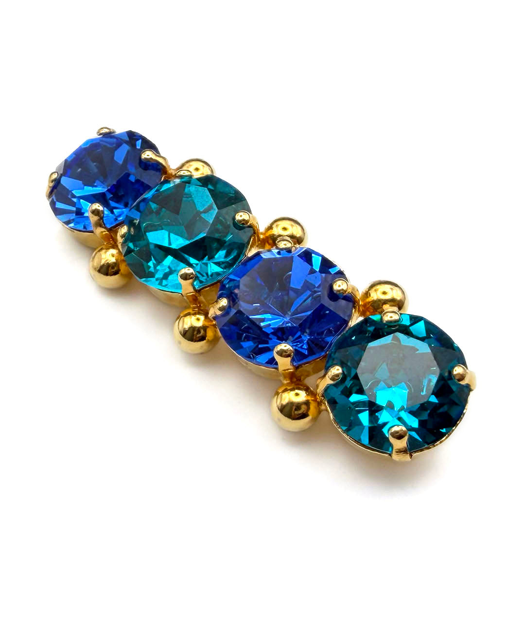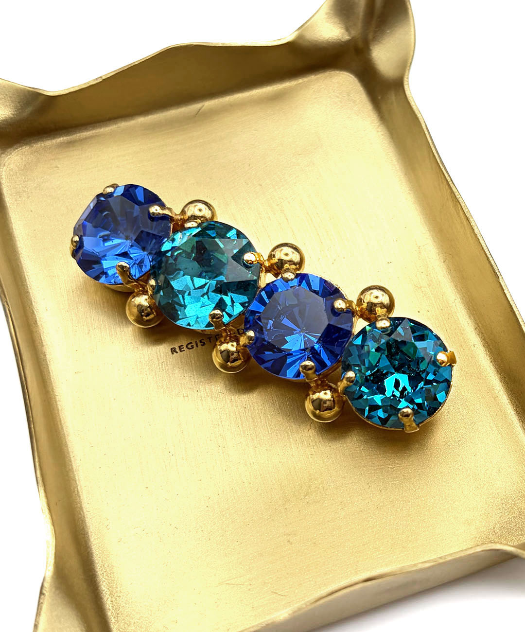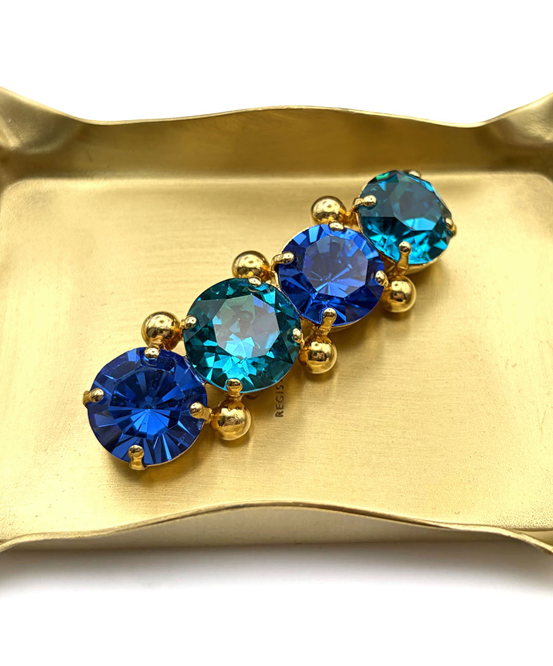 ゴールドトーンメタルにラウンドカットの大ぶりコーンフラワーブルー、ピーコックブルーガラスが爪留めされ、ガラスの間にあしらわれたゴールドの球が艶めくデザイン。