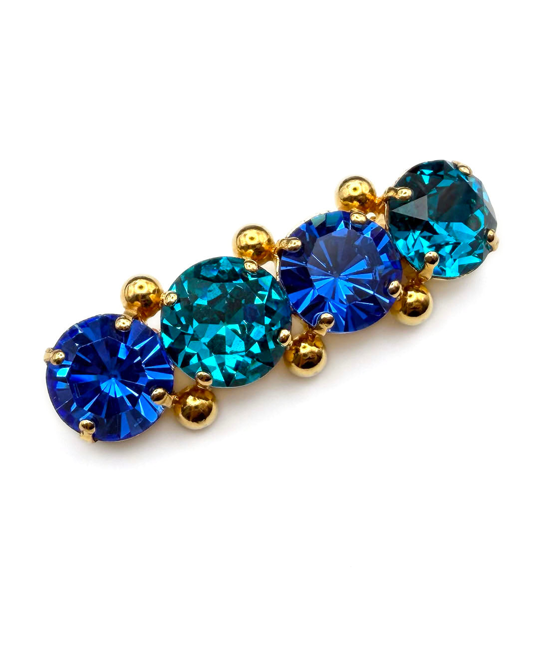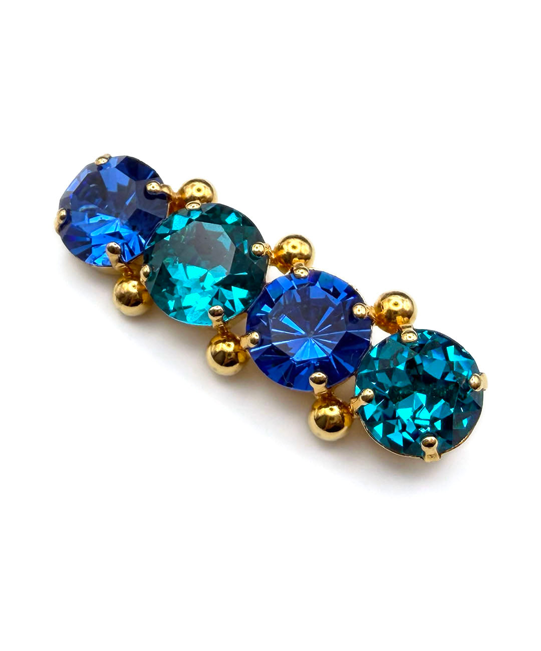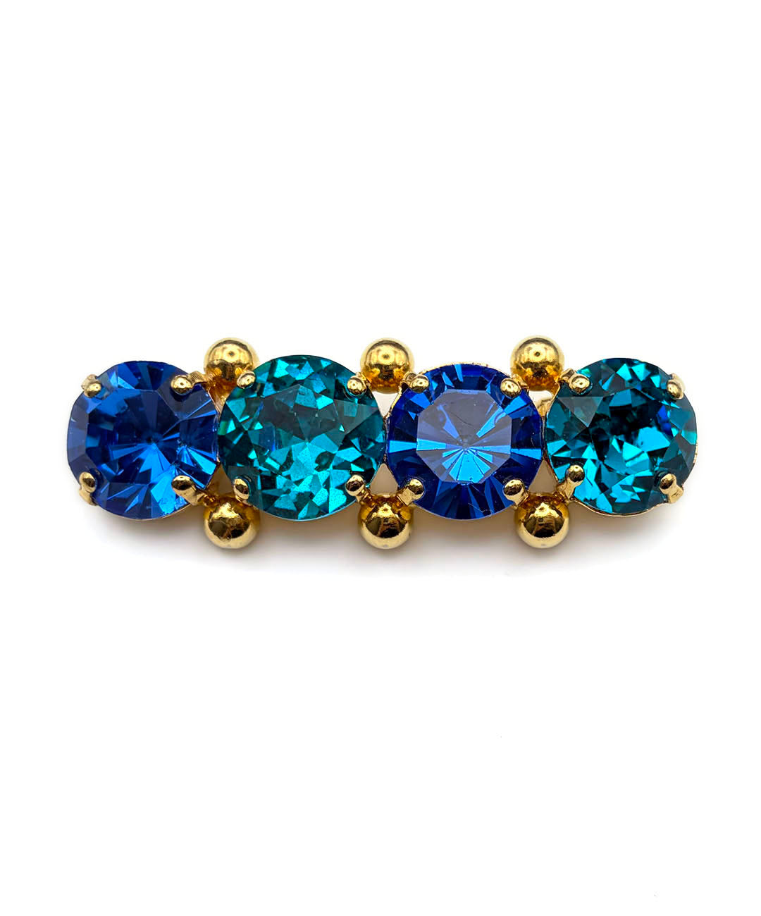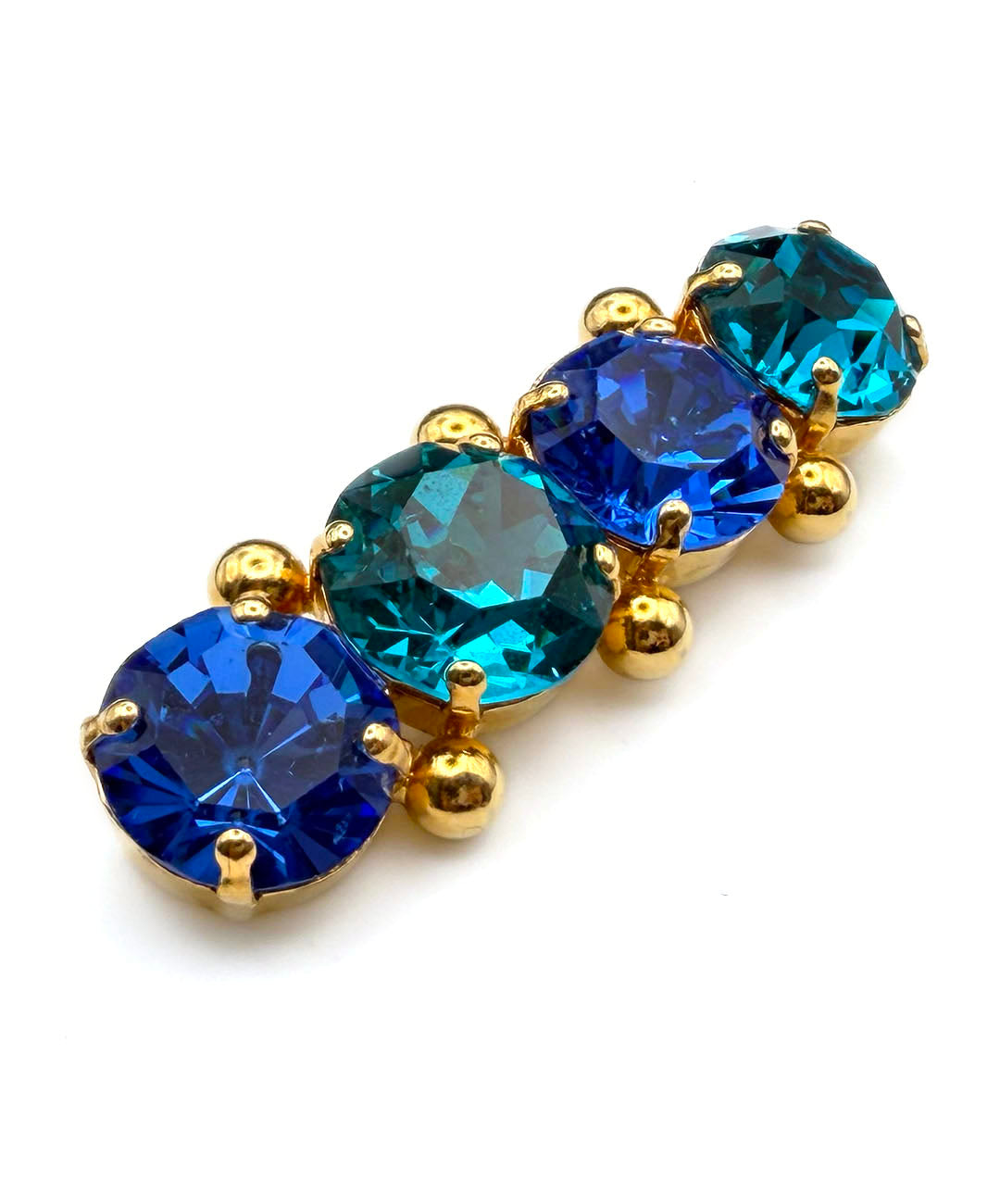 ゴールドトーンメタルにラウンドカットの大ぶりコーンフラワーブルー、ピーコックブルーガラスが爪留めされ、ガラスの間にあしらわれたゴールドの球が艶めくデザイン。