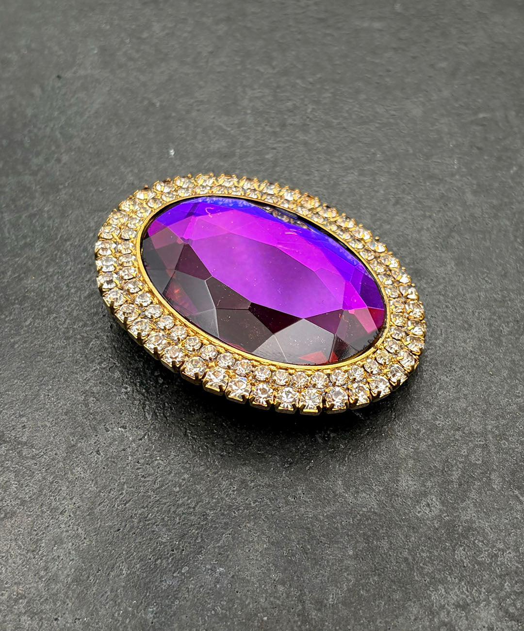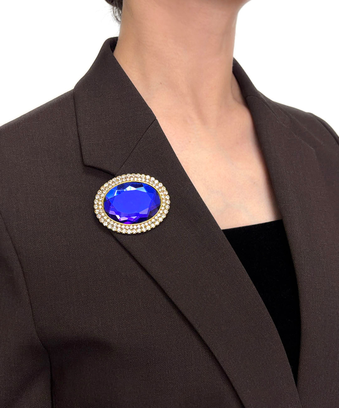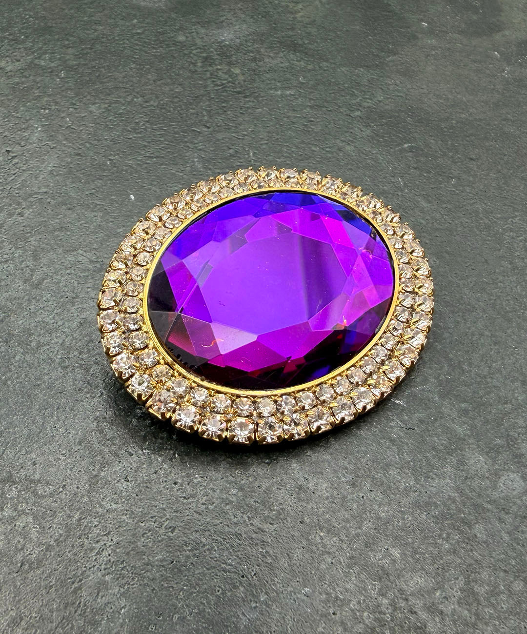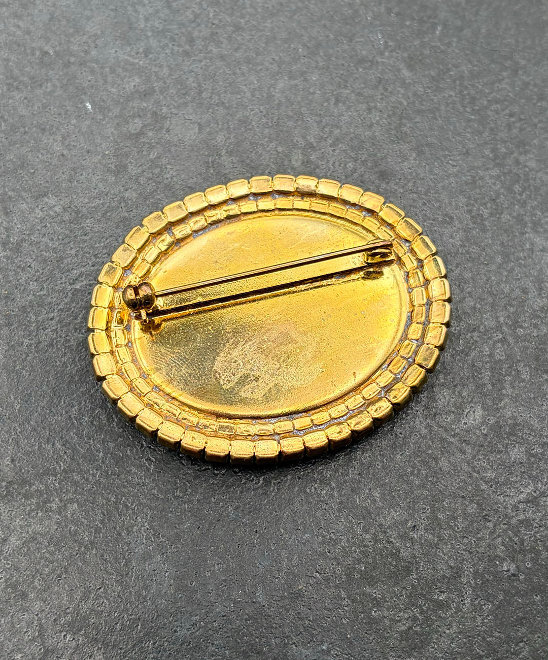 大ぶりのオーバルガラスを、爪留めされたたっぷりのクリスタルが二重に取り巻く、クラシカルで華やかなデザイン。
