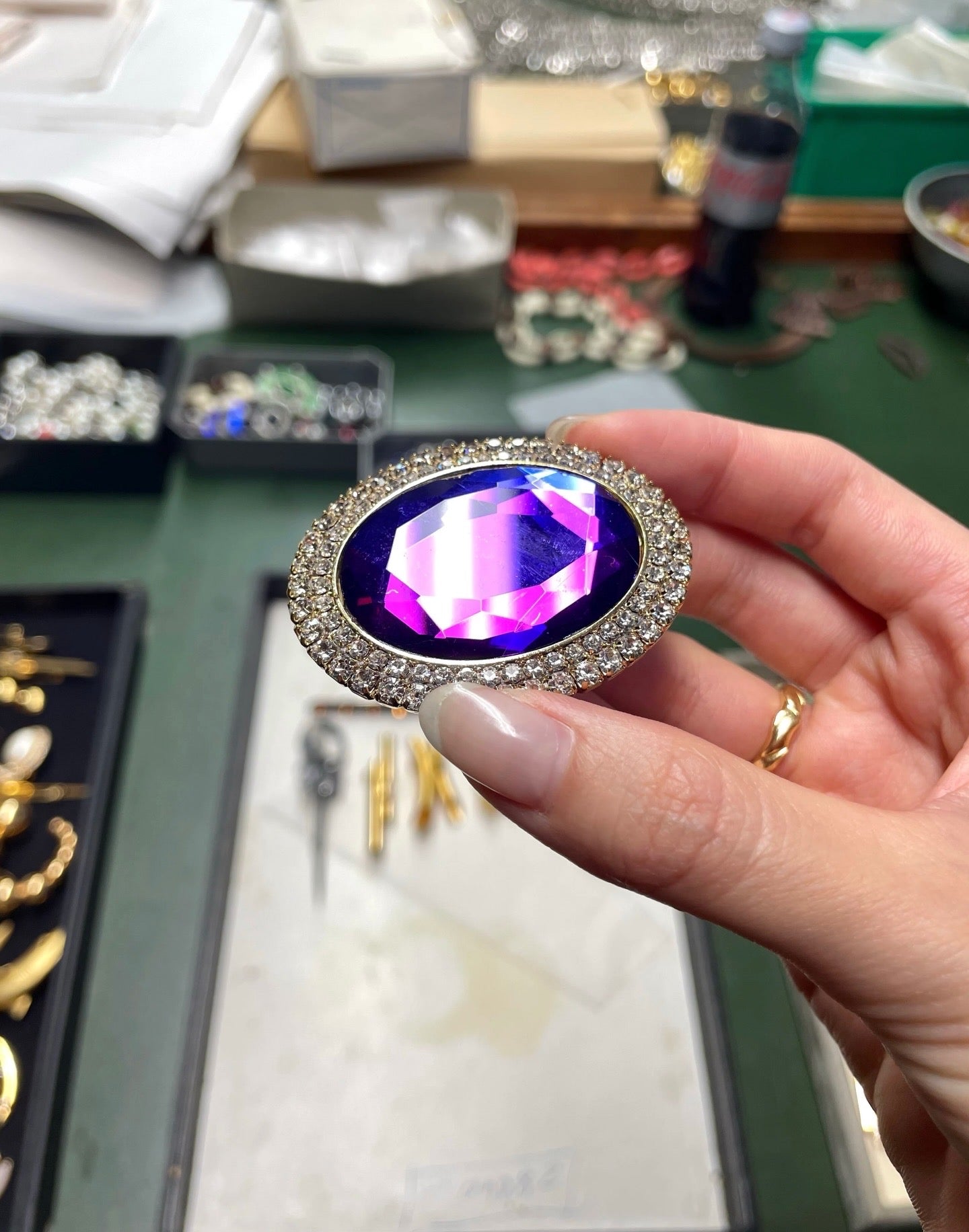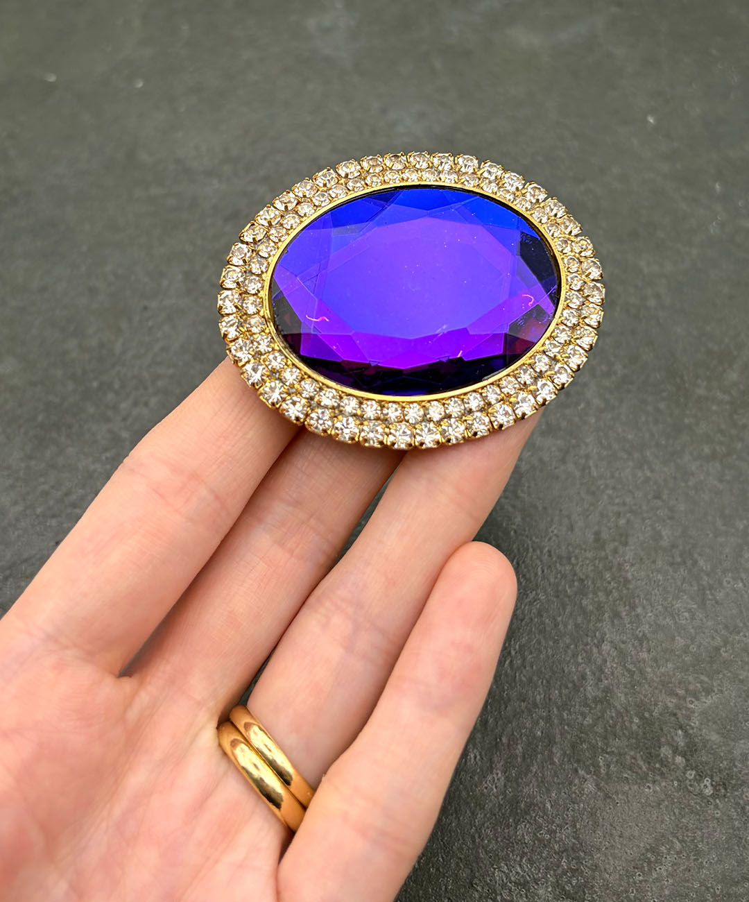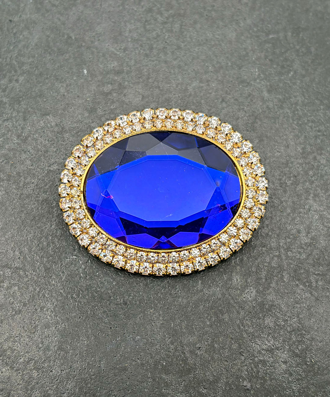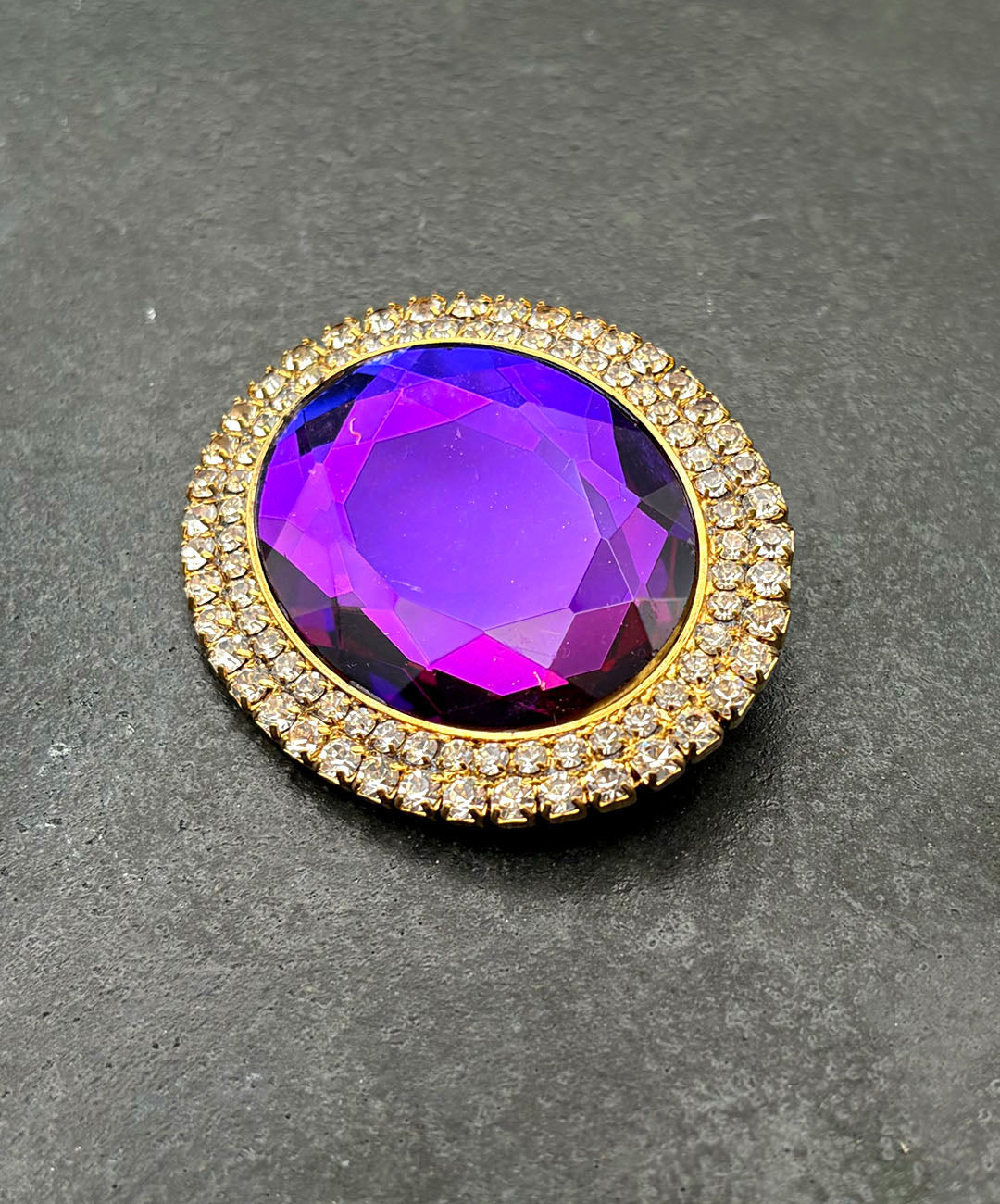 大ぶりのオーバルガラスを、爪留めされたたっぷりのクリスタルが二重に取り巻く、クラシカルで華やかなデザイン。