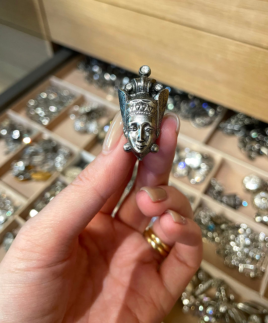 ダークなシルバートーンメタルで女神のようなフェイスモチーフが形作られた、オリエンタルなムード漂うデザイン。