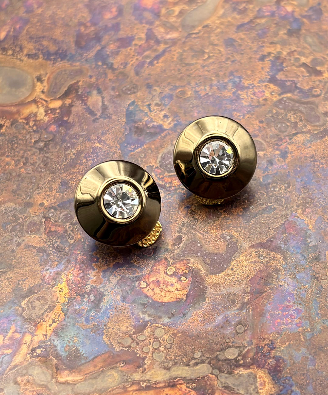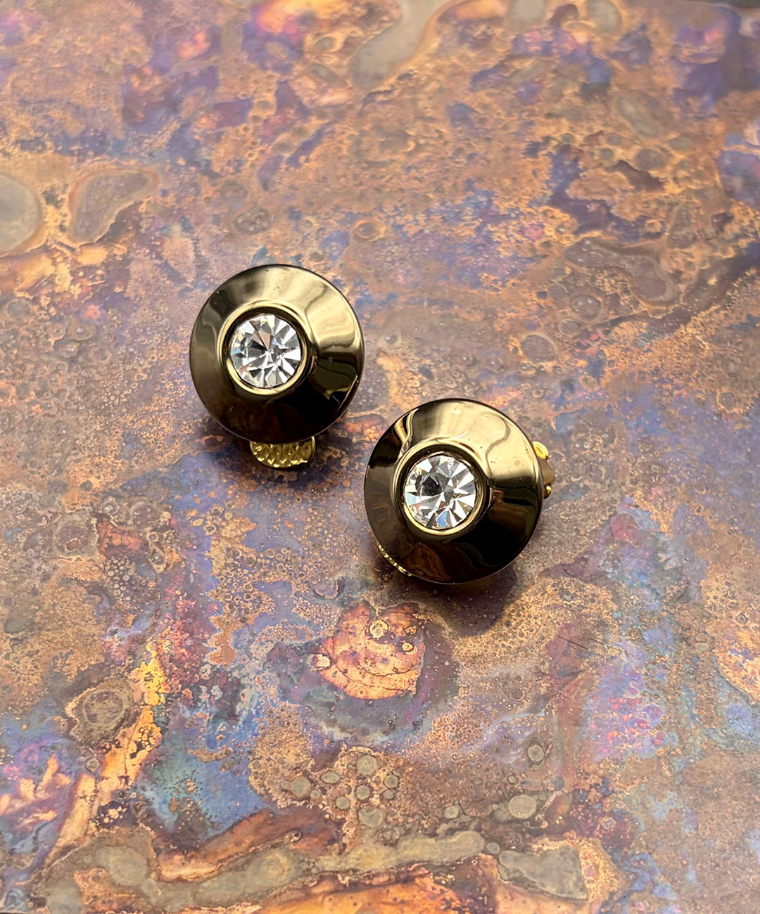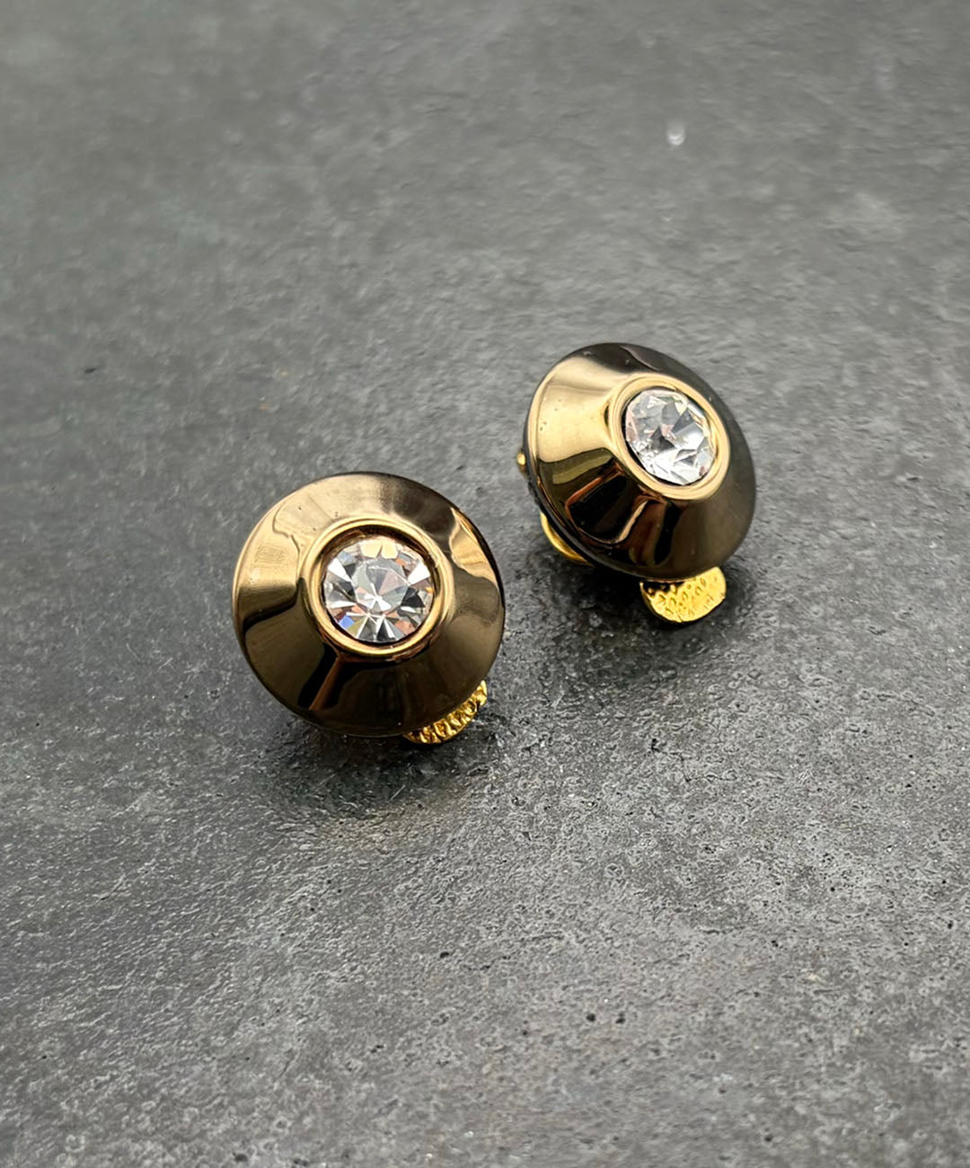 ブロンズトーンのメタルに、ラウンドカットのクリスタルが一石あしらわれたデザイン。